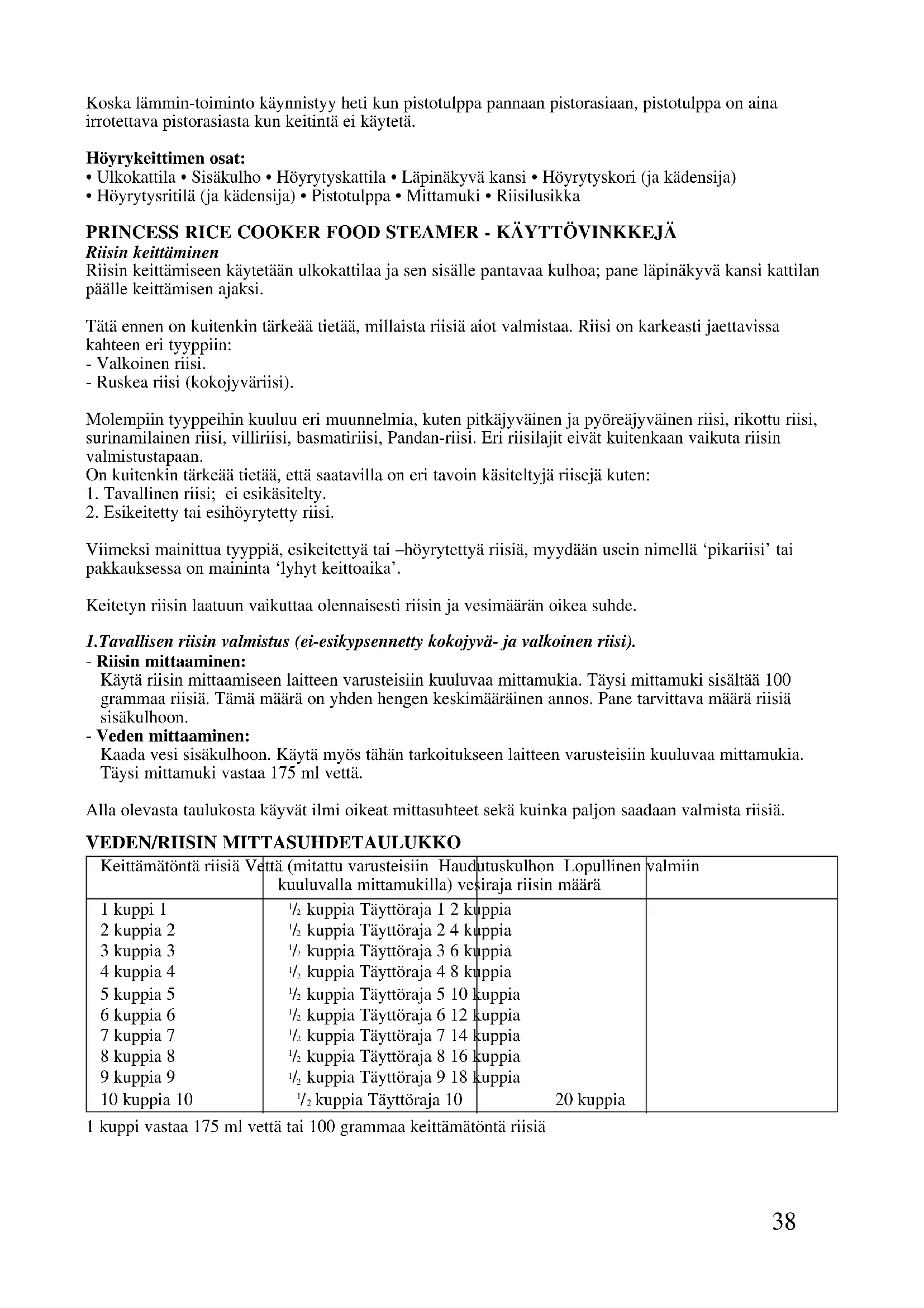 kuppia Täyttöraja 10 20 kuppia39 - Liitä pistotulppa pistorasiaan ja kytke keitin toimintaan painamalla käyttökytkin ‘cook’-asentoon. - Jonkin ajan kuluttua keitin kytkeytyy automaattisesti 'warm'-toiminnolle. Anna riisin vielä hautua tässä asennossa 5-10 minuuttia kansi kiinni, jotta riisi kypsyy lopullisesti. Muutamia ‘riisivinkkejä’: - Riisin voi pestä ennen valmistusta. Pesty riisi tarttuu vähemmän kulhoon, mutta menettää samalla jonkin verran ravintoarvostaan. - Jos riisi tarttuu kulhon pintaan (joillakin riisilajeilla tätä on lähes mahdoton estää), voit öljytä sisäkulhon kevyesti esim. salaatinkastikeöljyllä, oliiviöljyllä tai muulla kasvisöljyllä. - Saat riisistä pehmeämpää liottamalla keittämätöntä riisiä 5-10 minuuttia sisäkulhossa ennen kuin kytket riisinkeittimen toimintaan. 2.Esikypsennetyn riisin (pikariisin) valmistus. Valmistustapa on sama kuin tavallisella riisillä, mutta veden ja riisin määrä ei ole sama. Tähän ei ole olemassa nyrkkisääntöä, koska eri valmistajat käyttävät eri esikypsennysaikaa ja –tapaa. Sen vuoksi sinun tulee noudattaa riisin pakkauksessa annettuja ohjeita veden ja riisin määrästä. Toimi tämän jälkeen seuraavasti: - Pane sisäkulhoon tarvittava määrä vettä ja kytke keitin 'cook'-toiminnolle. Kun vesi kiehuu, lisää riisi. - Anna riisin kiehua pakkauksessa mainitun ajan. Katkaise sen jälkeen keittimen virta irrottamalla pistotulppa pistorasiasta. - Toimi sen jälkeen pakkauksen ohjeiden mukaisesti. Useimmiten riisin on vielä annettava hautua noin 15 minuuttia, joskus kansi kiinni, minkä jälkeen ylimääräinen vesi kaadetaan pois. Höyryttäminen (koskee ainoastaan höyrytyskattilalla varustettua Rice Cooker Food Steamer -höyrykeitintä) Höyryttämällä voidaan kypsentää vihanneksia, lihaa, kalaa ja lintuja. Tällä menetelmällä ruuan ravintoaineet säilyvät paremmin kuin muita valmistustapoja käytettäessä. Höyrykypsennyksessä pannaan höyrytyskattila sisäkulhon päälle. Läpinäkyvä kansi sopii höyrytyskattilan päälle. Pane ruoka-aineet höyrytyskattilaan. Kaada sopiva määrä vettä sisäkulhoon höyryn muodostamiseksi. Käynnistä laite painikkeella (‘cook’-toiminto). Alla olevasta taulukosta käy ilmi tarvittava vesimäärä sekä (likimääräinen) valmistusaika. Vesimäärä mitataan muovikupilla/mittamukilla.