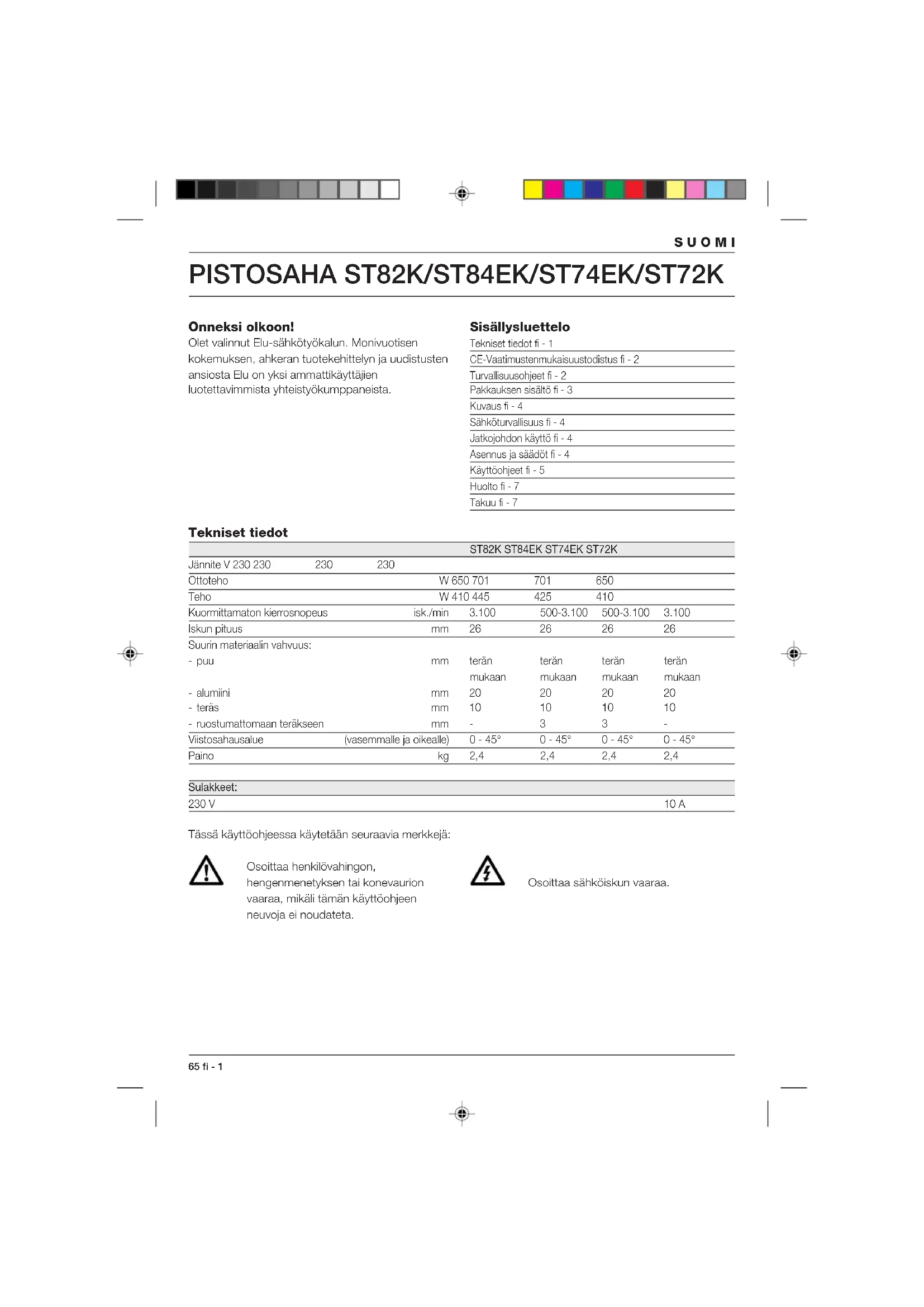 - Se apresente prova da data de compra.SUOMI 65 fi - 1 PISTOSAHA ST82K/ST84EK/ST74EK/ST72K Onneksi olkoon! Olet valinnut Elu-sähkötyökalun. Monivuotisen kokemuksen, ahkeran tuotekehittelyn ja uudistusten ansiosta Elu on yksi ammattikäyttäjien luotettavimmista yhteistyökumppaneista. Sisällysluettelo Tekniset tiedot fi - 1 CE-Vaatimustenmukaisuustodistus fi - 2 Turvallisuusohjeet fi - 2 Pakkauksen sisältö fi - 3 Kuvaus fi - 4 Sähköturvallisuus fi - 4 Jatkojohdon käyttö fi - 4 Asennus ja säädöt fi - 4 Käyttöohjeet fi - 5 Huolto fi - 7 Takuu fi - 7 Tekniset tiedot ST82K ST84EK ST74EK ST72K Jännite V 230 230 230 230 Ottoteho W 650 701 701 650 Teho W 410 445 425 410 Kuormittamaton kierrosnopeus isk./min 3.100 500-3.100 500-3.100 3.100 Iskun pituus mm 26 26 26 26 Suurin materiaalin vahvuus: - puu mm terän terän terän terän mukaan mukaan mukaan mukaan - alumiini mm 20 20 20 20 - teräs mm 10 10 10 10 - ruostumattomaan teräkseen mm - 3 3 - Viistosahausalue (vasemmalle ja oikealle) 0 - 45° 0 - 45° 0 - 45° 0 - 45° Paino kg 2,4 2,4 2,4 2,4 Sulakkeet: 230 V 10 A Tässä käyttöohjeessa käytetään seuraavia merkkejä: Osoittaa henkilövahingon, hengenmenetyksen tai konevaurion vaaraa, mikäli tämän käyttöohjeen neuvoja ei noudateta. Osoittaa sähköiskun vaaraa.fi - 2 66 SUOMI CE-Vaatimustenmukaisuustodistus ST82K/ST84EK/ST74EK/ST72K Elu vakuuttaa, että sähkökoneet on valmistettu Euroopan Unionin standardien 98/37/EEC, 89/336/EEC, 73/23/EEC, EN 50144, EN 55014-2, EN 55014, EN 61000-3-2 ja EN 61000-3-3 mukaisesti. Lisätietoja saat Elulta allaolevasta osoitteesta tai käsikirjan takakannesta. Äänenpainetaso on Euroopan Unionin standardien 86/188/EEC ja 98/37/EEC mukainen, mitattu EN 50144:n mukaisesti: ST82K ST84EK ST74EK ST72K