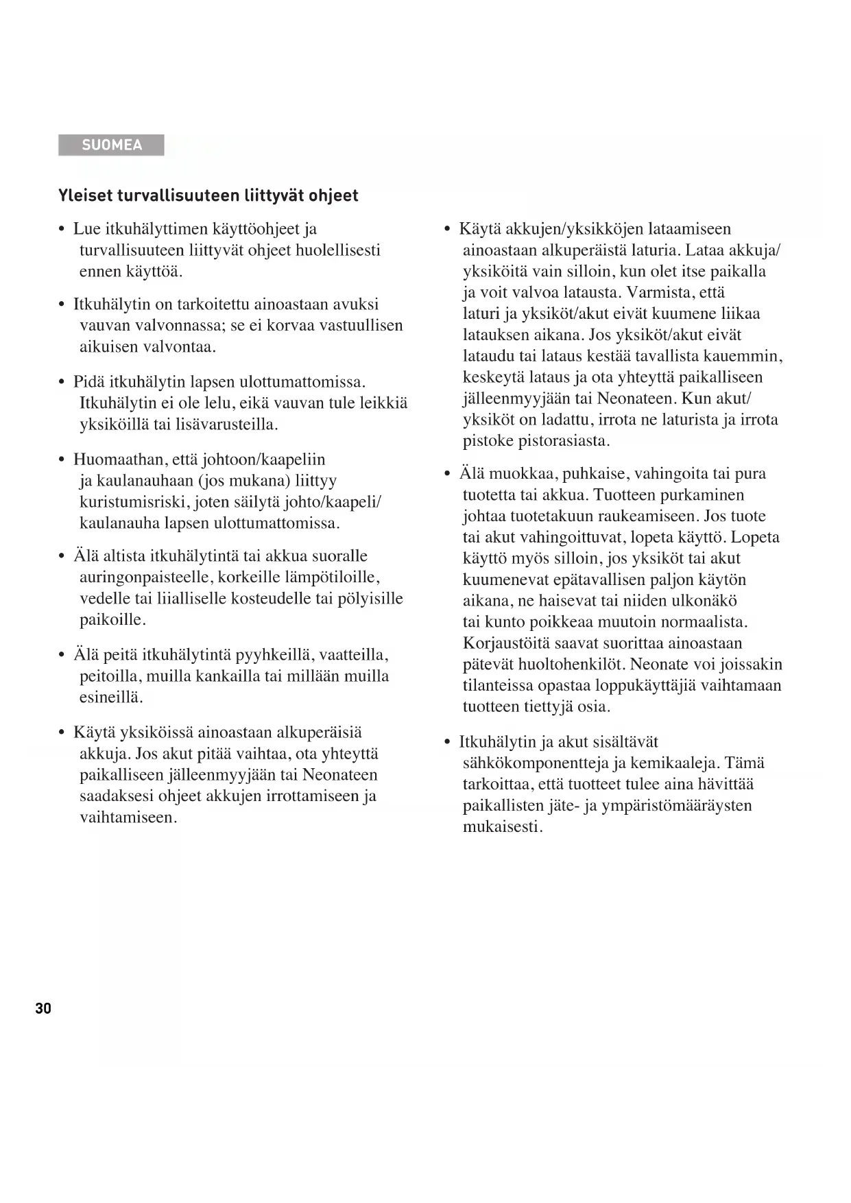 - Käytä yksiköissä ainoastaan alkuperäisiä akkuja. Jos akut pitää vaihtaa, ota yhteyttä paikalliseen jälleenmyyjään tai Neonateen saadaksesi ohjeet akkujen irrottamiseen ja vaihtamiseen.