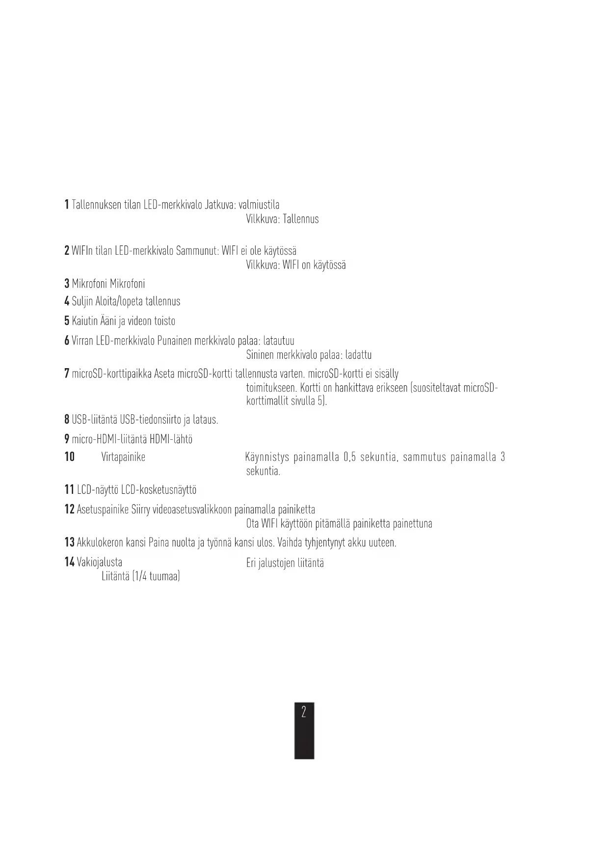 Perustiedot 11 Tallennuksen tilan LED-merkkivalo Jatkuva: valmiustila Vilkkuva: Tallennus 2 WIFIn tilan LED-merkkivalo Sammunut: WIFI ei ole käytössä Vilkkuva: WIFI on käytössä 3 Mikrofoni Mikrofoni 4 Suljin Aloita/lopeta tallennus 5 Kaiutin Ääni ja videon toisto 6 Virran LED-merkkivalo Punainen merkkivalo palaa: latautuu Sininen merkkivalo palaa: ladattu 7 microSD-korttipaikka Aseta microSD-kortti tallennusta varten. microSD-kortti ei sisälly toimitukseen. Kortti on hankittava erikseen (suositeltavat microSD- korttimallit sivulla 5). 8 USB-liitäntä USB-tiedonsiirto ja lataus. 9 micro-HDMI-liitäntä HDMI-lähtö 10 Virtapainike Käynnistys painamalla 0,5 sekuntia, sammutus painamalla 3 sekuntia. 11 LCD-näyttö LCD-kosketusnäyttö 12 Asetuspainike Siirry videoasetusvalikkoon painamalla painiketta Ota WIFI käyttöön pitämällä painiketta painettuna 13 Akkulokeron kansi Paina nuolta ja työnnä kansi ulos. Vaihda tyhjentynyt akku uuteen. 14 Vakiojalusta Liitäntä (1/4 tuumaa) Eri jalustojen liitäntä 2Näytön esittely 00:00:00|02:00:00 4K/30/ Wide