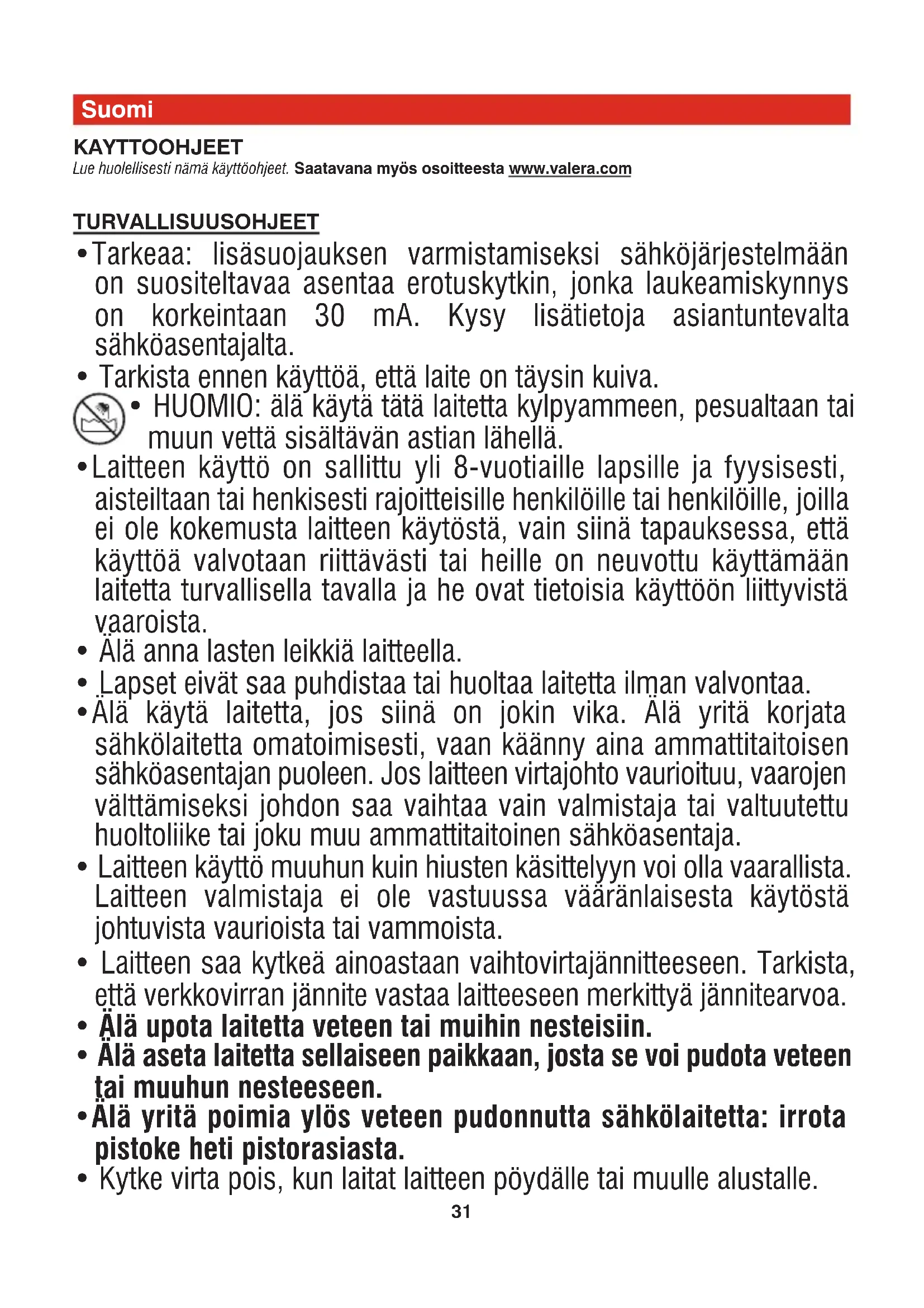 - Älä yritä poimia ylös veteen pudonnutta sähkölaitetta: irrota pistoke heti pistorasiasta.