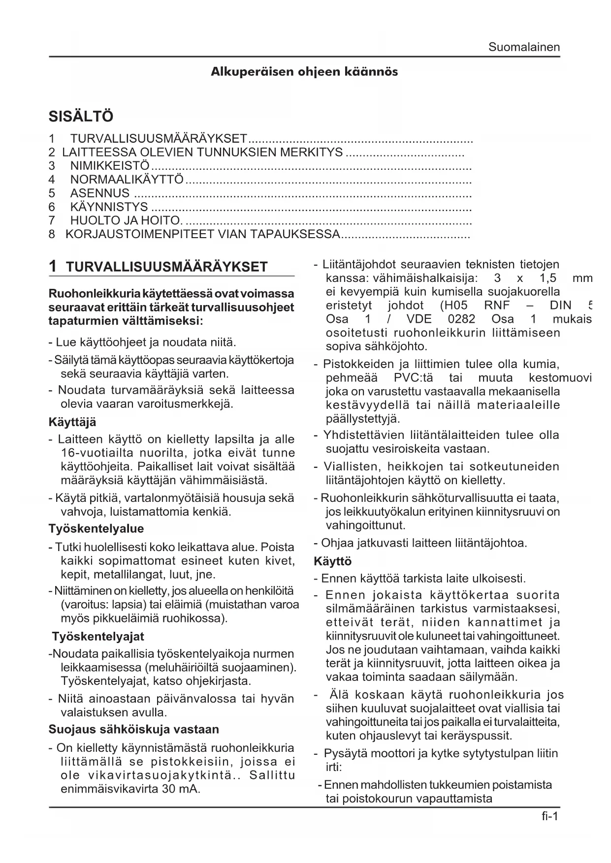 Ruohonleikkuria käytettäessä ovat voimassa seuraavat erittäin tärkeät turvallisuusohjeet tapaturmien välttämiseksi: - Lue käyttöohjeet ja noudata niitä. - Säilytä tämä käyttöopas seuraavia käyttökertoja sekä seuraavia käyttäjiä varten. - Noudata turvamääräyksiä sekä laitteessa olevia vaaran varoitusmerkkejä. Käyttäjä - Laitteen käyttö on kielletty lapsilta ja alle 16-vuotiailta nuorilta, jotka eivät tunne käyttöohjeita. Paikalliset lait voivat sisältää määräyksiä käyttäjän vähimmäisiästä. - Käytä pitkiä, vartalonmyötäisiä housuja sekä vahvoja, luistamattomia kenkiä. Työskentelyalue - Tutki huolellisesti koko leikattava alue. Poista kaikki sopimattomat esineet kuten kivet, kepit, metallilangat, luut, jne. - Niittäminen on kielletty, jos alueella on henkilöitä (varoitus:lapsia)taieläimiä(muistathanvaroa myöspikkueläimiäruohikossa). Työskentelyajat -Noudata paikallisia työskentelyaikoja nurmen leikkaamisessa(meluhäiriöiltäsuojaaminen). Työskentelyajat, katso ohjekirjasta. - Niitä ainoastaan päivänvalossa tai hyvän valaistuksen avulla. Suojaus sähköiskuja vastaan - On kielletty käynnistämästä ruohonleikkuria liittämällä se pistokkeisiin, joissa ei ole vikavirtasuojakytkintä.. Sallittu enimmäisvikavirta30mA. - Liitäntäjohdot seuraavien teknisten tietojen kanssa:vähimäishalkaisija: 3 x 1,5 mm², ei kevyempiä kuin kumisella suojakuorella eristetyt johdot (H05 RNF – DIN 57282 Osa 1 / VDE 0282 Osa 1 mukaisesti) tai osoitetusti ruohonleikkurin liittämiseen sopiva sähköjohto. - Pistokkeiden ja liittimien tulee olla kumia, pehmeää PVC:tä tai muuta kestomuovia, joka on varustettu vastaavalla mekaanisella kestävyydellä tai näillä materiaaleille päällystettyjä. - Yhdistettävien liitäntälaitteiden tulee olla suojattu vesiroiskeita vastaan. - Viallisten, heikkojen tai sotkeutuneiden liitäntäjohtojen käyttö on kielletty. - Ruohonleikkurin sähköturvallisuutta ei taata, jos leikkuutyökalun erityinen kiinnitysruuvi on vahingoittunut. - Ohjaa jatkuvasti laitteen liitäntäjohtoa. Käyttö - Ennen käyttöä tarkista laite ulkoisesti. - Ennen jokaista käyttökertaa suorita silmämääräinen tarkistus varmistaaksesi, etteivät terät, niiden kannattimet ja kiinnitysruuvit ole kuluneet tai vahingoittuneet. Jos ne joudutaan vaihtamaan, vaihda kaikki terät ja kiinnitysruuvit, jotta laitteen oikea ja vakaa toiminta saadaan säilymään. - Älä koskaan käytä ruohonleikkuria jos siihen kuuluvat suojalaitteet ovat viallisia tai vahingoittuneita tai jos paikalla ei turvalaitteita, kuten ohjauslevyt tai keräyspussit. - Pysäytä moottori ja kytke sytytystulpan liitin irti: - Ennen mahdollisten tukkeumien poistamista tai poistokourun vapauttamista Suomalainen