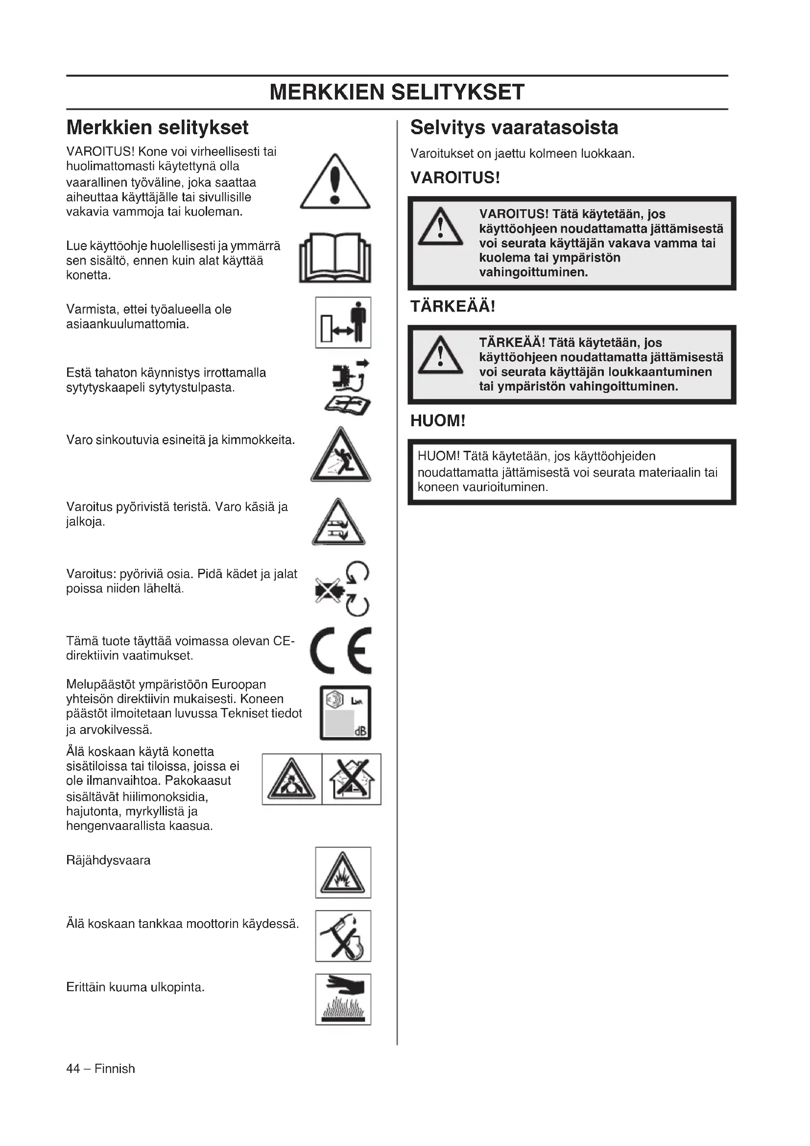 - af den 8. maj 2000 ”angående emission af støj til omgivelserne” 2000/14/EF. Oplysninger om støjemissioner fremgår af kapitlet Tekniske data. Følgende standarder er opfyldt: EN 836, ISO 11094, EN 55012. Udpeget organ: 0404, SMP Svensk Maskinprovning AB, Fyrisborgsgatan 3, SE-754 50 Uppsala, Sverige, har udstedt rapporter vedrørende opfyldelse af bestemmelserne i bilag VI til Rådets direktiv af 8. maj 2000 ”angående støjemission i miljøet” 2000/14/EF. Huskvarna 14. december 2012 Bengt Ahlund, udviklingschef (Autoriseret repræsentant for Husqvarna AB og ansvarlig for teknisk dokumentation.)MERKKIEN SELITYKSET 44 – Finnish Merkkien selitykset VAROITUS! Kone voi virheellisesti tai huolimattomasti käytettynä olla vaarallinen työväline, joka saattaa aiheuttaa käyttäjälle tai sivullisille vakavia vammoja tai kuoleman. Lue käyttöohje huolellisesti ja ymmärrä sen sisältö, ennen kuin alat käyttää konetta. Varmista, ettei työalueella ole asiaankuulumattomia. Estä tahaton käynnistys irrottamalla sytytyskaapeli sytytystulpasta. Varo sinkoutuvia esineitä ja kimmokkeita. Varoitus pyörivistä teristä. Varo käsiä ja jalkoja. Varoitus: pyöriviä osia. Pidä kädet ja jalat poissa niiden läheltä. Tämä tuote täyttää voimassa olevan CE- direktiivin vaatimukset. Melupäästöt ympäristöön Euroopan yhteisön direktiivin mukaisesti. Koneen päästöt ilmoitetaan luvussa Tekniset tiedot ja arvokilvessä. Älä koskaan käytä konetta sisätiloissa tai tiloissa, joissa ei ole ilmanvaihtoa. Pakokaasut sisältävät hiilimonoksidia, hajutonta, myrkyllistä ja hengenvaarallista kaasua. Räjähdysvaara Älä koskaan tankkaa moottorin käydessä. Erittäin kuuma ulkopinta. Selvitys vaaratasoista Varoitukset on jaettu kolmeen luokkaan. VAROITUS! TÄRKEÄÄ! HUOM!