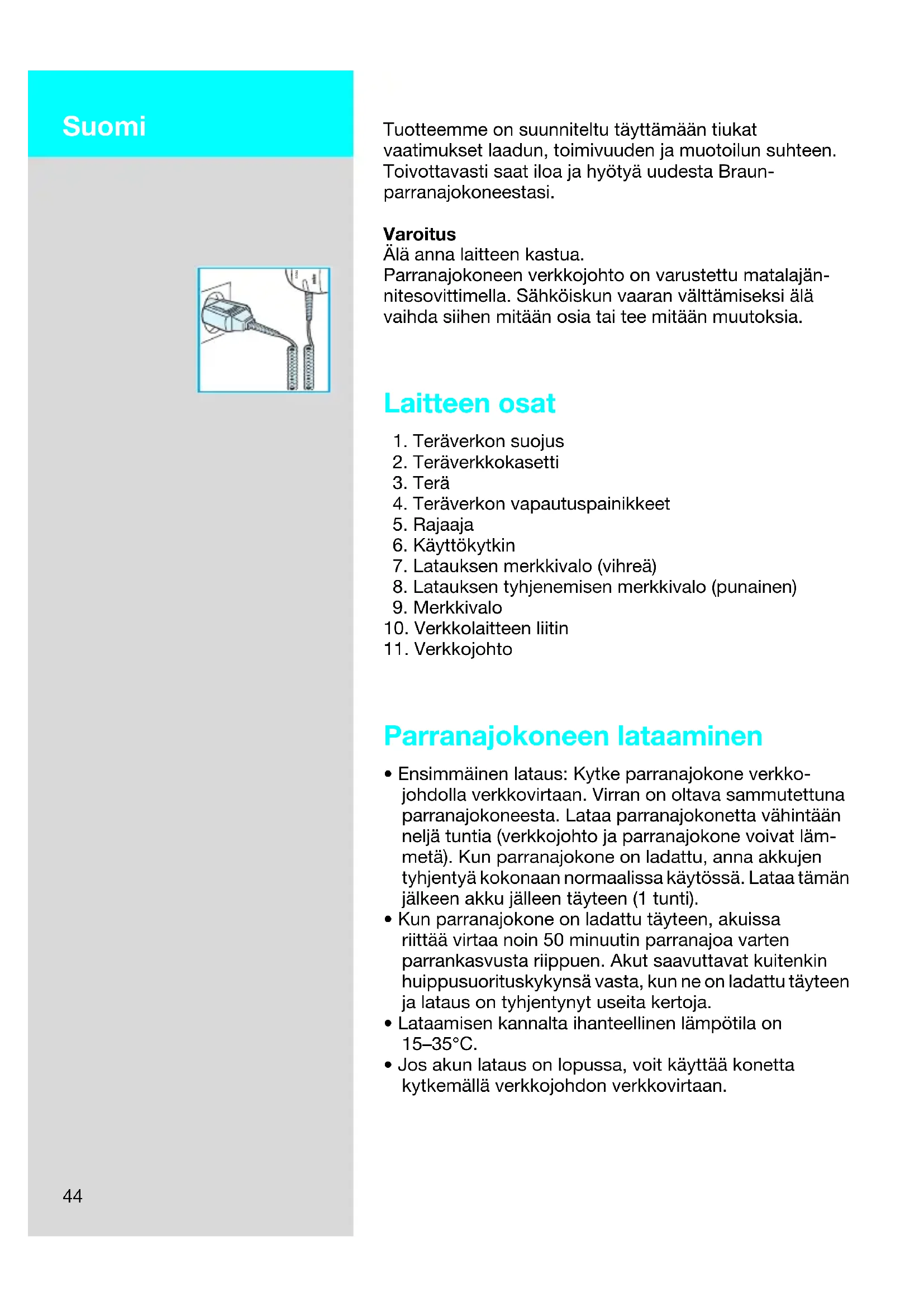5644319_Activator_8588/83_S4_66 Seite 43 Montag, 11. April 2005 11:11 1144 Tuotteemme on suunniteltu täyttämään tiukat vaatimukset laadun, toimivuuden ja muotoilun suhteen. Toivottavasti saat iloa ja hyötyä uudesta Braun- parranajokoneestasi. Varoitus Älä anna laitteen kastua. Parranajokoneen verkkojohto on varustettu matalajän- nitesovittimella. Sähköiskun vaaran välttämiseksi älä vaihda siihen mitään osia tai tee mitään muutoksia. Laitteen osat