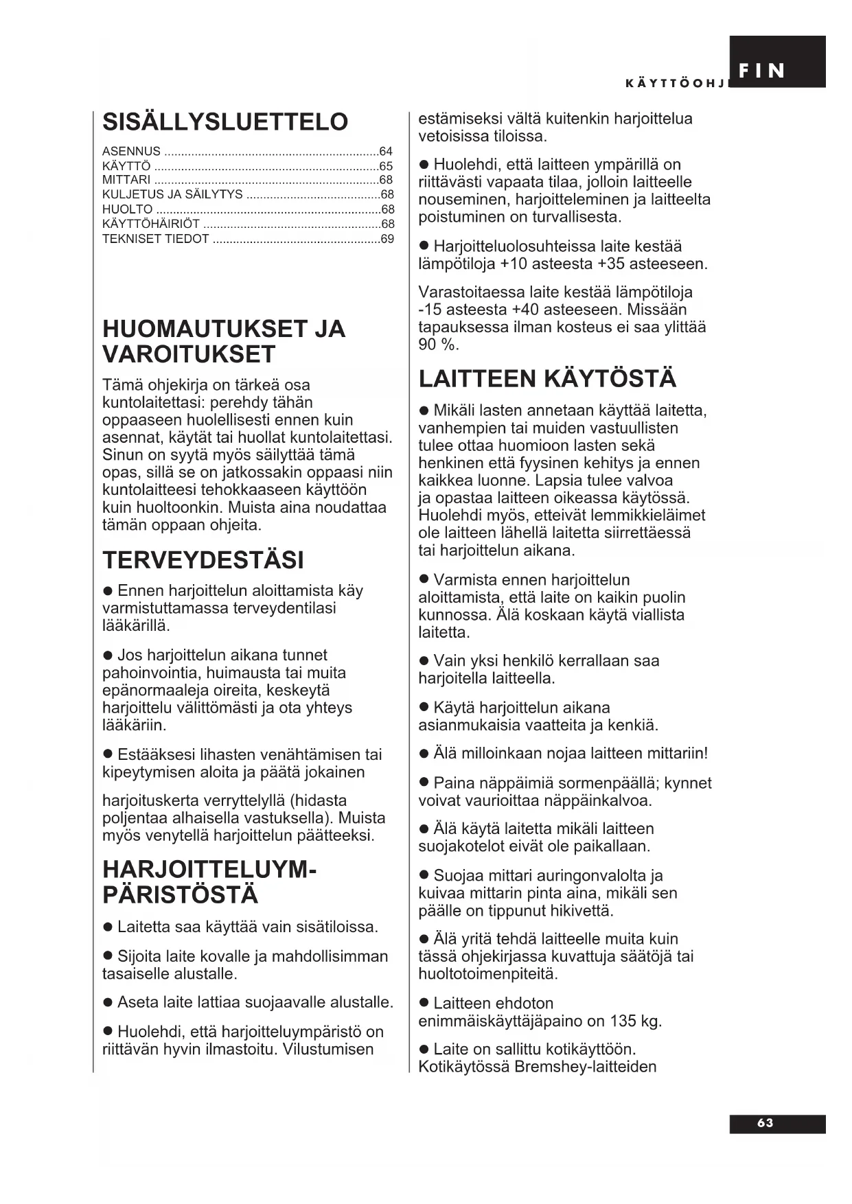 - Jos harjoittelun aikana tunnet pahoinvointia, huimausta tai muita epanormaaleja oireita, keskeytā harjoittelu valittomästi ja ota yhteys laakärin.