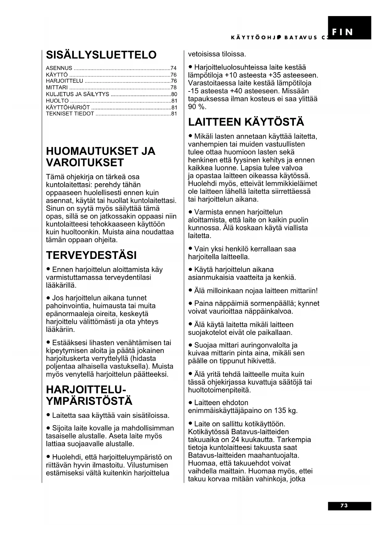 Laite on sallittu kotikayttoon. Kotikaytossa Batavus-laitteiden takuaika on 24 kuukautta. Tarkempia tietoja kuntolaiteesi takuusta saat Batavus-laitteiden maahantuojalta. Huomaa, etta takuuehdot voivat vaihdella maittain. Huomaa myos, ettei takuu korvaa mitaan vahinkoja, jotka