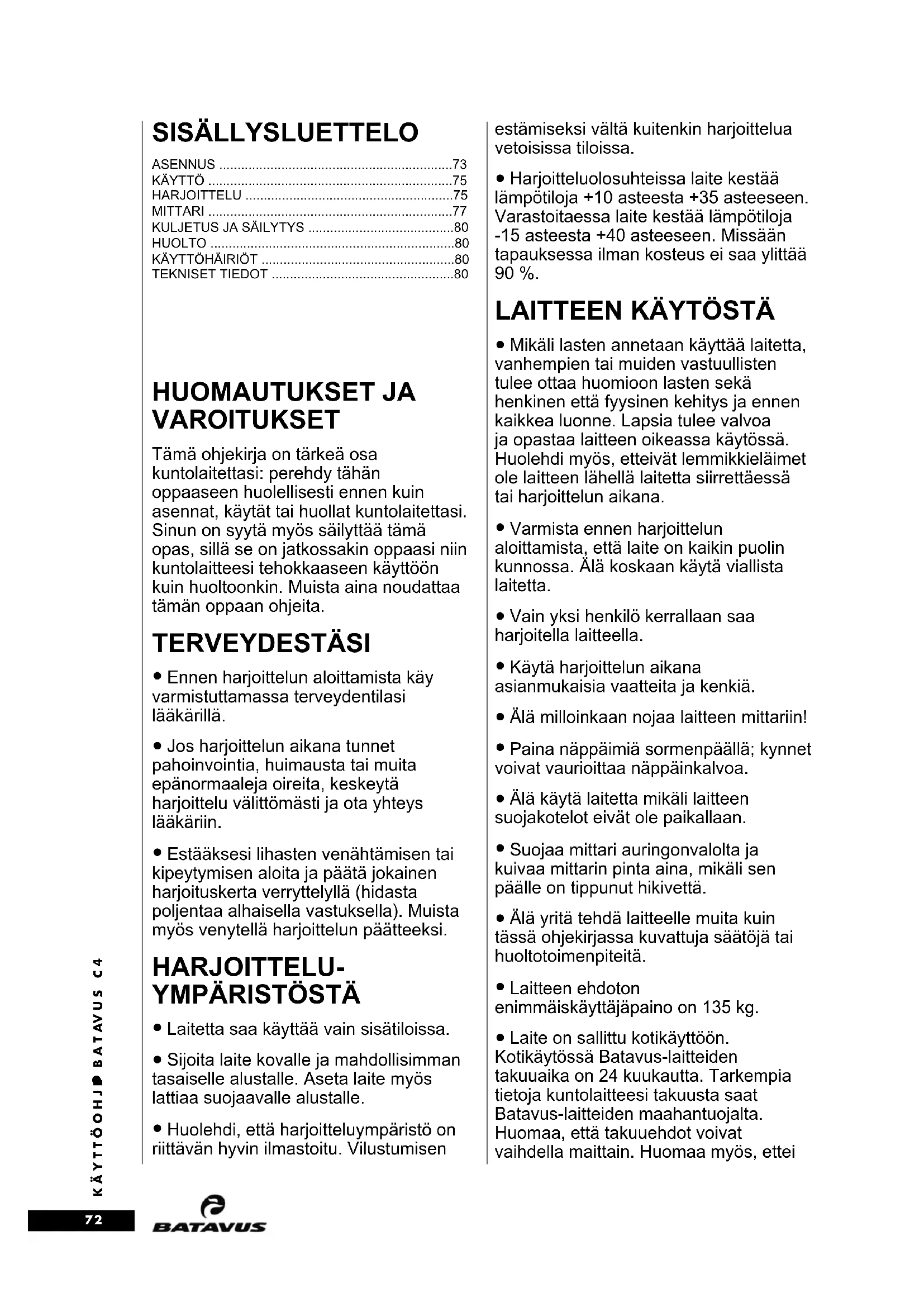- Laite on sallittu kotikäyttöön. Kotikäytössä Batavus-laitteiden takuuaika on 24 kuukautta. Tarkempia tietoja kuntolaitteesi takuusta saat Batavus-laitteiden maahantuojalta. Huomaa, että takuuehdot voivat vaihdella maittain. Huomaa myös, ettei