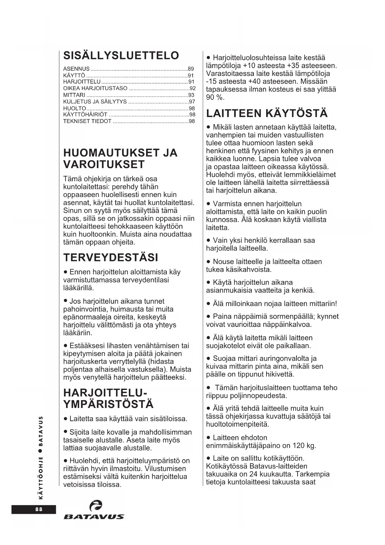 Tämä ohjekirja on tärkeä osa kuntolaitettasi: perehdy tahan oppaaseen huolellisesti ennen kuin asennat, kaytät tai huollat kuntolaitettasi. Sinun on syyta myos sailyttä tämä opas, sillä se on jatkossakin oppaasi niin kuntolaitteesi tehokkaaseen kayttoön kuin huoltoonkin. Muista aina noudattaa tämä oppaan ohjeita.