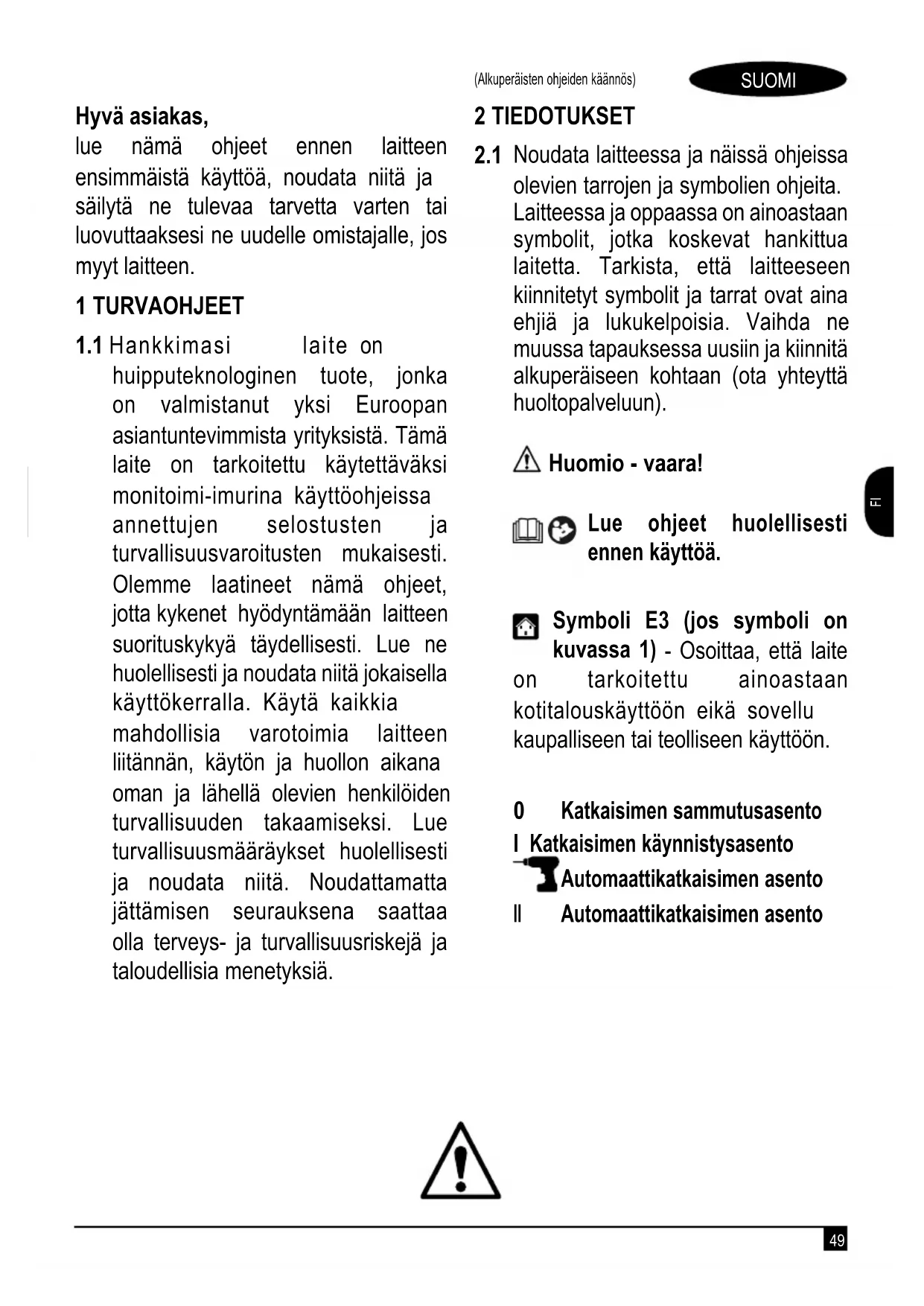 Noudata laitteessa ja näissä ohjeissa olevien tarrojen ja symbolien ohjeita. Laitteessa ja oppaassa on ainoastaan symbolit, jotka koskevat hankittua laitetta. Tarkista, että laitteeseen kiinnitetyt symbolit ja tarrat ovat aina ehjiä ja lukukelpoisia. Vaihda ne muussa tapauksessa uusiin ja kiinnitä alkuperäiseen kohtaan (ota yhteyttä huoltopalveluun). Huomio - vaara! Lue ohjeet huolellisesti ennen käyttöä. Symboli E3 (jos symboli on kuvassa 1) - Osoittaa, että laite on tarkoitettu ainoastaan kotitalouskäyttöön eikä sovellu kaupalliseen tai teolliseen käyttöön.