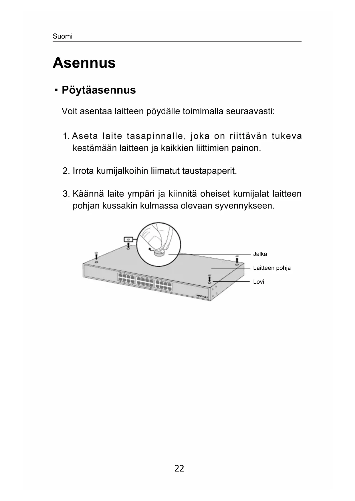 pohjan kussakin kulmassa olevaan syvennykseen. Jalka Laitteen pohja Lovi Suomi23