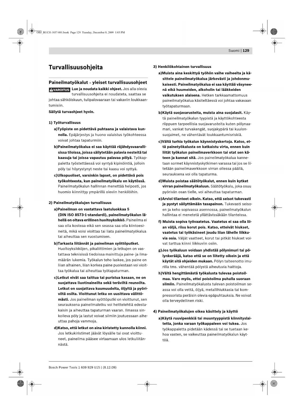 a)Käytä ruuvipenkkiä tai muuntyyppistä kiinnityslai- tetta, jonka varaan työkappaleen voi tukea. Jos työkappaletta pidetään kädessä tai se tuetaan ke- hoa vasten, se vaikeuttaa paineilmatyökalun käyt- töä. VAROITUS OBJ_BUCH-1037-001.book Page 129 Tuesday, December 8, 2009 1:03 PM1 609 929 U15 | (8.12.09) Bosch Power Tools 130 | Suomi b)Paineilmatyökalua ei pidä ylikuormittaa. Valitse työkohteen ja -tehtävän mukaan oikeantyyppinen paineilmatyökalu. Kun paineilmatyökalu on tyypil- tään sopiva, työstö sujuu paremmin ja turvallisem- min halutulla tehoalueella. c)Jos paineilmatyökalun ON-/OFF-kytkin on vioittu- nut, työkalua ei saa käyttää. Paineilmatyökalu, jota ei voi enää kunnolla käynnistää ja pysäyttää, on vaa- rallinen, se on kunnostettava välittömästi. d)Katkaise paineilman syöttö, ennen kuin muutat työkalun säätöjä, vaihdat lisävarusteita tai lasket työkalun pois käsistä. Näin estät paineilmatyökalun käynnistymisen vahingossa. e)Paineilmatyökalut on säilytettävä paikassa, jossa lapset eivät pääse niihin käsiksi. Paineilmatyöka- lua ei pidä antaa sellaisen henkilön käyttöön, joka ei ole perehtynyt työkalutoimintoihin ja käyttöoh- jeeseen. Paineilmatyökalut ovat vaaraksi, jos niitä käyttää kokematon henkilö. f) Paineilmatyökalua on hoidettava huolella. Tarkas- ta, että työkalun liikkuvat osat toimivat kunnolla eivätkä pääse juuttumaan, katso myös, ettei mi- kään osa ole murtunut tai vioittunut niin, että se haittaa työkalun toimintaa. Anna kunnostaa vioit- tuneet osat, ennen kuin otat paineilmatyökalun taas käyttöön. Moni työtapaturma johtuu siitä, että paineilmatyökalu on jäänyt huoltamatta. g)Käytä paineilmatyökalussa ainoastaan tässä oh- jeessa mainittuja lisävarusteita, vaihtotyökaluja ja muita osia. Muista samalla ottaa huomioon työolo- suhteet sekä tehtävän työn laatu. Jos paineilmatyö- kalua käytetään muuhun kuin sille suunniteltuun tar- koitukseen, siitä koituu ilmeinen vaara.