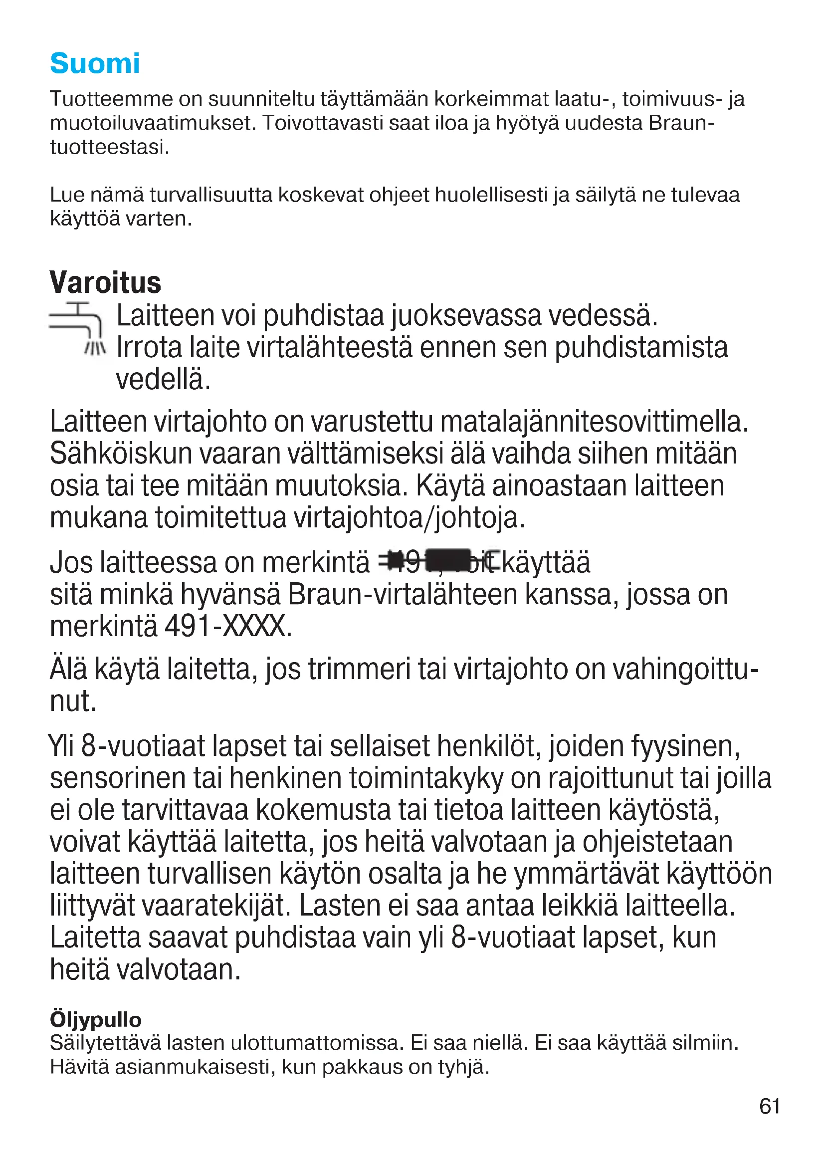 - Låt apparaten stå med öppen trimmer för att torka. Hålla apparaten i topptrim För att saxen ska fungera korrekt ska den smörjas med symaskinsolja efter varje användning (i). Vårda batterierna För att de laddningsbara batterierna ska behålla maximal kapacitet måste apparaten laddas ur helt (genom trimning/klippning) ungefär var sjätte månad. Ladda sedan apparaten till full kapacitet. 97355726_BT_5090-5010_MN-ANZ_S6-80.indd 5997355726_BT_5090-5010_MN-ANZ_S6-80.indd 59 16.06.15 15:4516.06.15 15:45 CSS APPROVED Effective Date 18Jun2015 GMT - Printed 29Sep2015 Page 58 of 7960 Miljöskyddsmeddelande Produkten innehåller batterier och/eller återvinningsbart elavfall. Av hänsyn till miljön ska denna apparat inte slängas med hushålls- avfallet. Återvinning bör ske enligt gällande lokala föreskrifter. Med förbehåll för ändringar. För elektriska specifikationer, se texten på specialsladden. Garanti Vi garanterar denna produkt för två år från och med inköpsdatum. Under garantitiden kommer vi utan kostnad att avhjälpa alla brister i apparaten som är hänförbara till fel i material eller utförande, genom att antingen reparera eller byta ut hela apparaten efter eget gottfinnande. Denna garanti gäller i alla länder där denna apparat levereras av Braun eller deras auktoriserade återförsäljare. Garantin gäller ej: skada på grund av felaktig användning eller normalt slitage, liksom brister som har en försumbar inverkan på apparatens värde eller funktion. Garantin upphör att gälla om reparationer utförs av icke behörig person eller om Brauns originaldelar inte används. För att erhålla service under garantitiden ska den kompletta apparaten lämnas in tillsammans med inköpskvittot till en auktoriserad Braun-verkstad: www.service.braun.com. Ring 020-21 33 21 för information om närmaste Braun-verkstad. 97355726_BT_5090-5010_MN-ANZ_S6-80.indd 6097355726_BT_5090-5010_MN-ANZ_S6-80.indd 60 16.06.15 15:4516.06.15 15:45 CSS APPROVED Effective Date 18Jun2015 GMT - Printed 29Sep2015 Page 59 of 7961 Suomi Tuotteemme on suunniteltu täyttämään korkeimmat laatu-, toimivuus- ja muotoiluvaatimukset. Toivottavasti saat iloa ja hyötyä uudesta Braun- tuotteestasi. Lue nämä turvallisuutta koskevat ohjeet huolellisesti ja säilytä ne tulevaa käyttöä varten. Varoitus Laitteen voi puhdistaa juoksevassa vedessä. Irrota laite virtalähteestä ennen sen puhdistamista vedellä. Laitteen virtajohto on varustettu matalajännitesovittimella. Sähköiskun vaaran välttämiseksi älä vaihda siihen mitään osia tai tee mitään muutoksia. Käytä ainoastaan laitteen mukana toimitettua virtajohtoa/johtoja. Jos laitteessa on merkintä 491, voit käyttää sitä minkä hyvänsä Braun-virtalähteen kanssa, jossa on merkintä 491-XXXX. Älä käytä laitetta, jos trimmeri tai virtajohto on vahingoittu- nut. Yli 8-vuotiaat lapset tai sellaiset henkilöt, joiden fyysinen, sensorinen tai henkinen toimintakyky on rajoittunut tai joilla ei ole tarvittavaa kokemusta tai tietoa laitteen käytöstä, voivat käyttää laitetta, jos heitä valvotaan ja ohjeistetaan laitteen turvallisen käytön osalta ja he ymmärtävät käyttöön liittyvät vaaratekijät. Lasten ei saa antaa leikkiä laitteella. Laitetta saavat puhdistaa vain yli 8-vuotiaat lapset, kun heitä valvotaan. Öljypullo Säilytettävä lasten ulottumattomissa. Ei saa niellä. Ei saa käyttää silmiin. Hävitä asianmukaisesti, kun pakkaus on tyhjä. 97355726_BT_5090-5010_MN-ANZ_S6-80.indd 6197355726_BT_5090-5010_MN-ANZ_S6-80.indd 61 16.06.15 15:4516.06.15 15:45 CSS APPROVED Effective Date 18Jun2015 GMT - Printed 29Sep2015 Page 60 of 7962 Laitteen osat 1a Tarkkuuskampa parran ja lyhyiden karvojen trimmaamiseen 1b Hiuskampa hiustenleikkaukseen * 1c Kamman vapautuspainikkeet 2 Leveä trimmeri (32 mm) 3 Tarkkuustrimmeri (16 mm) * 4 Tarkkuustrimmerin vapautuspainike * 5 Latauksen merkkivalo 6a Tarkan kamman lukkokytkin 6b Tarkan kamman pituuden valitsin 6c Hiuskamman pituuden valitsin 7 Virtakytkin 8 Virtajohto (vaihtelee mallista riippuen) 8a Latausteline * 9 Säilytyspussi *