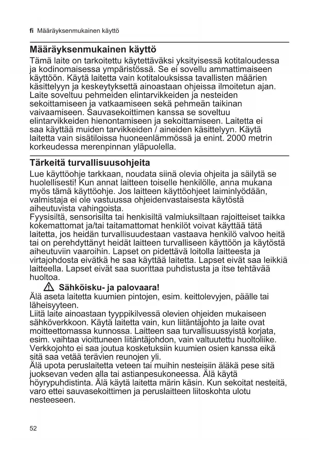 Kassera förpackningen på ett miljövänligt sätt. Denna enhet är märkt i enlighet med der europeiska direktivet 2012/19/EU om avfall som utgörs av eller innehåller elektro niska produkter (waste electrical and electronic equipment – WEEE). Direktivet anger ramarna för inom EU giltigt återtagande och korrekt återvinning av uttjänta enheter. Kontakta din fackhandel om du vill ha ytterligare information. Konsumentbestämmelser I Sverige gäller av EHL antagna konsument bestämmelser. Den fullständiga texten fi nns hos din handlare. Spar kvittot. Rätt till ändringar förbehålls.52 Määräyksenmukainen käyttö Määräyksenmukainen käyttö Tämä laite on tarkoitettu käytettäväksi yksityisessä kotitaloudessa ja kodinomaisessa ympäristössä. Se ei sovellu ammattimaiseen käyttöön. Käytä laitetta vain kotitalouksissa tavallisten määrien käsittelyyn ja keskeytyksettä ainoastaan ohjeissa ilmoitetun ajan. Laite soveltuu pehmeiden elintarvikkeiden ja nesteiden sekoittamiseen ja vatkaamiseen sekä pehmeän taikinan vaivaamiseen. Sauvasekoittimen kanssa se soveltuu elintarvikkeiden hienontamiseen ja sekoittamiseen. Laitetta ei saa käyttää muiden tarvikkeiden / aineiden käsittelyyn. Käytä laitetta vain sisätiloissa huoneenlämmössä ja enint. 2000 metrin korkeudessa merenpinnan yläpuolella. Tärkeitä turvallisuusohjeita Lue käyttöohje tarkkaan, noudata siinä olevia ohjeita ja säilytä se huolellisesti! Kun annat laitteen toiselle henkilölle, anna mukana myös tämä käyttöohje. Jos laitteen käyttöohjeet laiminlyödään, valmistaja ei ole vastuussa ohjeidenvastaisesta käytöstä aiheutuvista vahingoista. Fyysisiltä, sensorisilta tai henkisiltä valmiuksiltaan rajoitteiset taikka kokemattomat ja/tai taitamattomat henkilöt voivat käyttää tätä laitetta, jos heidän turvallisuudestaan vastaava henkilö valvoo heitä tai on perehdyttänyt heidät laitteen turvalliseen käyttöön ja käytöstä aiheutuviin vaaroihin. Lapset on pidettävä loitolla laitteesta ja virtajohdosta eivätkä he saa käyttää laitetta. Lapset eivät saa leikkiä laitteella. Lapset eivät saa suorittaa puhdistusta ja itse tehtävää huoltoa. W Sähköisku- ja palovaara! Älä aseta laitetta kuumien pintojen, esim. keittolevyjen, päälle tai läheisyyteen. Liitä laite ainoastaan tyyppikilvessä olevien ohjeiden mukaiseen sähköverkkoon. Käytä laitetta vain, kun liitäntäjohto ja laite ovat moitteettomassa kunnossa. Laitteen saa turvallisuussyistä korjata, esim. vaihtaa vioittuneen liitäntäjohdon, vain valtuutettu huoltoliike. Verkkojohto ei saa joutua kosketuksiin kuumien osien kanssa eikä sitä saa vetää terävien reunojen yli. Älä upota peruslaitetta veteen tai muihin nesteisiin äläkä pese sitä juoksevan veden alla tai astianpesukoneessa. Älä käytä höyrypuhdistinta. Älä käytä laitetta märin käsin. Kun sekoitat nesteitä, varo ettei sauvasekoittimen ja peruslaitteen liitoskohta ulotu nesteeseen.53