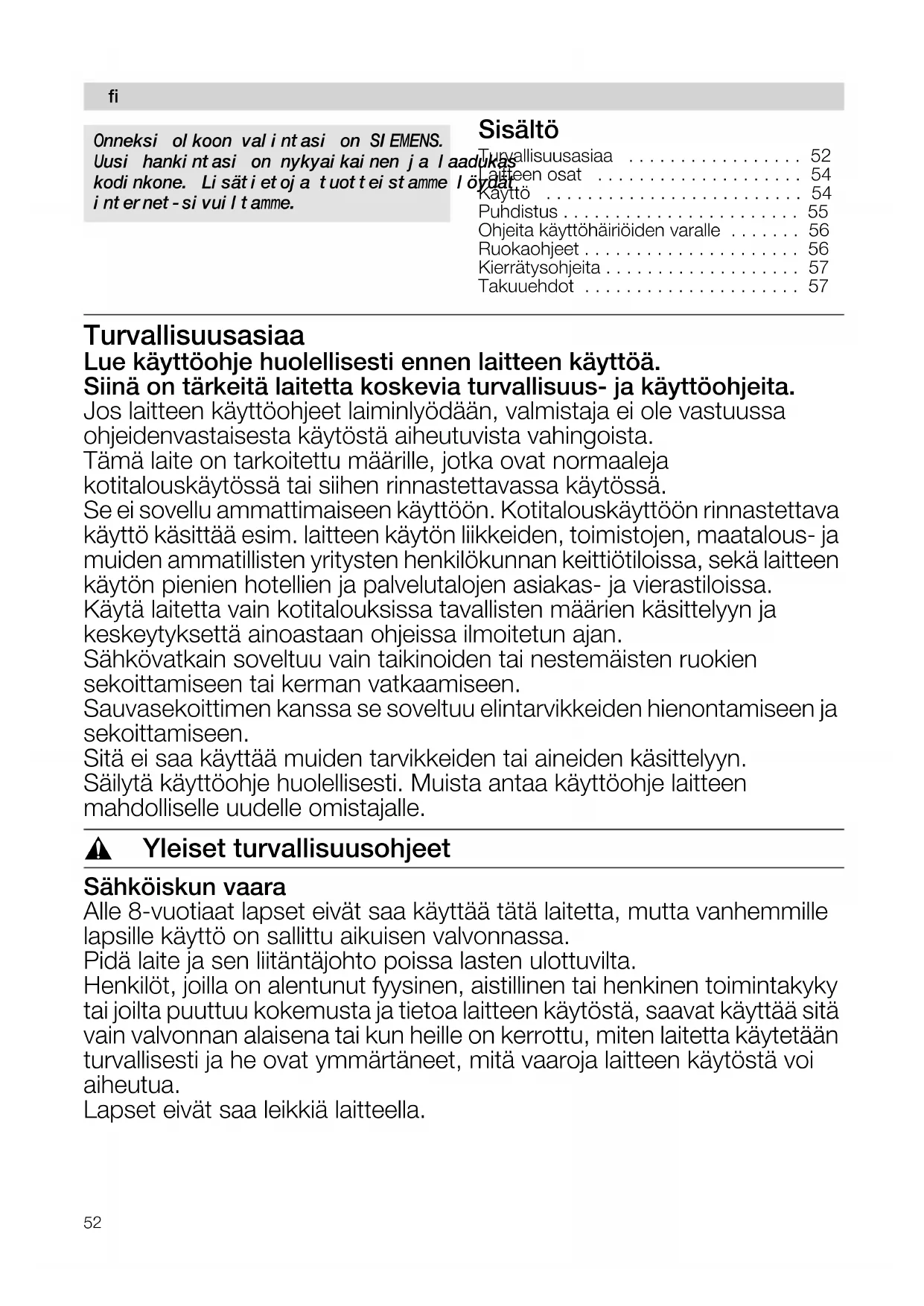 - Takuuehdot Turvallisuusasiaa Lue käyttöohje huolellisesti ennen laitteen käyttöä. Siinä on tärkeitä laitetta koskevia turvallisuus- ja käyttöohjeita. Jos laitteen käyttöohjeet laiminlyödään, valmistaja ei ole vastuussa ohjeidenvastaisesta käytöstä aiheutuvista vahingoista. Tämä laite on tarkoitettu määrille, jotka ovat normaaleja kotitalouskäytössä tai siihen rinnastettavassa käytössä. Se ei sovellu ammattimaiseen käyttöön. Kotitalouskäyttöön rinnastettava käyttö käsittää esim. laitteen käytön liikkeiden, toimistojen, maatalous- ja muiden ammatillisten yritysten henkilökunnan keittiötiloissa, sekä laitteen käytön pienien hotellien ja palvelutalojen asiakas- ja vierastiloissa. Käytä laitetta vain kotitalouksissa tavallisten määrien käsittelyyn ja keskeytyksettä ainoastaan ohjeissa ilmoitetun ajan. Sähkövatkain soveltuu vain taikinoiden tai nestemäisten ruokien sekoittamiseen tai kerman vatkaamiseen. Sauvasekoittimen kanssa se soveltuu elintarvikkeiden hienontamiseen ja sekoittamiseen. Sitä ei saa käyttää muiden tarvikkeiden tai aineiden käsittelyyn. Säilytä käyttöohje huolellisesti. Muista antaa käyttöohje laitteen mahdolliselle uudelle omistajalle. , Yleiset turvallisuusohjeet Sähköiskun vaara Alle 8-vuotiaat lapset eivät saa käyttää tätä laitetta, mutta vanhemmille lapsille käyttö on sallittu aikuisen valvonnassa. Pidä laite ja sen liitäntäjohto poissa lasten ulottuvilta. Henkilöt, joilla on alentunut fyysinen, aistillinen tai henkinen toimintakyky tai joilta puuttuu kokemusta ja tietoa laitteen käytöstä, saavat käyttää sitä vain valvonnan alaisena tai kun heille on kerrottu, miten laitetta käytetään turvallisesti ja he ovat ymmärtäneet, mitä vaaroja laitteen käytöstä voi aiheutua. Lapset eivät saa leikkiä laitteella. p. 57