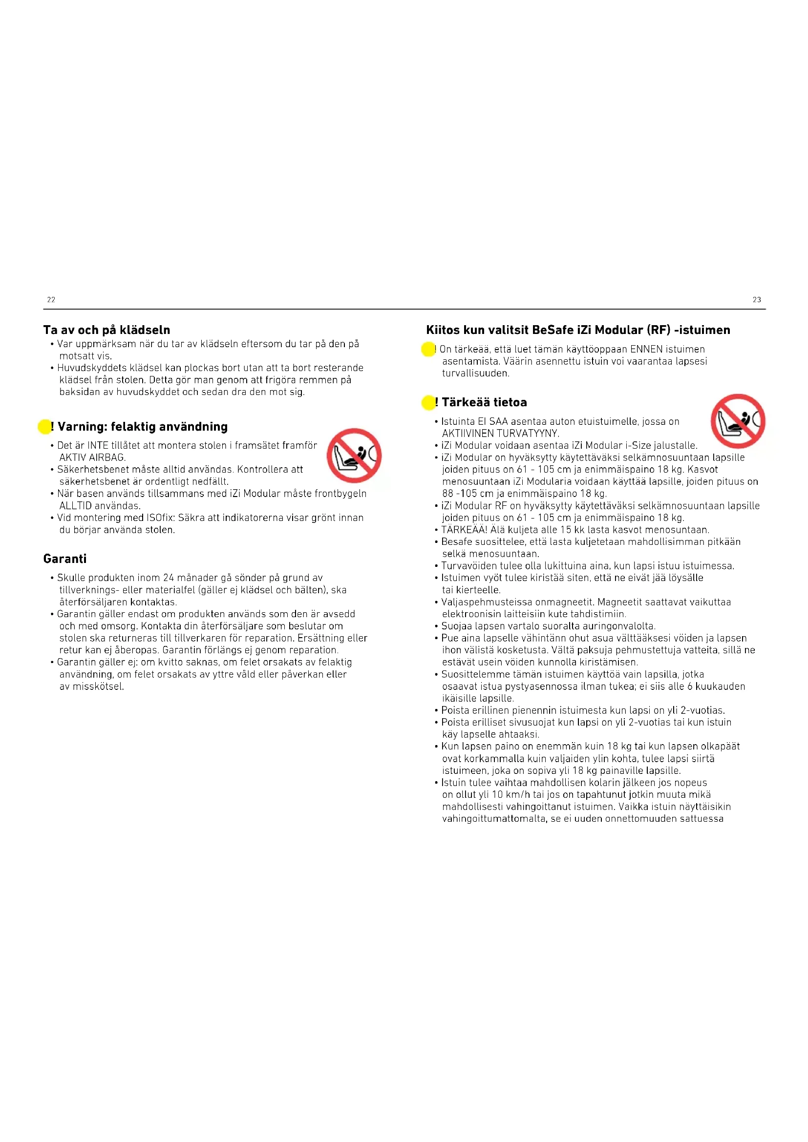 - Istuin tulee vaihtaa mahdollisen kolarin jälkeen jos nopeus on ollut yli 10 km/h tai jos on tapahtunut jotkin muuta mikä mahdollisesti vahingoittanut istuimen. Vaikka istuin näyttäisikin vahingoittumattomalta, se ei uuden onnettomuuden sattuessa Kiitos kun valitsit BeSafe iZi Modular (RF) -istuimen ! On tärkeää, että luet tämän käyttöoppaan ENNEN istuimen asentamista. Väärin asennettu istuin voi vaarantaa lapsesi turvallisuuden.24 25 mahdollisesti enää suojele lastasi niin hyvin kuin pitäisi.
