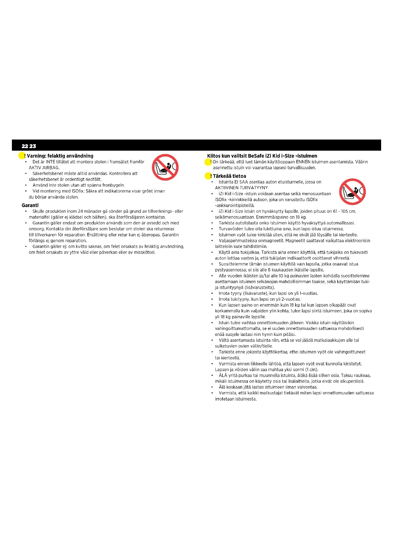 - Varmista, että kaikki matkustajat tietävät miten lapsi onnettomuuden sattuessa irrotetaan istuimesta. Kiitos kun valitsit BeSafe iZi Kid i-Size -istuimen ! On tärkeää, että luet tämän käyttöoppaan ENNEN istuimen asentamista. Väärin asennettu istuin voi vaarantaa lapsesi turvallisuuden.24 25