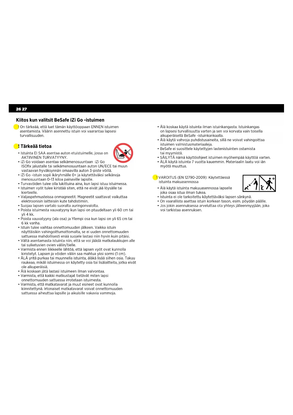 - Varmista, että matkatavarat ja muut esineet ovat kunnolla kiinnitettynä. Irtonaiset matkatavarat voivat onnettomuuden sattuessa aiheuttaa lapsille ja aikuisille vakavia vammoja. Kiitos kun valitsit BeSafe iZi Go -istuimen ! On tärkeää, että luet tämän käyttöoppaan ENNEN istuimen asentamista. Väärin asennettu istuin voi vaarantaa lapsesi turvallisuuden. ! VAROITUS (EN 12790-2009): Käytettäessä istuinta makuasennossa