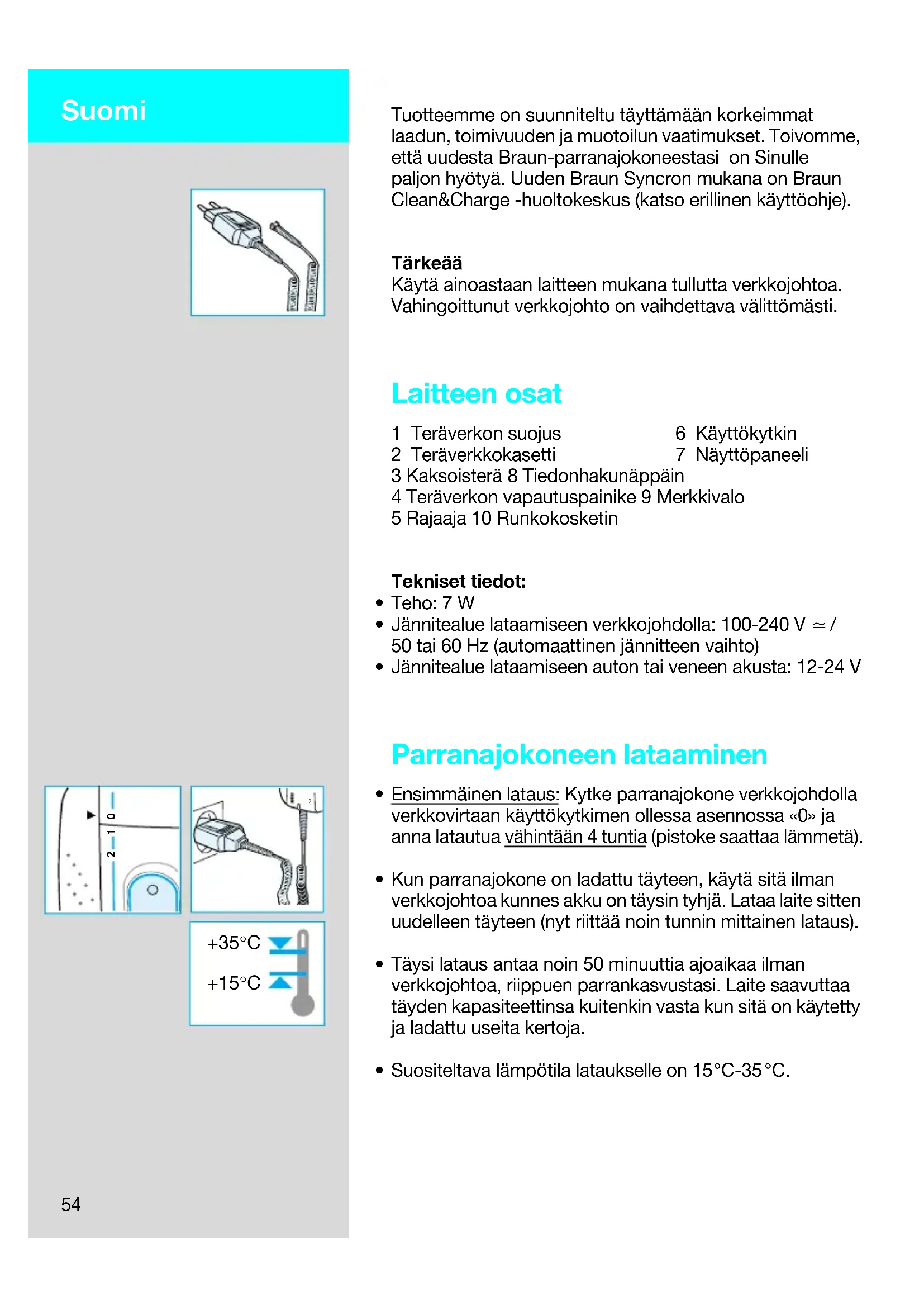 5491458_S 4-78 Seite 53 Freitag, 7. April 2000 9:37 0954 Tuotteemme on suunniteltu täyttämään korkeimmat laadun, toimivuuden ja muotoilun vaatimukset. Toivomme, että uudesta Braun-parranajokoneestasi on Sinulle paljon hyötyä. Uuden Braun Syncron mukana on Braun Clean&Charge -huoltokeskus (katso erillinen käyttöohje). Tärkeää Käytä ainoastaan laitteen mukana tullutta verkkojohtoa. Vahingoittunut verkkojohto on vaihdettava välittömästi. Laitteen osat 1 Teräverkon suojus 6 Käyttökytkin 2 Teräverkkokasetti 7 Näyttöpaneeli 3 Kaksoisterä 8 Tiedonhakunäppäin 4 Teräverkon vapautuspainike 9 Merkkivalo 5 Rajaaja 10 Runkokosketin Tekniset tiedot: