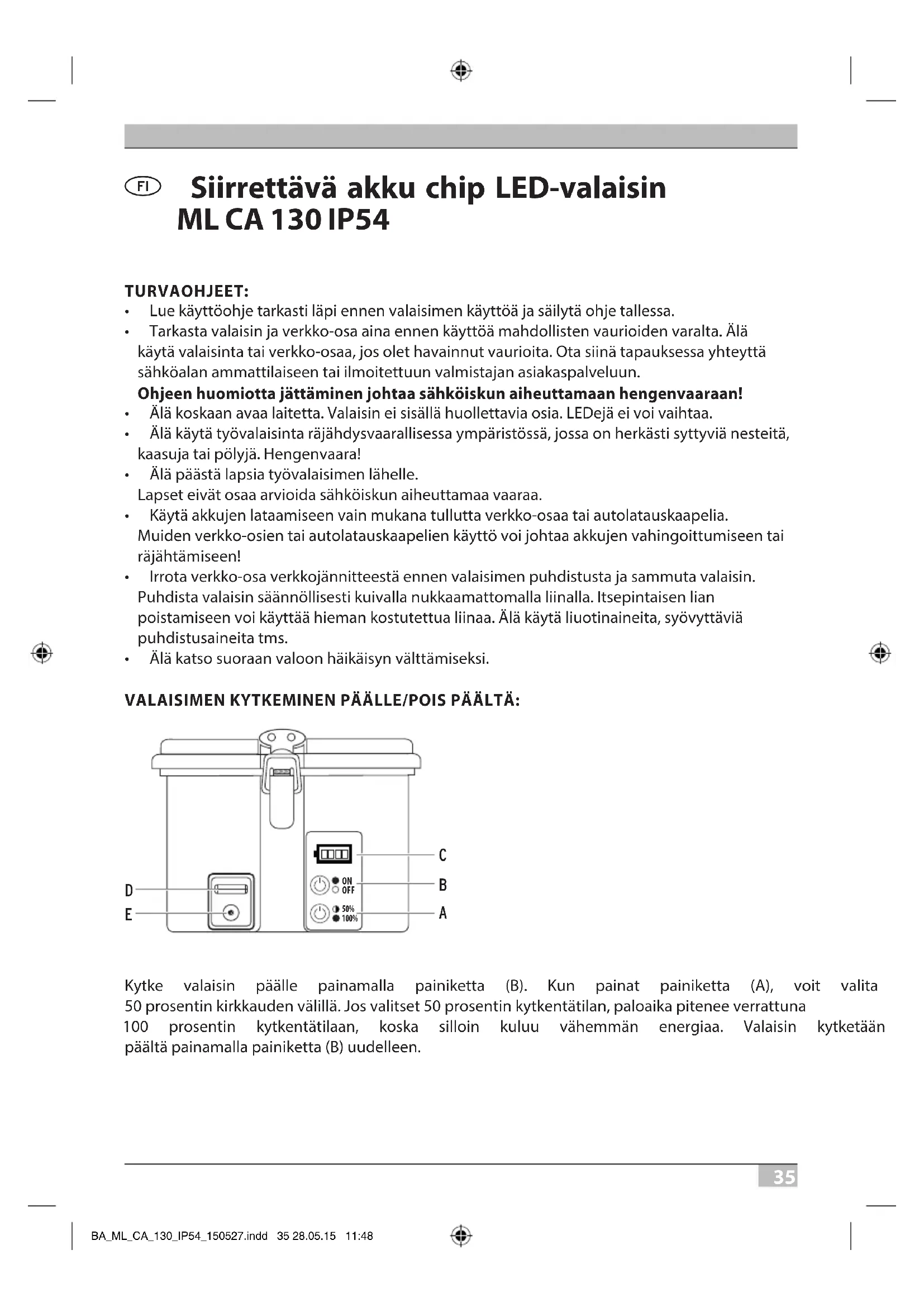Siirrettävä akku chip LED-valaisin ML CA 130 IP54 TURVAOHJEET: