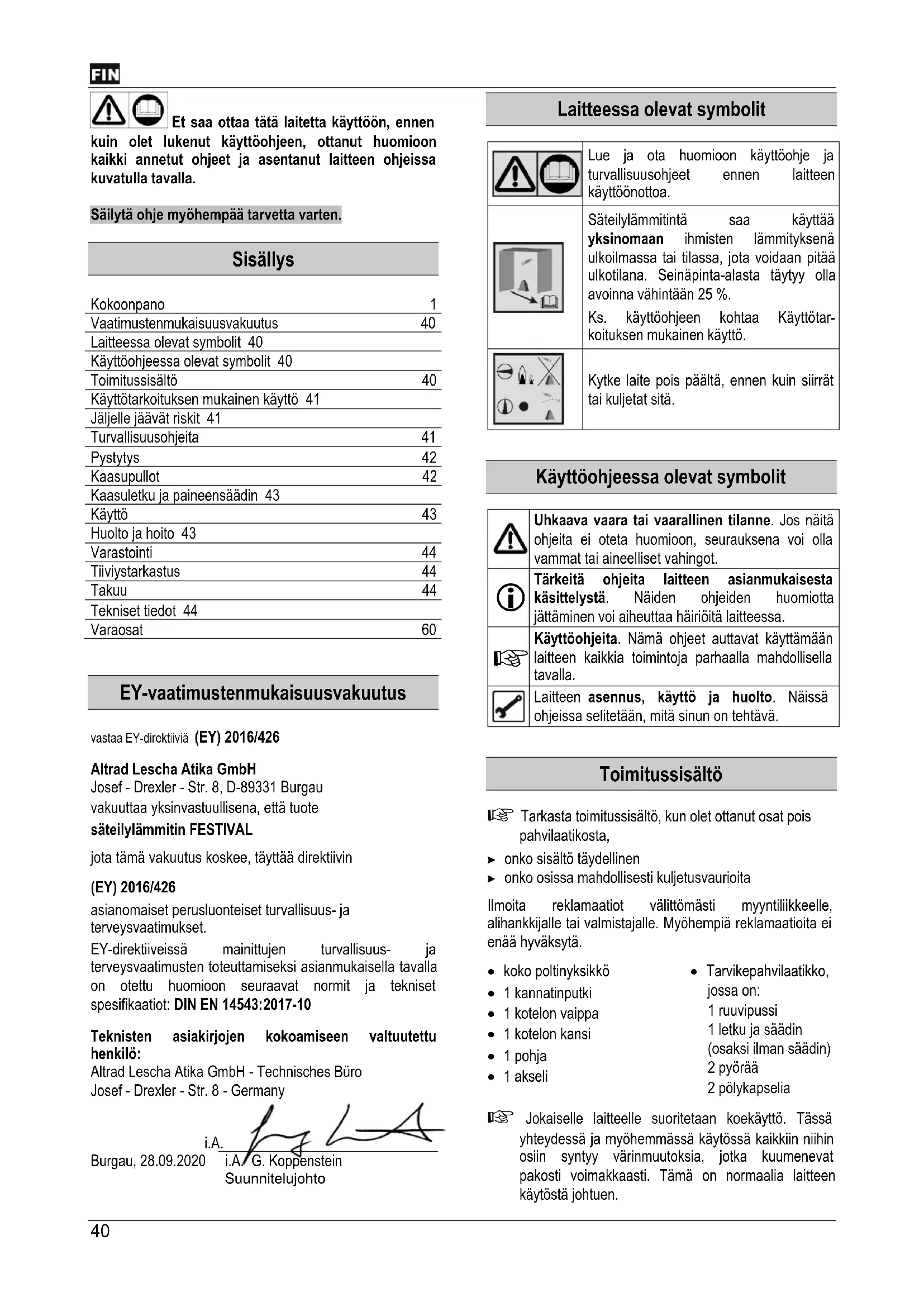 EY-vaatimustenmukaisuusvakuutus vastaa EY-direktiiviä (EY) 2016/426 Altrad Lescha Atika GmbH Josef - Drexler - Str. 8, D-89331 Burgau vakuuttaa yksinvastuullisena, että tuote säteilylämmitin FESTIVAL jota tämä vakuutus koskee, täyttää direktiivin (EY) 2016/426 asianomaiset perusluonteiset turvallisuus- ja terveysvaatimukset. EY-direktiiveissä mainittujen turvallisuus- ja terveysvaatimusten toteuttamiseksi asianmukaisella tavalla on otettu huomioon seuraavat normit ja tekniset spesifikaatiot: DIN EN 14543:2017-10 Teknisten asiakirjojen kokoamiseen valtuutettu henkilö: Altrad Lescha Atika GmbH - Technisches Büro Josef - Drexler - Str. 8 - Germany