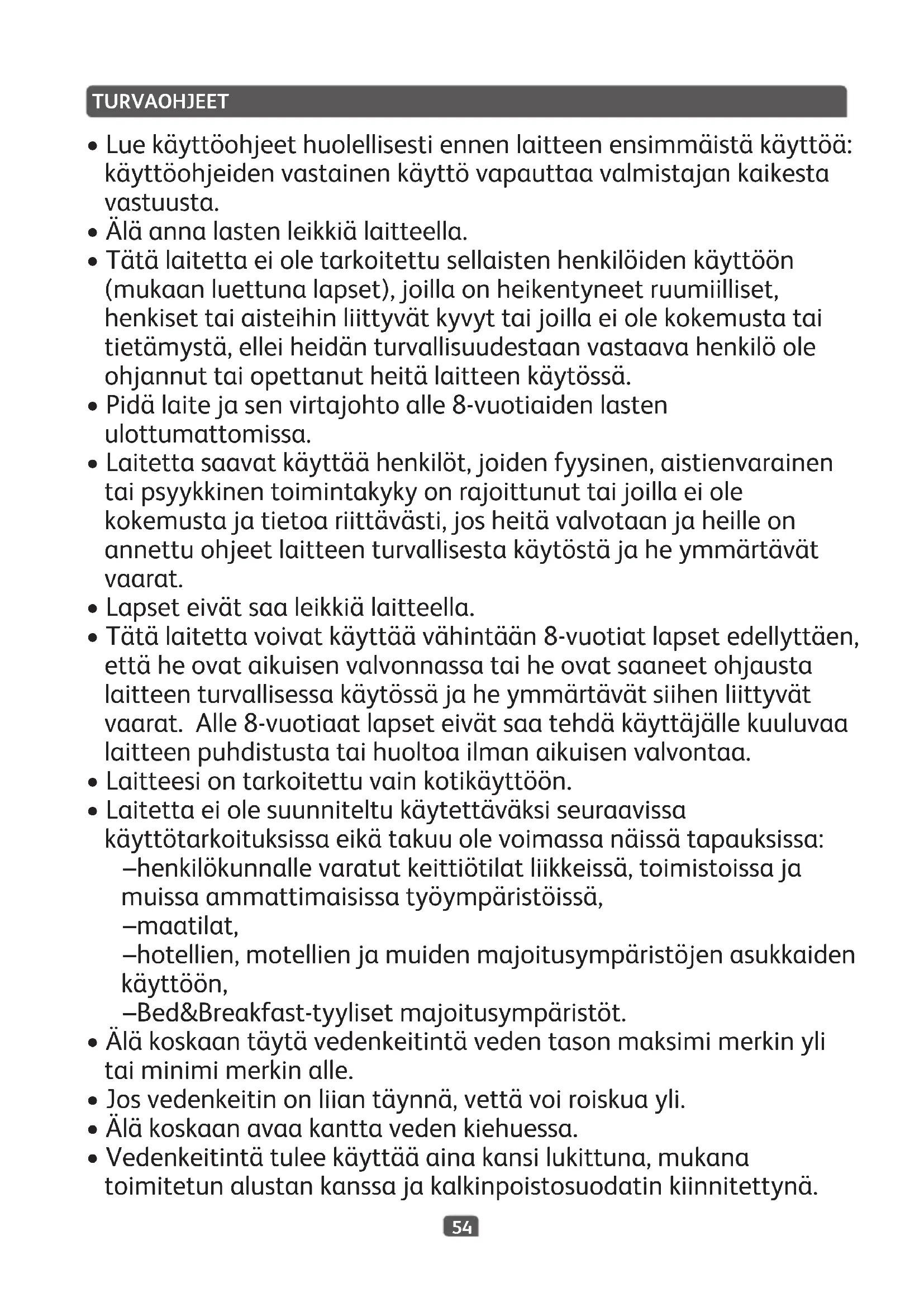 - Vedenkeitintätuleekäyttääainakansilukittuna,mukana toimitetunalustankanssajakalkinpoistosuodatinkiinnitettynä. TURVAOHJEET55