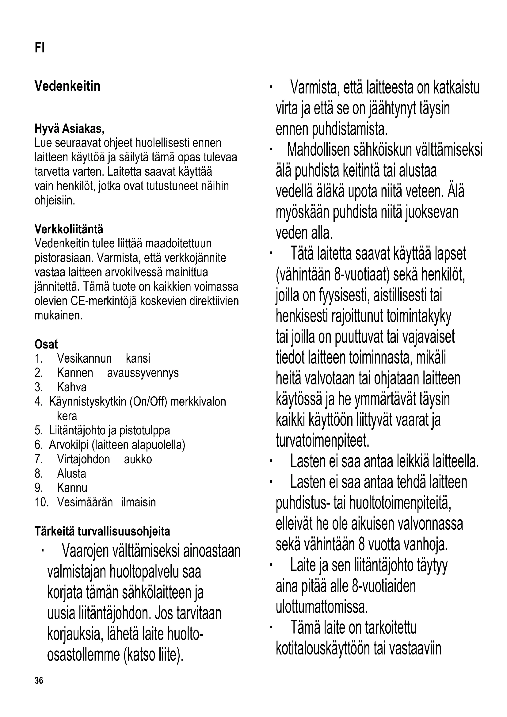 Tärkeitä turvallisuusohjeita ∙ Vaarojen välttämiseksi ainoastaan valmistajan huoltopalvelu saa korjata tämän sähkölaitteen ja uusia liitäntäjohdon. Jos tarvitaan korjauksia, lähetä laite huolto- osastollemme (katso liite). ∙ Varmista, että laitteesta on katkaistu virta ja että se on jäähtynyt täysin ennen puhdistamista. ∙ Mahdollisen sähköiskun välttämiseksi älä puhdista keitintä tai alustaa vedellä äläkä upota niitä veteen. Älä myöskään puhdista niitä juoksevan veden alla. ∙ Tätä laitetta saavat käyttää lapset (vähintään 8-vuotiaat) sekä henkilöt, joilla on fyysisesti, aistillisesti tai henkisesti rajoittunut toimintakyky tai joilla on puuttuvat tai vajavaiset tiedot laitteen toiminnasta, mikäli heitä valvotaan tai ohjataan laitteen käytössä ja he ymmärtävät täysin kaikki käyttöön liittyvät vaarat ja turvatoimenpiteet. ∙ Lasten ei saa antaa leikkiä laitteella. ∙ Lasten ei saa antaa tehdä laitteen puhdistus- tai huoltotoimenpiteitä, elleivät he ole aikuisen valvonnassa sekä vähintään 8 vuotta vanhoja. ∙ Laite ja sen liitäntäjohto täytyy aina pitää alle 8-vuotiaiden ulottumattomissa. ∙ Tämä laite on tarkoitettu kotitalouskäyttöön tai vastaaviin FI37 käyttötarkoituksiin - myymälät, toimistot ja vastaavat kaupalliset ympäristöt - maatalousyritykset - hotellien, motellien jne. ja vastaavien yritysten asiakkaat - aamiaisen ja majoituksen tarjoavat majatalot ∙ Älä jätä vedenkeitintä ilman valvontaa sen ollessa toiminnassa. Käytä vain puhdasta vettä ja huomioi aina minimi- ja maksimitäytön merkit kannua täyttäessäsi. Kannun täyttämimen liialla vedellä saattaa aiheuttaa kiehuvan veden valumisen ulos. ∙ Varo myös laitteesta tulevaa kuumaa höyryä. Älä kosketa laitetta käytön aikana kahvaa lukuunottamatta. ∙ Huomaa! Keittämisen aikana ja kuumaa vettä kaadettaessa kansi on aina pidettävä suljettuna. ∙ Keitintä saa käyttää ainoastaan mukana toimitetun alustan kanssa. ∙ Älä ota vesikannua koskaan pois alustalta (tai laita sitä takaisin alustalle) virran ollessa kytkettynä laitteeseen. ∙ Varoitus: Pidä lapset poissa pakkausmateriaalien luota potentiaalisen vaaratilanteen esim. tukehtumisvaaran vuoksi. ∙ Tarkasta aina ennen laitteen käyttöä huolellisesti laitteen runko, liitäntäjohto ja mahdolliset asennetut lisäosat vaurioiden varalta. Jos laite on esimerkiksi pudonnut kovalle pinnalle tai liitäntäjohdon vetämiseen on käytetty liikaa voimaa, laitetta ei saa enää käyttää: näkymättömätkin vauriot voivat aiheuttaa laitetta käytettäessä vaaratilanteita. ∙ Laitetta saa käyttää vain tasaisella, kuumuutta kestävällä pinnalla. ∙ Älä käytä laitetta seinään kiinnitetyn kaapin tai vastaavan esineen alla: on olemassa vaara, että poistuva höyry jämähtää sen alapuolelle. ∙ Ulkopinnat kuumenevat käytön aikana ja pysyvät kuumina jonkin aikaa käytön jälkeen. ∙ Varo, ettei liitäntäjohto tai kannu kosketa avoliekkiä tai kuumia pintoja (esim. lieden keittolevyjä). ∙ Älä jätä liitäntäjohtoa roikkumaan äläkä anna sen koskettaa kannun kuumia osia. ∙ Irrota pistotulppa pistorasiasta aina - käytön jälkeen - jos laitteessa on käyttöhäiriö - ennen laitteen puhdistamista ∙ Jos laite vahingoittuu väärinkäytön seurauksena tai siksi, että annettuja ohjeita ei ole noudatettu, valmistaja ei vastaa aiheutuneista vahingoista. Automaattinen virrankatkaisu Esiasetettu automaattinen turvakytkin suojaa vastusta ylikuumenemiselta, jos keittimeen kytketään virta vahingossa sen ollessa tyhjänä tai jos vastukseen on kerääntynyt kalkkia. Kun turvakytkin on katkaissut38 keittimestä virran, laitteen on annettava jäähtyä riittävästi tai siitä on poistettava kalkkisaostuma ennen verkkoon kytkemistä. Ennen käyttöä Täydellisen puhtauden varmistamiseksi kaada pois ensimmäinen kannullinen keitettyä vettä. Veden keittäminen ∙ Ota kannu pois alustalta. ∙ Avaa kansi avaussyvennyksestä. ∙ Lisää kannuun tarvitsemasi määrä vettä. Huomioi minimi- (Min.) ja maksimitäytön (Max.) merkit. ∙ Varmista, ettei laitteeseen ole kytketty virtaa ennen kuin suljet kannen ja asetat vesikannun vesikannun takaisin alustalle. ∙ Työnnä pistotulppa sopivaan pistorasiaan ja paina käynnistyspainiketta (On/Off). Merkkivalo syttyy. ∙ Vedenkeitto alkaa. Kun vesi saavuttaa kiehumispisteen, sisäänrakennettu kytkin katkaisee keittimestä virran automaattisesti. Merkkivalo sammuu. ∙ Jos haluat keskeyttää vedenkeiton, aseta käynnistyskytkin Off-asentoon. ∙ Kun haluat kaataa kuumaa vettä, ota kannu pois alustalta. ∙ Kuuman höyryn ulostulon estämiseksi varmista, että kansi pysyy kiinni vettä kaadettaessa. ∙ Irrota pistotulppa pistorasiasta käytön jälkeen (punainen merkkivalo sammuu). Johto-ohjain Alustan sivuilla on kolme johto-ohjainta, joiden avulla käyttäjän on helppo sijoittaa vesikannu alustalle halutusta suunnasta. Kalkinpoisto ∙ Paikallisen veden laadusta riippuen vastukseen saattaa kertyä kalkkia, joka tulee poistaa säännöllisin väliajoin. ∙ Kaikki takuuvaatimukset mitätöityvät, jos laitteen vika johtuu riittämättömästä kalkinpoistosta. ∙ Tarkoitukseen sopii seos, jossa on 0,5 litraa vettä ja 40 ml väkevää etikkaa. ∙ Kaada kannuun seos kalkin poistamiseksi. ∙ Kytke laitteeseen virta ja keitä kiehumispisteeseen. ∙ Anna seoksen vaikuttaa lyhyen aikaa. ∙ Puhdista kannu kalkin poiston jälkeen huuhtelemalla se perusteellisesti puhtaalla vedellä. ∙ Älä hengitä kalkinpoiston aikana syntyviä etikkahöyryjä ja varmista riittävä tuuletus. ∙ Älä kaada kalkinpoistoainetta emaloituihin astianpesualtaisiin. Laitteen puhdistus ja huolto ∙ Varmista, että laite on kytketty irti verkkovirrasta ja että se on jäähtynyt täysin ennen puhdistamista. ∙ Mahdollisen sähköiskun välttämiseksi älä puhdista keitintä tai alustaa vedellä äläkä upota n