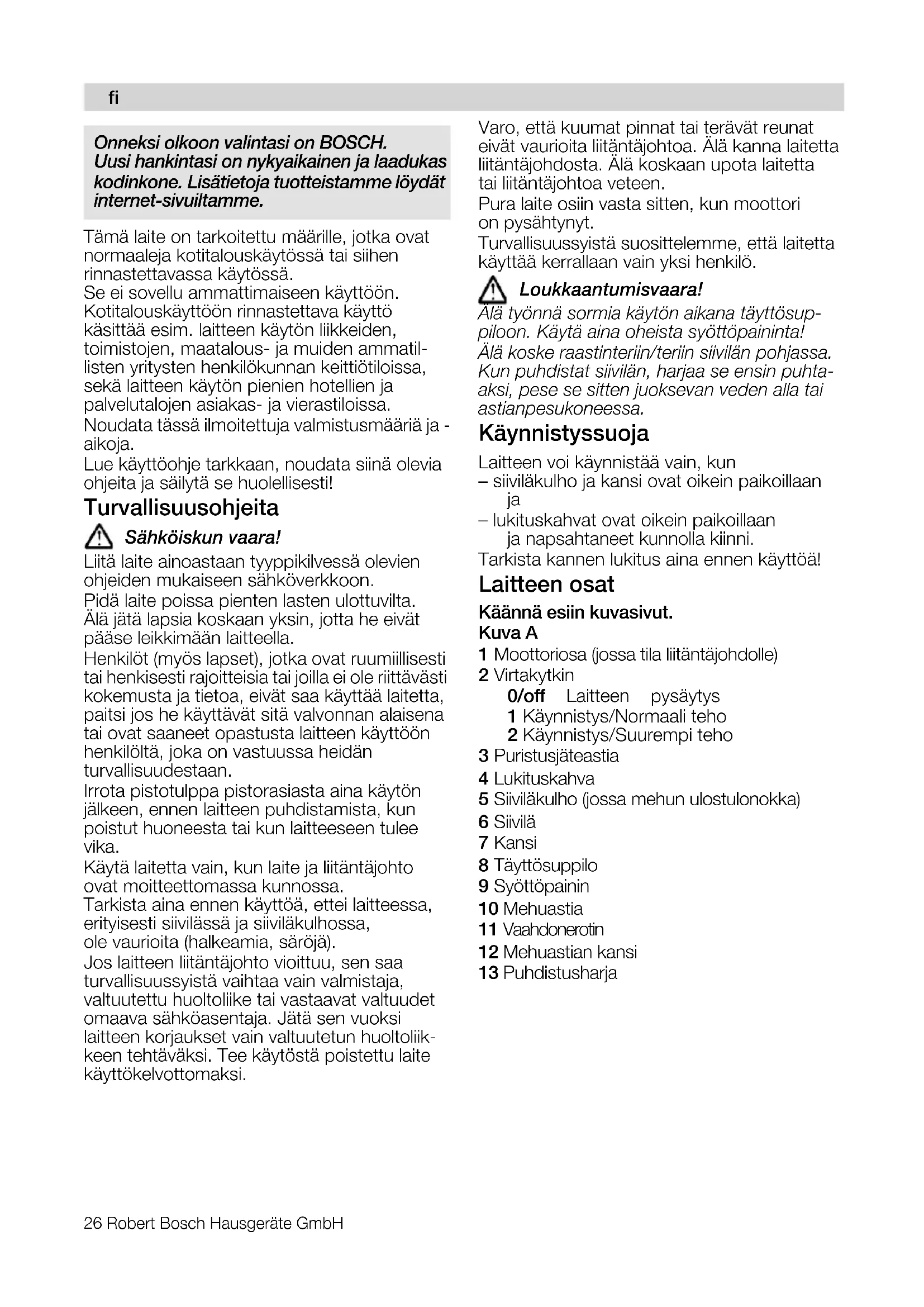 Rätten till ändringar förbehålles.26 Robert Bosch Hausgeräte GmbH Tämä laite on tarkoitettu määrille, jotka ovat normaaleja kotitalouskäytössä tai siihen rinnastettavassa käytössä. Se ei sovellu ammattimaiseen käyttöön. Kotitalouskäyttöön rinnastettava käyttö käsittää esim. laitteen käytön liikkeiden, toimistojen, maatalous- ja muiden ammatil- listen yritysten henkilökunnan keittiötiloissa, sekä laitteen käytön pienien hotellien ja palvelutalojen asiakas- ja vierastiloissa. Noudata tässä ilmoitettuja valmistusmääriä ja - aikoja. Lue käyttöohje tarkkaan, noudata siinä olevia ohjeita ja säilytä se huolellisesti! Turvallisuusohjeita p®Üâ∏áëâìå=î~~ê~> Liitä laite ainoastaan tyyppikilvessä olevien ohjeiden mukaiseen sähköverkkoon. Pidä laite poissa pienten lasten ulottuvilta. Älä jätä lapsia koskaan yksin, jotta he eivät pääse leikkimään laitteella. Henkilöt (myös lapset), jotka ovat ruumiillisesti tai henkisesti rajoitteisia tai joilla ei ole riittävästi kokemusta ja tietoa, eivät saa käyttää laitetta, paitsi jos he käyttävät sitä valvonnan alaisena tai ovat saaneet opastusta laitteen käyttöön henkilöltä, joka on vastuussa heidän turvallisuudestaan. Irrota pistotulppa pistorasiasta aina käytön jälkeen, ennen laitteen puhdistamista, kun poistut huoneesta tai kun laitteeseen tulee vika. Käytä laitetta vain, kun laite ja liitäntäjohto ovat moitteettomassa kunnossa. Tarkista aina ennen käyttöä, ettei laitteessa, erityisesti siivilässä ja siiviläkulhossa, ole vaurioita (halkeamia, säröjä). Jos laitteen liitäntäjohto vioittuu, sen saa turvallisuussyistä vaihtaa vain valmistaja, valtuutettu huoltoliike tai vastaavat valtuudet omaava sähköasentaja. Jätä sen vuoksi laitteen korjaukset vain valtuutetun huoltoliik- keen tehtäväksi. Tee käytöstä poistettu laite käyttökelvottomaksi. Varo, että kuumat pinnat tai terävät reunat eivät vaurioita liitäntäjohtoa. Älä kanna laitetta liitäntäjohdosta. Älä koskaan upota laitetta tai liitäntäjohtoa veteen. Pura laite osiin vasta sitten, kun moottori on pysähtynyt. Turvallisuussyistä suosittelemme, että laitetta käyttää kerrallaan vain yksi henkilö. içìââ~~åíìãáëî~~ê~> ûä®=íó∏åå®=ëçêãá~=â®óí∏å=~áâ~å~=í®óíí∏ëìéJ éáäççåK=h®óí®=~áå~=çÜÉáëí~=ëó∏íí∏é~áåáåí~> ûä®=âçëâÉ=ê~~ëíáåíÉêááåLíÉêááå=ëááîáä®å=éçÜà~ëë~K= hìå=éìÜÇáëí~í=ëááîáä®åI=Ü~êà~~=ëÉ=Éåëáå=éìÜí~J ~âëáI=éÉëÉ=ëÉ=ëáííÉå=àìçâëÉî~å=îÉÇÉå=~ää~=í~á= ~ëíá~åéÉëìâçåÉÉëë~K Käynnistyssuoja Laitteen voi käynnistää vain, kun – siiviläkulho ja kansi ovat oikein paikoillaan