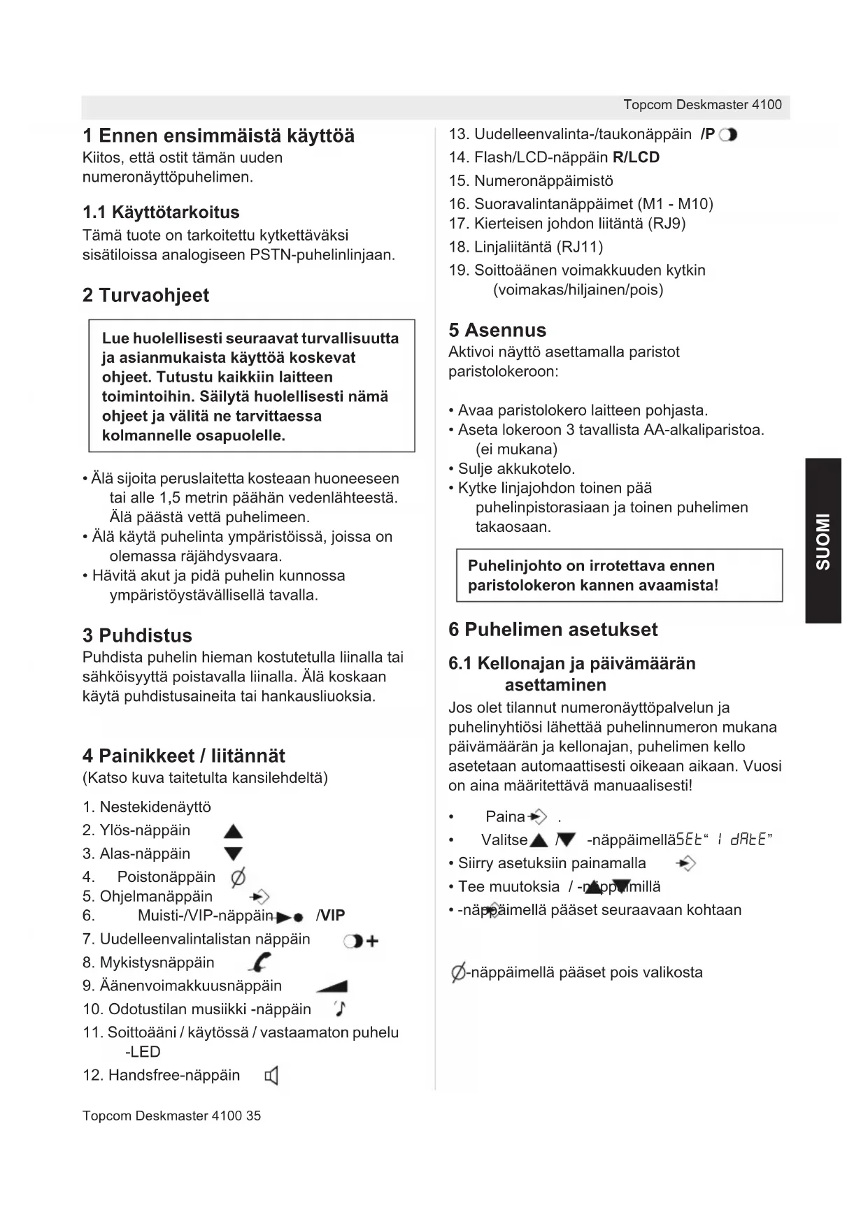 - -näppäimellä pääset seuraavaan kohtaan -näppäimellä pääset pois valikosta Lue huolellisesti seuraavat turvallisuutta ja asianmukaista käyttöä koskevat ohjeet. Tutustu kaikkiin laitteen toimintoihin. Säilytä huolellisesti nämä ohjeet ja välitä ne tarvittaessa kolmannelle osapuolelle. Puhelinjohto on irrotettava ennen paristolokeron kannen avaamista!36 Topcom Deskmaster 4100 Topcom Deskmaster 4100