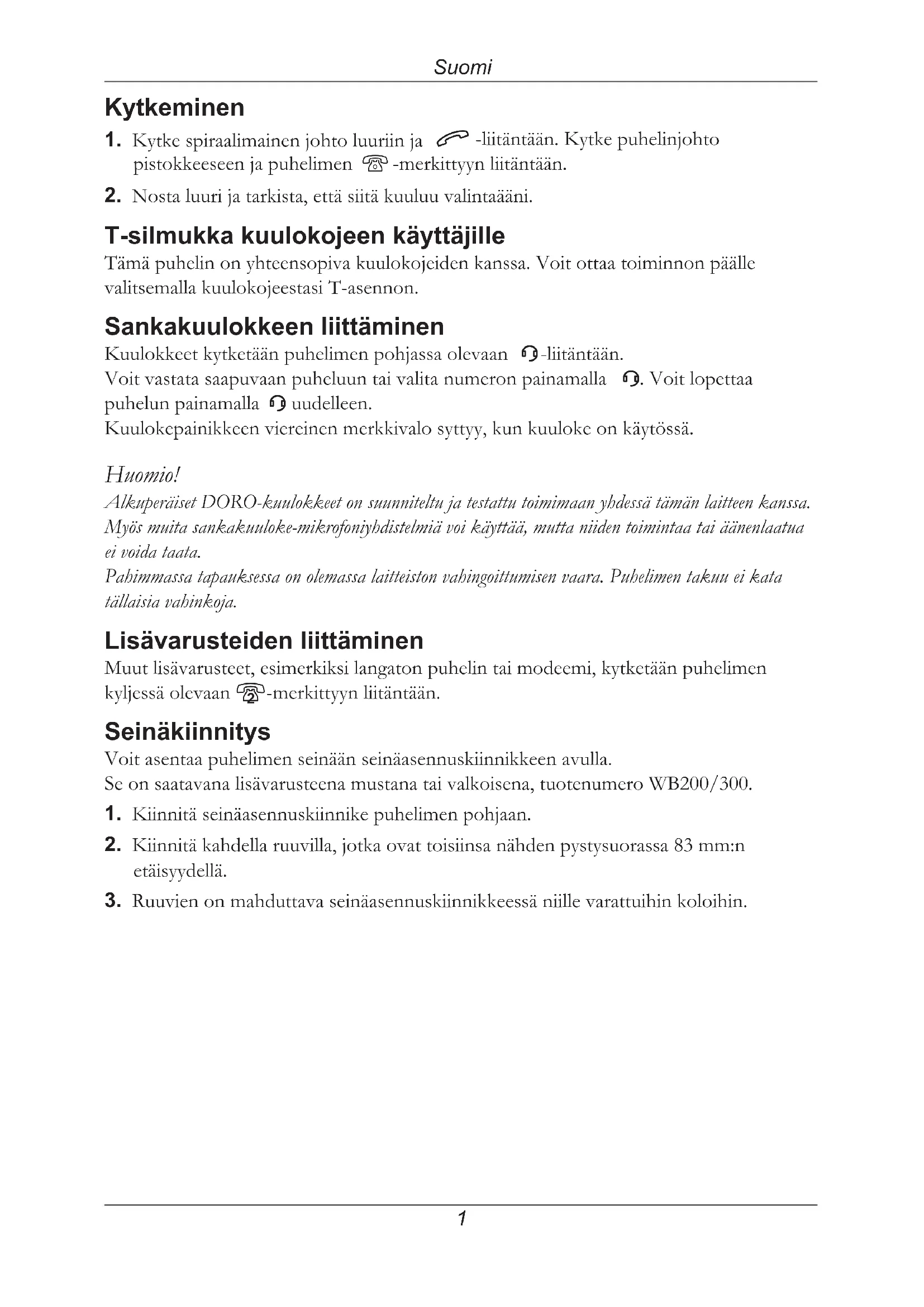 uudelleen. Kuulokepainikkeen viereinen merkkivalo syttyy, kun kuuloke on käytössä. Huomio! Alkuperäiset DORO-kuulokkeet on suunniteltu ja testattu toimimaan yhdessä tämän laitteen kanssa. Myös muita sankakuuloke-mikrofoniyhdistelmiä voi käyttää, mutta niiden toimintaa tai äänenlaatua ei voida taata. Pahimmassa tapauksessa on olemassa laitteiston vahingoittumisen vaara. Puhelimen takuu ei kata tällaisia vahinkoja. Lisävarusteiden liittäminen Muut lisävarusteet, esimerkiksi langaton puhelin tai modeemi, kytketään puhelimen kyljessä olevaan 8-merkittyyn liitäntään. Seinäkiinnitys Voit asentaa puhelimen seinään seinäasennuskiinnikkeen avulla. Se on saatavana lisävarusteena mustana tai valkoisena, tuotenumero WB200/300.