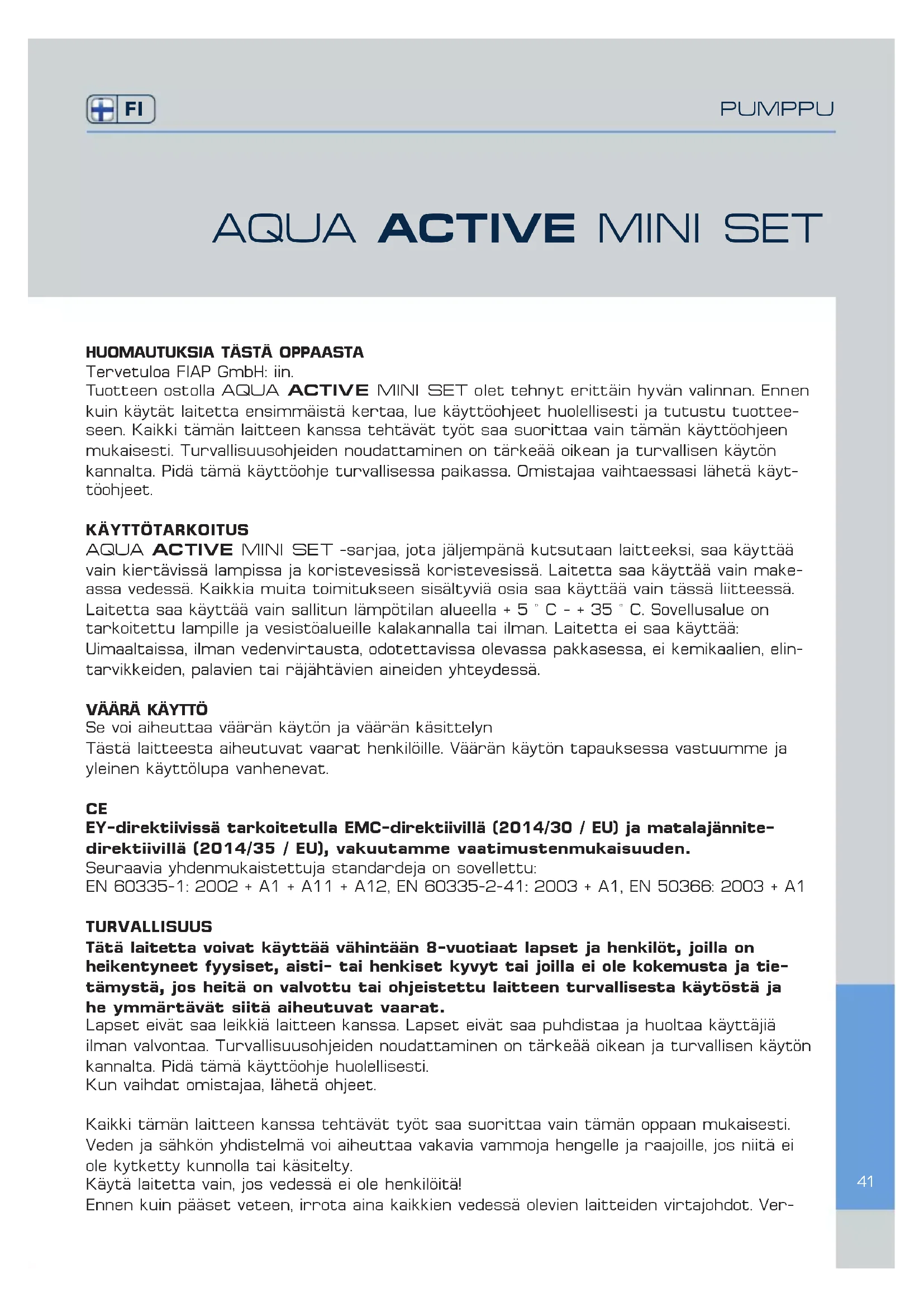 KÄYTTÖOHJE Aqua Active Mini set 3000 Fiap