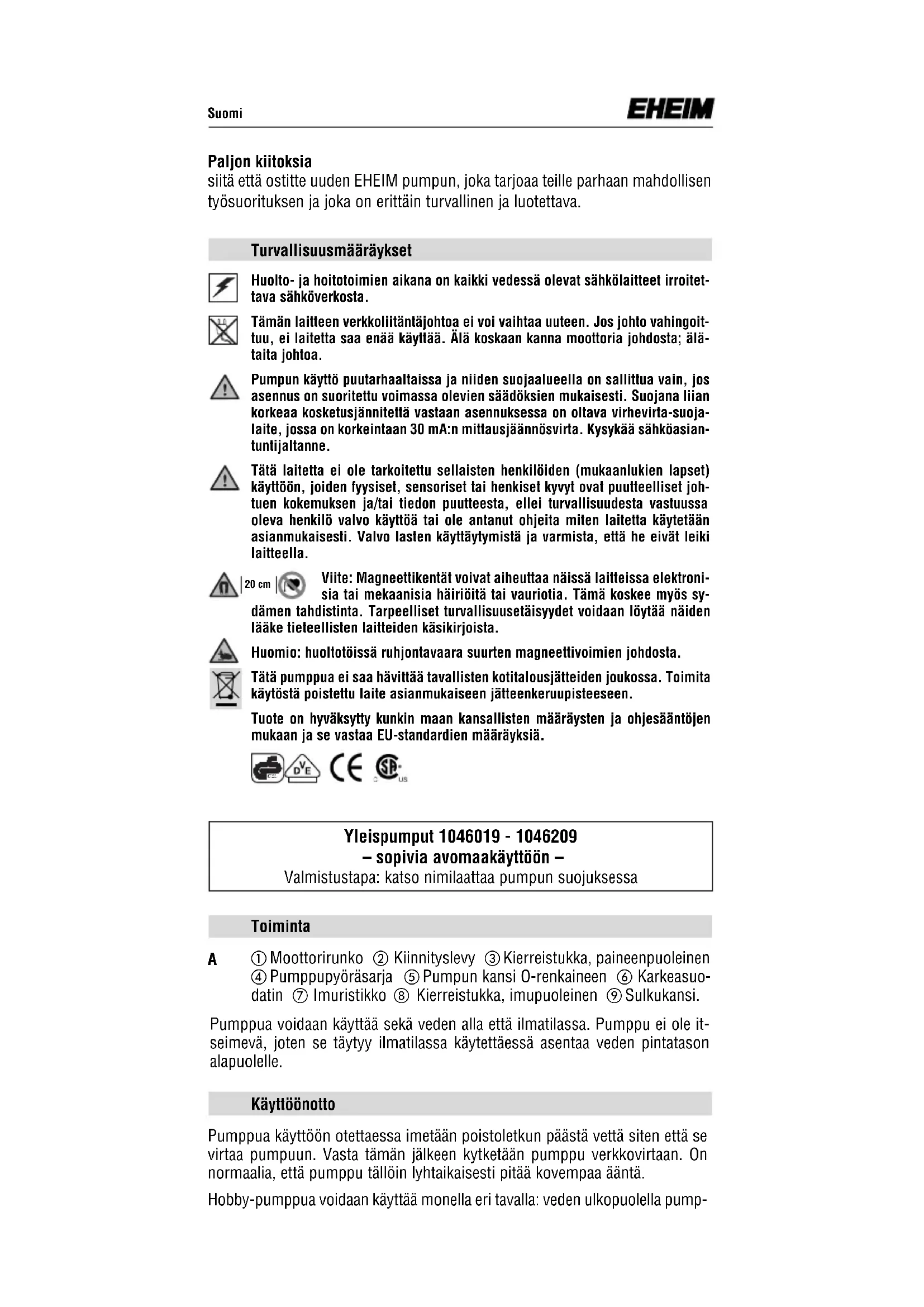 Dysehode. Pumpen suger vann gjennom det integrerte forfilteret. Reguleringsklipsen trykkes over hullet i stigerøret. Monter stigerøret på medfølgende rørkobling som igjen kobles på pumpens dysehode. Fontenepumpene 3146010 - 3146200 Utførelse: Se typeskiltet på pumpehuset Likedan oppbygd som 1046019, med kabel på 1,7 m. Egner seg ikke for uten- dørs bruk. Universal-sirkulasjonspumpe 1046219 - 1046499 – Ikke egnet for utendørs bruk – Utførelse: Se typeskiltet på pumpehuset Ved oppstart av pumpen, sug i slangeenden på trykksiden inntil det kommer vann i pumpen. Først da skal strømmen tilkobles. Litt støy ved opstart er nor- malt. For utendørsbruk er pumpen forskriftsmessig utstyrt med en 10 m kabel. Det finnes flere bruksområder for denne Universal-hobbypumpe: Når pum- pen brukes utenfor vann, kobles en slange til tilslutningsrøret på sugesiden. Ved bruk nedsenket i vann brukes det integrerte forfilter. Tilslutningsrøret på sugesiden skrues da ut, og åpningen lukkes med det medfølgende deksel. På trykksiden finnes to tilslutningsalternativer. Det ene er et tilslutningsrør for slange. I tillegg finnes en adapter til stigerøret. B/C Festeplaten kan flyttes og tilpasses flere montasjebehov. Pumpen må aldri løftes etter kabelen, og kabelen må ikke bøyes.Turvallisuusmääräykset Paljon kiitoksia siitä että ostitte uuden EHEIM pumpun, joka tarjoaa teille parhaan mahdollisen työsuorituksen ja joka on erittäin turvallinen ja luotettava. Suomi geprüfteSicherheit Huolto- ja hoitotoimien aikana on kaikki vedessä olevat sähkölaitteet irroitet- tava sähköverkosta. Tämän laitteen verkkoliitäntäjohtoa ei voi vaihtaa uuteen. Jos johto vahingoit- tuu, ei laitetta saa enää käyttää. Älä koskaan kanna moottoria johdosta; älä- taita johtoa. Pumpun käyttö puutarhaaltaissa ja niiden suojaalueella on sallittua vain, jos asennus on suoritettu voimassa olevien säädöksien mukaisesti. Suojana liian korkeaa kosketusjännitettä vastaan asennuksessa on oltava virhevirta-suoja- laite, jossa on korkeintaan 30 mA:n mittausjäännösvirta. Kysykää sähköasian- tuntijaltanne. Tätä laitetta ei ole tarkoitettu sellaisten henkilöiden (mukaanlukien lapset) käyttöön, joiden fyysiset, sensoriset tai henkiset kyvyt ovat puutteelliset joh- tuen kokemuksen ja/tai tiedon puutteesta, ellei turvallisuudesta vastuussa oleva henkilö valvo käyttöä tai ole antanut ohjeita miten laitetta käytetään asianmukaisesti. Valvo lasten käyttäytymistä ja varmista, että he eivät leiki laitteella. Viite: Magneettikentät voivat aiheuttaa näissä laitteissa elektroni- sia tai mekaanisia häiriöitä tai vauriotia. Tämä koskee myös sy- dämen tahdistinta. Tarpeelliset turvallisuusetäisyydet voidaan löytää näiden lääke tieteellisten laitteiden käsikirjoista. Huomio: huoltotöissä ruhjontavaara suurten magneettivoimien johdosta. Tätä pumppua ei saa hävittää tavallisten kotitalousjätteiden joukossa. Toimita käytöstä poistettu laite asianmukaiseen jätteenkeruupisteeseen. Tuote on hyväksytty kunkin maan kansallisten määräysten ja ohjesääntöjen mukaan ja se vastaa EU-standardien määräyksiä. 20 cm Yleispumput 1046019 - 1046209 – sopivia avomaakäyttöön – Valmistustapa: katso nimilaattaa pumpun suojuksessa Toiminta
