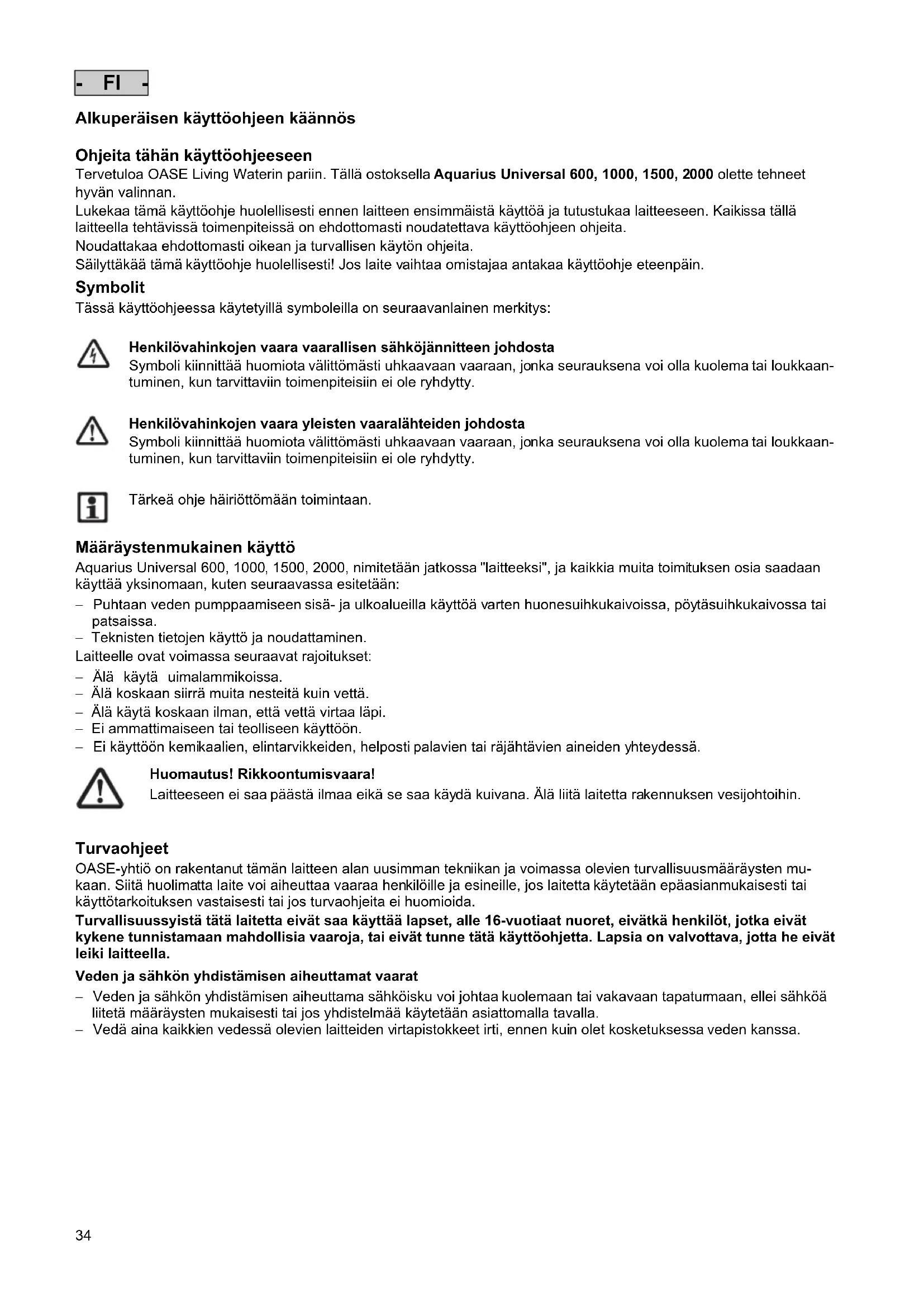 Förvara apparaten nedsänkt i vatten eller vattenfylld på en frostfri plats. Se till att stickkontakten inte ligger i vatten! Reparation En kåpa som har skadats kan inte repareras och får inte längre användas. Skrota apparaten enligt gällande föreskrifter.34 - FI - Alkuperäisen käyttöohjeen käännös Ohjeita tähän käyttöohjeeseen Tervetuloa OASE Living Waterin pariin. Tällä ostoksella Aquarius Universal 600, 1000, 1500, 2000 olette tehneet hyvän valinnan. Lukekaa tämä käyttöohje huolellisesti ennen laitteen ensimmäistä käyttöä ja tutustukaa laitteeseen. Kaikissa tällä laitteella tehtävissä toimenpiteissä on ehdottomasti noudatettava käyttöohjeen ohjeita. Noudattakaa ehdottomasti oikean ja turvallisen käytön ohjeita. Säilyttäkää tämä käyttöohje huolellisesti! Jos laite vaihtaa omistajaa antakaa käyttöohje eteenpäin. Symbolit Tässä käyttöohjeessa käytetyillä symboleilla on seuraavanlainen merkitys: