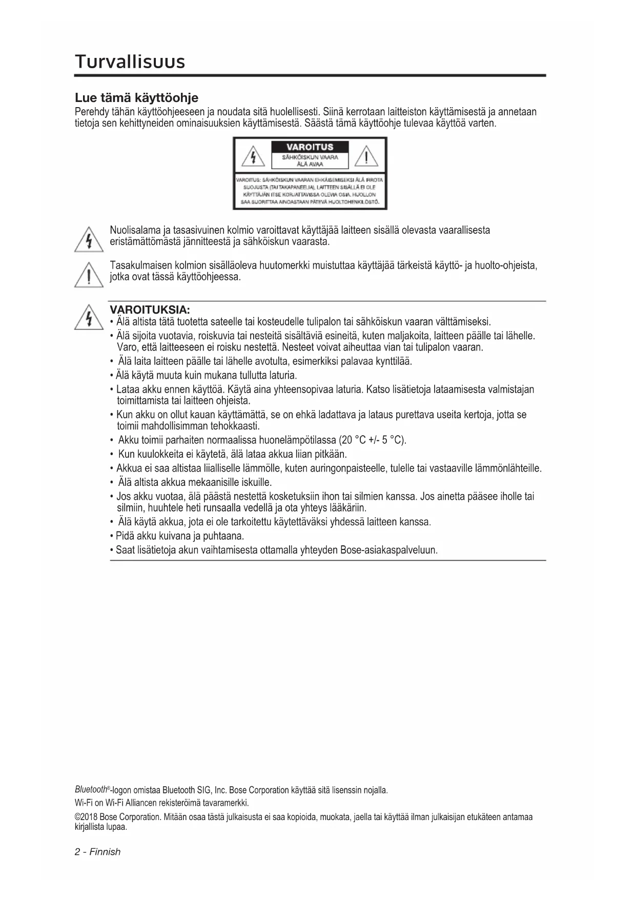 Bose Corporation vakuuttaa taten, etta tamä tuote tāyttä direktiivin 2014/53/EU (R&TTE-direktivi) sekä muiden sovellettavien EU-direktiivien vaatimukset. Tāydellinen vaatimustemmukaisuusvakuutus on osoitteessa www.Bose.com/compliance
