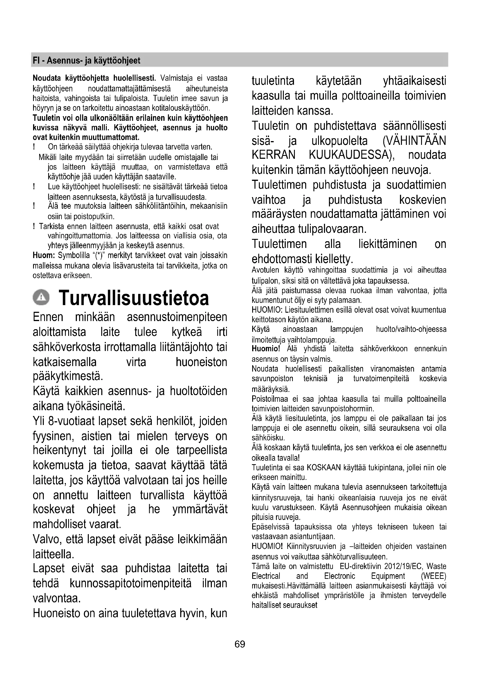 Underhåll Rengöring Använd endast en trasa fuktad med neutrala rengöringsmedel vid rengöring. Använd inte några verktyg eller instrument för rengöringen! Undvik produkter som innehåller slipmedel. ANVÄND INTE ALKOHOL! Underhåll av kondensbehållaren. Glaset framtill på kondensuppsamlaren tillåter att kontrollera om behållaren är full och ska tömmas och rengöras. I varje fall ska behållaren tömmas och rengöras MINST en gång i veckan eller oftare beroende på hur fläkten används. Behållaren kan rengöras manuellt eller i diskmaskin med låga temperaturer och kort program. Fig. 25 Fettfilter Fig. 10-22 Detta suger upp fettpartiklar som bildas i samband med matlagningen. Filtret skall rengöras en gång i månaden (eller när indikatorn för filtrets mättning – om sådan finns på er modell – anger att detta är nödvändigt), med ett milt rengöringsmedel, för hand eller i diskmaskin, med låg temperatur och kort program. Vi tvätt i diskmaskin kan fettfiltret av metall missfärgas utan att detta på något sätt påverkar filtrets uppsugningsförmåga. När filtret skall monteras ur drar man i handtaget som lossas med hjälp av en fjäder. Kolfilter (gäller endast filterversionen) Fig. 21 Kolfiltret fångar upp obehagliga odörer som uppstår i samband med matlagningen. Kolfiltret mättas efter en mer eller mindre lång tidsperiod beroende på i vilken utsträckning fläkten används, på typen av matlagning och hur regelbundet fettfiltren rengörs. Det är under alla händelser nödvändigt att ersätta kolfilterpatronen minst var 4 månad (eller när indikatorn för filtrets mättning – om sådan finns på er modell - anger att detta är nödvändigt). Filtret kan INTE rengöras eller återanvändas. Runda Kolfilter Applicera ett filter på varje sida för att täcka motorfläkthjulets båda skyddsgaller och vrid dem därefter medurs. Vid nedmontering vrider man filtret moturs. Byte av Lampor Fläkten är utrustad med ett belysningssystem som bygger på lysdiodsteknologi. Lysdioderna garanterar optimal belysning, upptill 10 gånger längre livslängd jämfört med konventionella lampor och möjliggör en energibesparing på 90%. Kontakta det tekniska servicekontoret för byte av lysdioderna.69 FI - Asennus- ja käyttöohjeet Noudata käyttöohjetta huolellisesti. Valmistaja ei vastaa käyttöohjeen noudattamattajättämisestä aiheutuneista haitoista, vahingoista tai tulipaloista. Tuuletin imee savun ja höyryn ja se on tarkoitettu ainoastaan kotitalouskäyttöön. Tuuletin voi olla ulkonäöltään erilainen kuin käyttöohjeen kuvissa näkyvä malli. Käyttöohjeet, asennus ja huolto ovat kuitenkin muuttumattomat. ! On tärkeää säilyttää ohjekirja tulevaa tarvetta varten. Mikäli laite myydään tai siirretään uudelle omistajalle tai jos laitteen käyttäjä muuttaa, on varmistettava että käyttöohje jää uuden käyttäjän saataville. ! Lue käyttöohjeet huolellisesti: ne sisältävät tärkeää tietoa laitteen asennuksesta, käytöstä ja turvallisuudesta. ! Älä tee muutoksia laitteen sähköliitäntöihin, mekaanisiin osiin tai poistoputkiin. ! Tarkista ennen laitteen asennusta, että kaikki osat ovat vahingoittumattomia. Jos laitteessa on viallisia osia, ota yhteys jälleenmyyjään ja keskeytä asennus. Huom: Symbolilla “(*)” merkityt tarvikkeet ovat vain joissakin malleissa mukana olevia lisävarusteita tai tarvikkeita, jotka on ostettava erikseen. Turvallisuustietoa Ennen minkään asennustoimenpiteen aloittamista laite tulee kytkeä irti sähköverkosta irrottamalla liitäntäjohto tai katkaisemalla virta huoneiston pääkytkimestä. Käytä kaikkien asennus- ja huoltotöiden aikana työkäsineitä. Yli 8-vuotiaat lapset sekä henkilöt, joiden fyysinen, aistien tai mielen terveys on heikentynyt tai joilla ei ole tarpeellista kokemusta ja tietoa, saavat käyttää tätä laitetta, jos käyttöä valvotaan tai jos heille on annettu laitteen turvallista käyttöä koskevat ohjeet ja he ymmärtävät mahdolliset vaarat. Valvo, että lapset eivät pääse leikkimään laitteella. Lapset eivät saa puhdistaa laitetta tai tehdä kunnossapitotoimenpiteitä ilman valvontaa. Huoneisto on aina tuuletettava hyvin, kun tuuletinta käytetään yhtäaikaisesti kaasulla tai muilla polttoaineilla toimivien laitteiden kanssa. Tuuletin on puhdistettava säännöllisesti sisä- ja ulkopuolelta (VÄHINTÄÄN KERRAN KUUKAUDESSA), noudata kuitenkin tämän käyttöohjeen neuvoja. Tuulettimen puhdistusta ja suodattimien vaihtoa ja puhdistusta koskevien määräysten noudattamatta jättäminen voi aiheuttaa tulipalovaaran. Tuulettimen alla liekittäminen on ehdottomasti kielletty. Avotulen käyttö vahingoittaa suodattimia ja voi aiheuttaa tulipalon, siksi sitä on vältettävä joka tapauksessa. Älä jätä paistumassa olevaa ruokaa ilman valvontaa, jotta kuumentunut öljy ei syty palamaan. HUOMIO: Liesituulettimen esillä olevat osat voivat kuumentua keittotason käytön aikana. Käytä ainoastaan lamppujen huolto/vaihto-ohjeessa ilmoitettuja vaihtolamppuja. Huomio! Älä yhdistä laitetta sähköverkkoon ennenkuin asennus on täysin valmis. Noudata huolellisesti paikallisten viranomaisten antamia savunpoiston teknisiä ja turvatoimenpiteitä koskevia määräyksiä. Poistoilmaa ei saa johtaa kaasulla tai muilla polttoaineilla toimivien laitteiden savunpoistohormiin. Älä käytä liesituuletinta, jos lamppu ei ole paikallaan tai jos lamppuja ei ole asennettu oikein, sillä seurauksena voi olla sähköisku. Älä koskaan käytä tuuletinta, jos sen verkkoa ei ole asennettu oikealla tavalla! Tuuletinta ei saa KOSKAAN käyttää tukipintana, jollei niin ole erikseen mainittu. Käytä vain laitteen mukana tulevia asennukseen tarkoitettuja kiinnitysruuveja, tai hanki oikeanlaisia ruuveja jos ne eivät kuulu varustukseen. Käytä Asennusohjeen mukaisia oikean pituisia ruuveja. Epäselvissä tapauksissa ota yhteys tekniseen tukeen tai vastaavaan asiantu