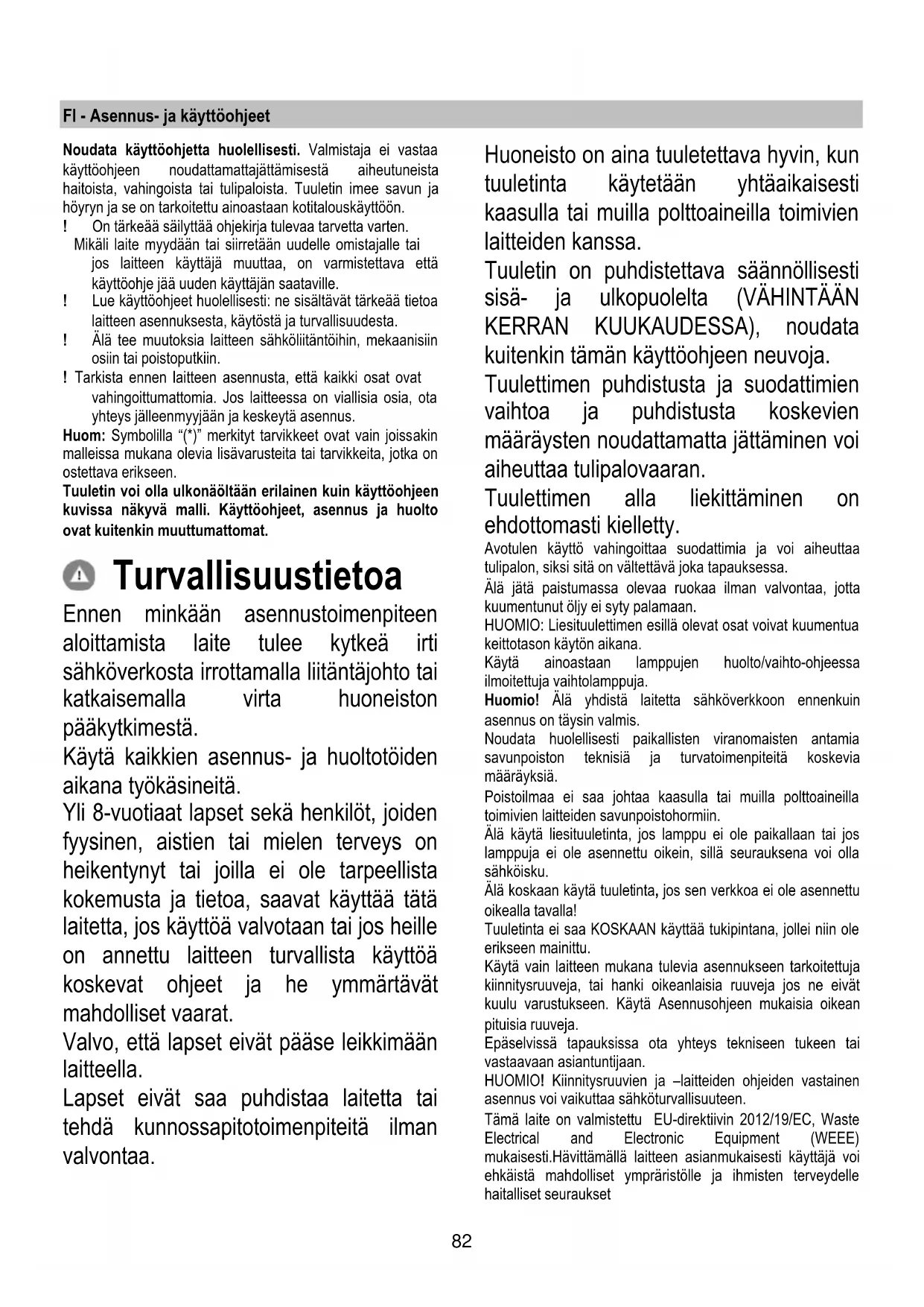 Underhåll Rengöring Använd endast en trasa fuktad med neutrala rengöringsmedel vid rengöring. Använd inte några verktyg eller instrument för rengöringen! Undvik produkter som innehåller slipmedel. ANVÄND INTE ALKOHOL! Fettfilter Fig. 25-26-27 Detta suger upp fettpartiklar som bildas i samband med matlagningen. Det bör rengöras minst en gång i månaden (eller när systemet för indikation om mättnad av filtren - om ett sådant är förutsett på den innehavda modellen - anger detta behov) med icke- aggressiva rengöringsmedel i diskmaskin på låg temperqatur och med kort cykel. (Tmax: 70°) Med rengöring i diskmaskin kan metalldelarna missfärgas. Filtret måste torkas i ugn vid en temperatur på max 100°C i en timme. Repetera operationen om filtret fortfarande är fuktigt. Byt ut filtret minst vartannat år. Varning! Efter att ha utfört underhållet av filtret ska du FÖRST installera fettfiltret i den speciella behållaren och SEDAN kolfiltret. Det sistnämnda känns igen på att det är förseglat inuti en strumpa. Kontrollera att endast fettfiltret är synligt när behållaren väl har återplacerats. Kolfilter (gäller endast filterversionen) Fig. 25-26-27 Kolfiltret fångar upp obehagliga odörer som uppstår i samband med matlagningen. Varning! Det aktiva kolfiltret känns igen på att det är förseglat inuti en speciell strumpa. Utför momenten för demontering, unerhåll och rengöring av filtret medan du hanterar filtret med maximal omsorg för att inte skada eller öppna strumpan. Kolfiltret kan tvättas varannan månad (eller när indikatorn för filtrets mättning – om sådan finns på er modell - anger att detta är nödvändigt) med varmt vatten och ett lämpligt rengöringsmedel, eller i diskmaskin med 65°C (om filtret diskas i diskmaskin skall ett fullständigt program köras utan annan disk i maskinen). Avlägsna allt överflödigt vatten utan att skada filtret och torka det därefter i ugnen med 100°C i 10 minuter. Byt ut dynan vart tredje år och varje gång filten skadats. Varning! Efter att ha utfört underhållet av filtret ska du FÖRST installera fettfiltret i den speciella behållaren och SEDAN kolfiltret. Det sistnämnda känns igen på att det är förseglat inuti en strumpa. Kontrollera att endast fettfiltret är synligt när behållaren väl har återplacerats. Byte av Lampor Fig. 25 Fläkten är utrustad med ett belysningssystem som bygger på lysdiodsteknologi. Lysdioderna garanterar optimal belysning, upptill 10 gånger längre livslängd jämfört med konventionella lampor och möjliggör en energibesparing på 90%. För inköp av de lysdioder som ska bytas ut ska du vända dig till den tekniska supporten.82 FI - Asennus- ja käyttöohjeet Noudata käyttöohjetta huolellisesti. Valmistaja ei vastaa käyttöohjeen noudattamattajättämisestä aiheutuneista haitoista, vahingoista tai tulipaloista. Tuuletin imee savun ja höyryn ja se on tarkoitettu ainoastaan kotitalouskäyttöön. ! On tärkeää säilyttää ohjekirja tulevaa tarvetta varten. Mikäli laite myydään tai siirretään uudelle omistajalle tai jos laitteen käyttäjä muuttaa, on varmistettava että käyttöohje jää uuden käyttäjän saataville. ! Lue käyttöohjeet huolellisesti: ne sisältävät tärkeää tietoa laitteen asennuksesta, käytöstä ja turvallisuudesta. ! Älä tee muutoksia laitteen sähköliitäntöihin, mekaanisiin osiin tai poistoputkiin. ! Tarkista ennen laitteen asennusta, että kaikki osat ovat vahingoittumattomia. Jos laitteessa on viallisia osia, ota yhteys jälleenmyyjään ja keskeytä asennus. Huom: Symbolilla “(*)” merkityt tarvikkeet ovat vain joissakin malleissa mukana olevia lisävarusteita tai tarvikkeita, jotka on ostettava erikseen. Tuuletin voi olla ulkonäöltään erilainen kuin käyttöohjeen kuvissa näkyvä malli. Käyttöohjeet, asennus ja huolto ovat kuitenkin muuttumattomat. Turvallisuustietoa Ennen minkään asennustoimenpiteen aloittamista laite tulee kytkeä irti sähköverkosta irrottamalla liitäntäjohto tai katkaisemalla virta huoneiston pääkytkimestä. Käytä kaikkien asennus- ja huoltotöiden aikana työkäsineitä. Yli 8-vuotiaat lapset sekä henkilöt, joiden fyysinen, aistien tai mielen terveys on heikentynyt tai joilla ei ole tarpeellista kokemusta ja tietoa, saavat käyttää tätä laitetta, jos käyttöä valvotaan tai jos heille on annettu laitteen turvallista käyttöä koskevat ohjeet ja he ymmärtävät mahdolliset vaarat. Valvo, että lapset eivät pääse leikkimään laitteella. Lapset eivät saa puhdistaa laitetta tai tehdä kunnossapitotoimenpiteitä ilman valvontaa. Huoneisto on aina tuuletettava hyvin, kun tuuletinta käytetään yhtäaikaisesti kaasulla tai muilla polttoaineilla toimivien laitteiden kanssa. Tuuletin on puhdistettava säännöllisesti sisä- ja ulkopuolelta (VÄHINTÄÄN KERRAN KUUKAUDESSA), noudata kuitenkin tämän käyttöohjeen neuvoja. Tuulettimen puhdistusta ja suodattimien vaihtoa ja puhdistusta koskevien määräysten noudattamatta jättäminen voi aiheuttaa tulipalovaaran. Tuulettimen alla liekittäminen on ehdottomasti kielletty. Avotulen käyttö vahingoittaa suodattimia ja voi aiheuttaa tulipalon, siksi sitä on vältettävä joka tapauksessa. Älä jätä paistumassa olevaa ruokaa ilman valvontaa, jotta kuumentunut öljy ei syty palamaan. HUOMIO: Liesituulettimen esillä olevat osat voivat kuumentua keittotason käytön aikana. Käytä ainoastaan lamppujen huolto/vaihto-ohjeessa ilmoitettuja vaihtolamppuja. Huomio! Älä yhdistä laitetta sähköverkkoon ennenkuin asennus on täysin valmis. Noudata huolellisesti paikallisten viranomaisten antamia savunpoiston teknisiä ja turvatoimenpiteitä koskevia määräyksiä. Poistoilmaa ei saa johtaa kaasulla tai muilla polttoaineilla toimivien laitteiden savunpoistohormiin. Älä käytä liesituuletinta, jos lamppu ei ole paikallaan tai jos lamppuja ei ole asennettu oikein, sillä seurauksena voi olla sähköisku. Ä