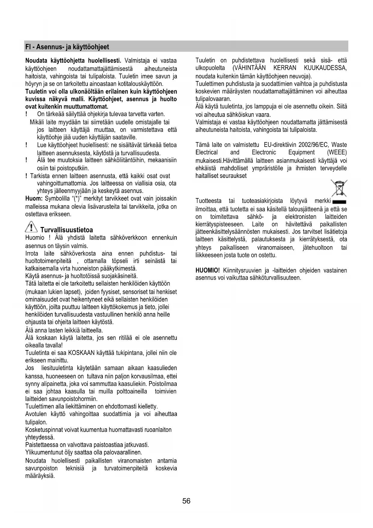 - Aktiva kolfilter som INTE kan rengöras. Aktivt kolfilter som kan rengöras Kolfiltret kan tvättas varannan månad med varmt vatten och ett lämpligt rengöringsmedel, eller i diskmaskin med 65°C (om filtret diskas i diskmaskin skall ett fullständigt program köras utan annan disk i maskinen). Avlägsna allt överflödigt vatten utan att skada filtret, ta därefter ur dynan som sitter i plastramen och torka den avslutningsvis i ugnen med 100°C i 10 minuter. Aktivt kolfilter som INTE kan rengöras Kolfiltret mättas efter en mer eller mindre lång tidsperiod beroende på i vilken utsträckning fläkten används, på typen av matlagning och hur regelbundet fettfiltren rengörs. Det är under alla händelser nödvändigt att ersätta kolfilterpatronen minst var 4 månad. Filtret kan INTE rengöras eller återanvändas. Montering Haka först fast det aktiva kolfiltret baktill på fläktens metallflik och därefter framtill med de båda rattarna. Nedmontering Ta ur det aktiva kolfiltret genom att vrida de båda rattarna med vilka det är fixerat i fläkten 90°. Byte av Lampor Fläkten är utrustad med ett belysningssystem som bygger på lysdiodsteknologi. Lysdioderna garanterar optimal belysning, upptill 10 gånger längre livslängd jämfört med konventionella lampor och möjliggör en energibesparing på 90%. Kontakta det tekniska servicekontoret för byte av lysdioderna.56 FI - Asennus- ja käyttöohjeet Noudata käyttöohjetta huolellisesti. Valmistaja ei vastaa käyttöohjeen noudattamattajättämisestä aiheutuneista haitoista, vahingoista tai tulipaloista. Tuuletin imee savun ja höyryn ja se on tarkoitettu ainoastaan kotitalouskäyttöön. Tuuletin voi olla ulkonäöltään erilainen kuin käyttöohjeen kuvissa näkyvä malli. Käyttöohjeet, asennus ja huolto ovat kuitenkin muuttumattomat. ! On tärkeää säilyttää ohjekirja tulevaa tarvetta varten. Mikäli laite myydään tai siirretään uudelle omistajalle tai jos laitteen käyttäjä muuttaa, on varmistettava että käyttöohje jää uuden käyttäjän saataville. ! Lue käyttöohjeet huolellisesti: ne sisältävät tärkeää tietoa laitteen asennuksesta, käytöstä ja turvallisuudesta. ! Älä tee muutoksia laitteen sähköliitäntöihin, mekaanisiin osiin tai poistoputkiin. ! Tarkista ennen laitteen asennusta, että kaikki osat ovat vahingoittumattomia. Jos laitteessa on viallisia osia, ota yhteys jälleenmyyjään ja keskeytä asennus. Huom: Symbolilla “(*)” merkityt tarvikkeet ovat vain joissakin malleissa mukana olevia lisävarusteita tai tarvikkeita, jotka on ostettava erikseen. Turvallisuustietoa Huomio ! Älä yhdistä laitetta sähköverkkoon ennenkuin asennus on täysin valmis. Irrota laite sähköverkosta aina ennen puhdistus- tai huoltotoimenpiteitä , ottamalla töpseli irti seinästä tai katkaisemalla virta huoneiston pääkytkimestä. Käytä asennus- ja huoltotöissä suojakäsineitä. Tätä laitetta ei ole tarkoitettu sellaisten henkilöiden käyttöön (mukaan lukien lapset), joiden fyysiset, sensoriset tai henkiset ominaisuudet ovat heikentyneet eikä sellaisten henkilöiden käyttöön, joilta puuttuu laitteen käyttökokemus ja tieto, jollei henkilöiden turvallisuudesta vastuullinen henkilö anna heille ohjausta tai ohjeita laitteen käytöstä. Älä anna lasten leikkiä laitteella. Älä koskaan käytä laitetta, jos sen ritilää ei ole asennettu oikealla tavalla! Tuuletinta ei saa KOSKAAN käyttää tukipintana, jollei niin ole erikseen mainittu. Jos liesituuletinta käytetään samaan aikaan kaasulieden kanssa, huoneeseen on tultava niin paljon korvausilmaa, ettei synny alipainetta, joka voi sammuttaa kaasuliekin. Poistoilmaa ei saa johtaa kaasulla tai muilla polttoaineilla toimivien laitteiden savunpoistohormiin. Tuulettimen alla liekittäminen on ehdottomasti kielletty. Avotulen käyttö vahingoittaa suodattimia ja voi aiheuttaa tulipalon. Kosketuspinnat voivat kuumentua huomattavasti ruoanlaiton yhteydessä. Paistettaessa on valvottava paistoastiaa jatkuvasti. Ylikuumentunut öljy saattaa olla palovaarallinen. Noudata huolellisesti paikallisten viranomaisten antamia savunpoiston teknisiä ja turvatoimenpiteitä koskevia määräyksiä. Tuuletin on puhdistettava huolellisesti sekä sisä- että ulkopuolelta (VÄHINTÄÄN KERRAN KUUKAUDESSA, noudata kuitenkin tämän käyttöohjeen neuvoja). Tuulettimen puhdistusta ja suodattimien vaihtoa ja puhdistusta koskevien määräysten noudattamattajättäminen voi aiheuttaa tulipalovaaran. Älä käytä tuuletinta, jos lamppuja ei ole asennettu oikein. Siitä voi aiheutua sähköiskun vaara. Valmistaja ei vastaa käyttöohjeen noudattamatta jättämisestä aiheutuneista haitoista, vahingoista tai tulipaloista. Tämä laite on valmistettu EU-direktiivin 2002/96/EC, Waste Electrical and Electronic Equipment (WEEE) mukaisesti.Hävittämällä laitteen asianmukaisesti käyttäjä voi ehkäistä mahdolliset ympräristölle ja ihmisten terveydelle haitalliset seuraukset Tuotteesta tai tuoteasiakirjoista löytyvä merkki ilmoittaa, että tuotetta ei saa käsitellä talousjätteenä ja että se on toimitettava sähkö- ja elektronisten laitteiden kierrätyspisteeseen. Laite on hävitettävä paikallisten jätteenkäsittelysäännösten mukaisesti. Jos tarvitset lisätietoja laitteen käsittelystä, palautuksesta ja kierrätyksestä, ota yhteys paikalliseen viranomaiseen, jätehuoltoon tai liikkeeseen josta tuote on ostettu. HUOMIO! Kiinnitysruuvien ja -laitteiden ohjeiden vastainen asennus voi vaikuttaa sähköturvallisuuteen.57 Käyttö Tuuletin on tarkoitettu käytettäväksi joko imukupuversiona ulkoisella poistolla tai suodatinversiona Sisäilmaa kierrättäen. Imukupuversio Höyry poistuu ulos liitoslaippaan kiinnitetyn poistoputken kautta. Poistoputken on oltava halkaisijaltaan samankokoinen kuin liitosrengas. Huomio! Poistoputki ei kuulu varustukseen ja se on ostettava erikseen. Vaakasuorassa osassa putken on taivuttava hieman ylöspäin (noi