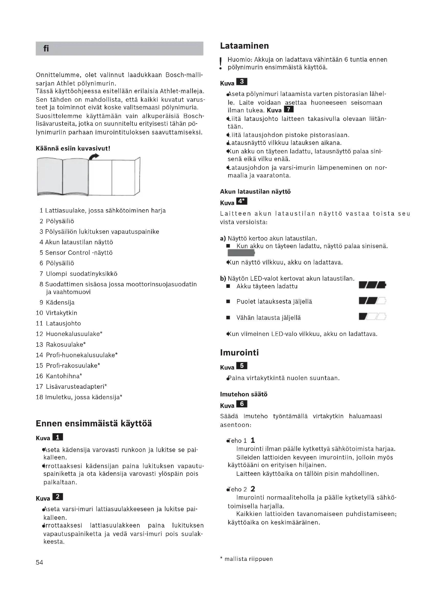 Onnittelumme, olet valinnut laadukkaan Bosch-malli- sarjan Athlet pölynimurin. Tässä käyttöohjeessa esitellään erilaisia Athlet-malleja. Sen tähden on mahdollista, että kaikki kuvatut varus- teet ja toiminnot eivät koske valitsemaasi pölynimuria. Suosittelemme käyttämään vain alkuperäisiä Bosch- lisävarusteita, jotka on suunniteltu erityisesti tähän pö- lynimuriin parhaan imurointituloksen saavuttamiseksi. Käännä esiin kuvasivut! 1 Lattiasuulake, jossa sähkötoiminen harja 2 Pölysäiliö 3 Pölysäiliön lukituksen vapautuspainike 4 Akun lataustilan näyttö 5 Sensor Control -näyttö 6 Pölysäiliö 7 Ulompi suodatinyksikkö 8 Suodattimen sisäosa jossa moottorinsuojasuodatin ja vaahtomuovi 9 Kädensija 10 Virtakytkin 11 Latausjohto 12 Huonekalusuulake* 13 Rakosuulake* 14 Profi-huonekalusuulake* 15 Profi-rakosuulake* 16 Kantohihna* 17 Lisävarusteadapteri* 18 Imuletku, jossa kädensija* Ennen ensimmäistä käyttöä Kuva