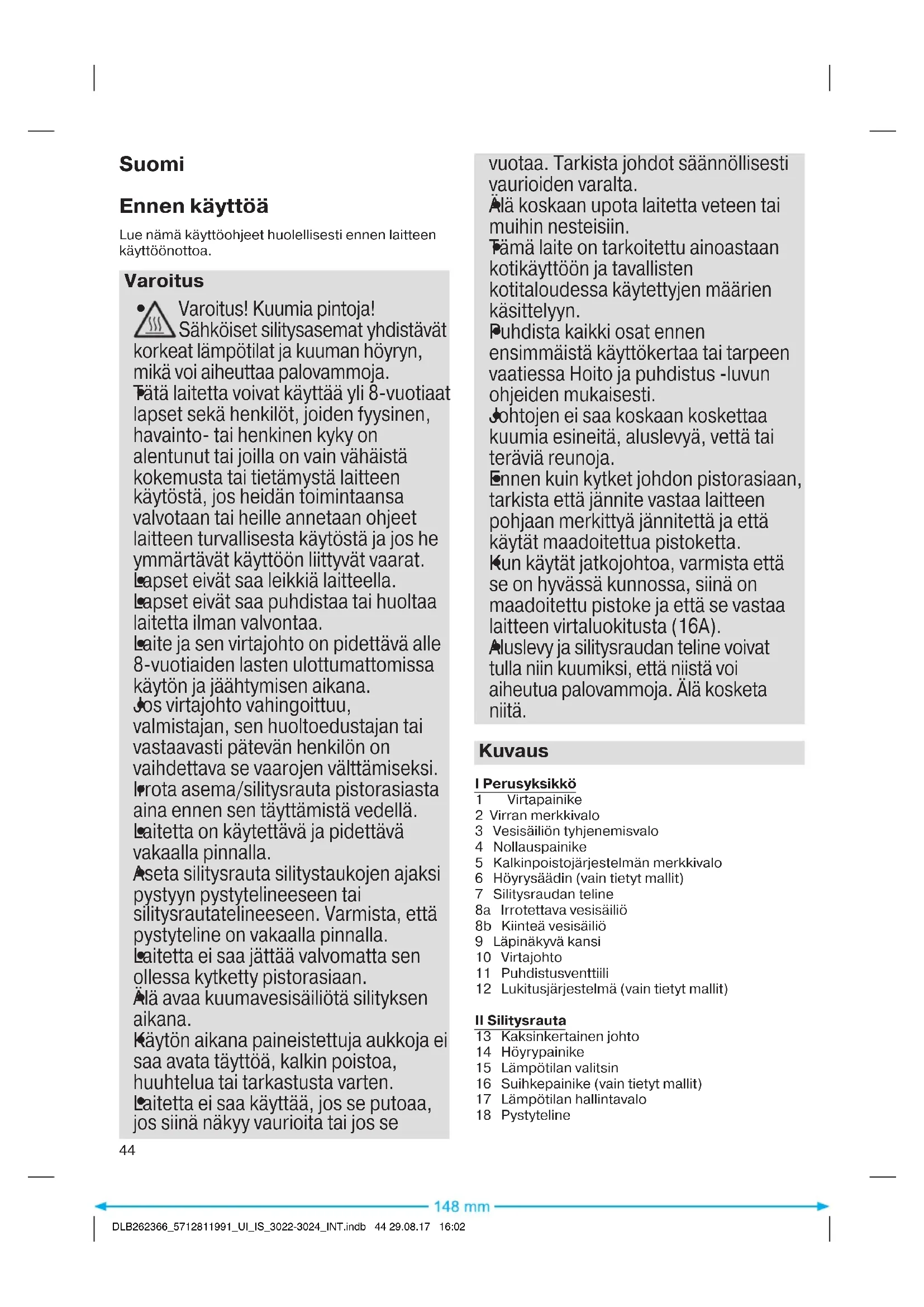 DLB262366_5712811991_UI_IS_3022-3024_INT.indb 43 29.08.17 16:02Suomi Ennen käyttöä Lue nämä käyttöohjeet huolellisesti ennen laitteen käyttöönottoa. Varoitus