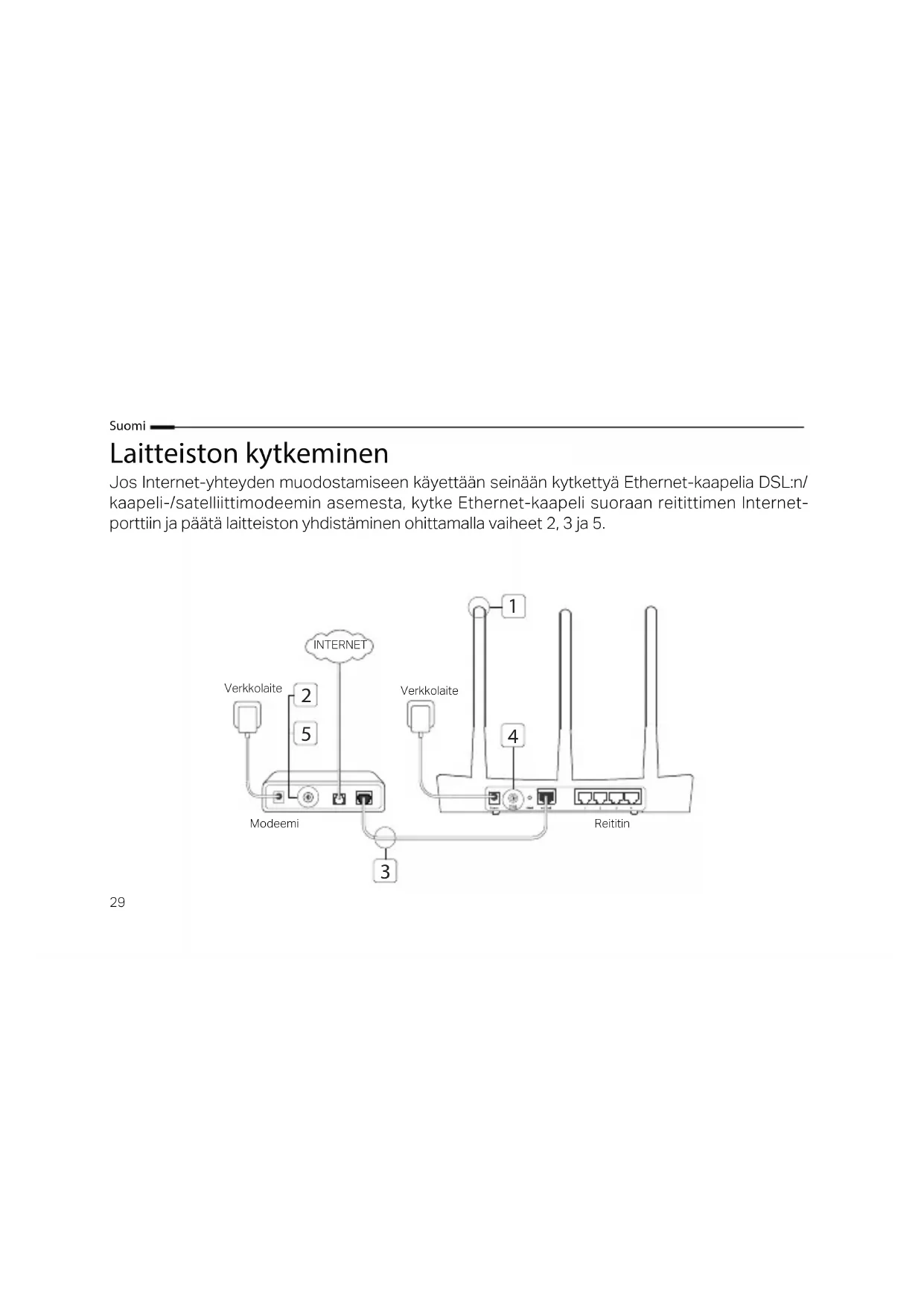 - $FHGD½LQWHUIDFHGHJHVWÀR:HEGR5RXWHUSDUDREWHURXUHGHƮQLUDVHQKD:L)L Nota: Para saber mais acerca do seu Router, por favor visite o Web site https://www.tp-link.pt e efetue o download do Guia de Utilizador do seu Router.29 Suomi Laitteiston kytkeminen Jos Internet-yhteyden muodostamiseen käyettään seinään kytkettyä Ethernet-kaapelia DSL:n/ kaapeli-/satelliittimodeemin asemesta, kytke Ethernet-kaapeli suoraan reitittimen Internet- porttiin ja päätä laitteiston yhdistäminen ohittamalla vaiheet 2, 3 ja 5.