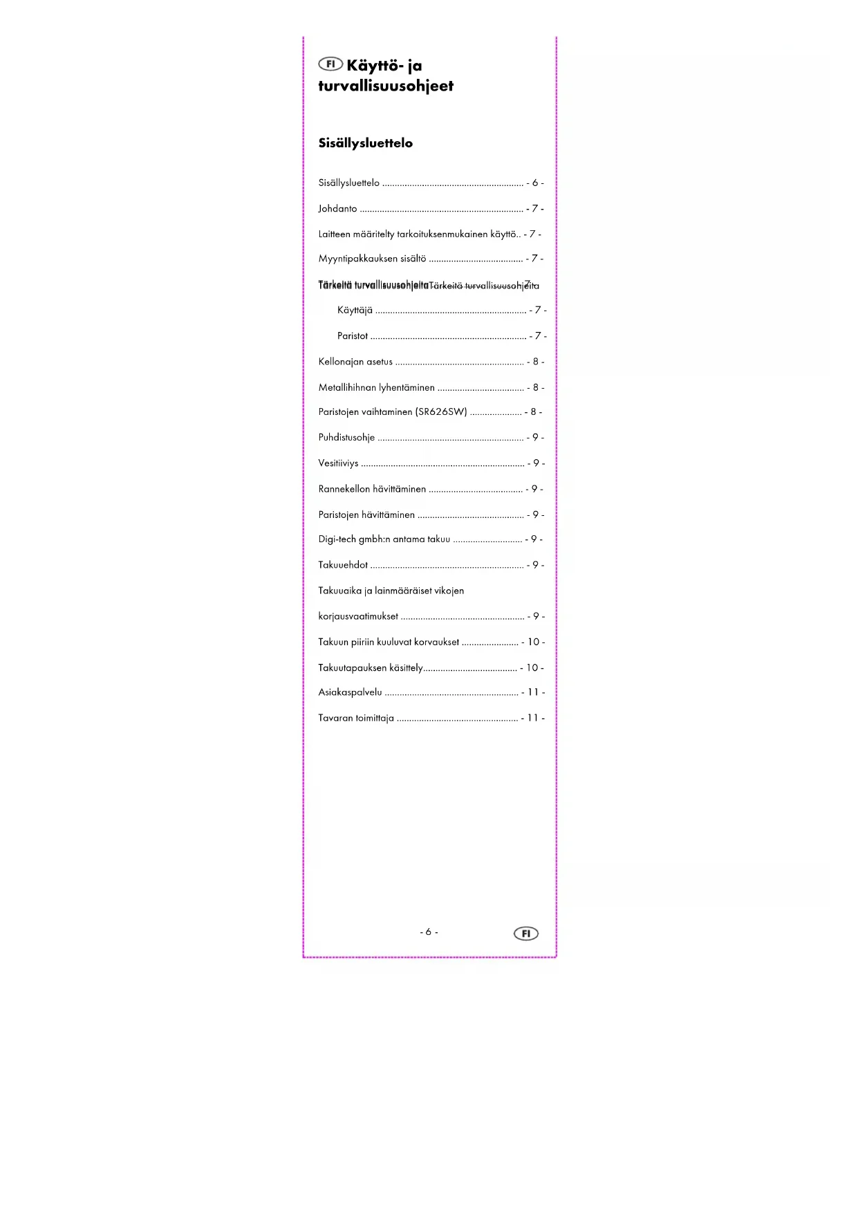 Sisällysluettelo ......................................................... - 6 - Johdanto .................................................................. - 7 - Laitteen määritelty tarkoituksenmukainen käyttö.. - 7 - Myyntipakkauksen sisältö ...................................... - 7 - Tärkeitä turvallisuusohjeita Tärkeitä turvallisuusohjeitaTärkeitä turvallisuusohjeita Tärkeitä turvallisuusohjeita .................................. - 7 - Käyttäjä ............................................................. - 7 - Paristot ............................................................... - 7 - Kellonajan asetus .................................................... - 8 - Metallihihnan lyhentäminen ................................... - 8 - Paristojen vaihtaminen (SR626SW) ..................... - 8 - Puhdistusohje ........................................................... - 9 - Vesitiiviys .................................................................. - 9 - Rannekellon hävittäminen ...................................... - 9 - Paristojen hävittäminen ........................................... - 9 - Digi-tech gmbh:n antama takuu ............................ - 9 - Takuuehdot .............................................................. - 9 - Takuuaika ja lainmääräiset vikojen korjausvaatimukset .................................................. - 9 - Takuun piiriin kuuluvat korvaukset ....................... - 10 - Takuutapauksen käsittely...................................... - 10 - Asiakaspalvelu ...................................................... - 11 - Tavaran toimittaja ................................................. - 11 --