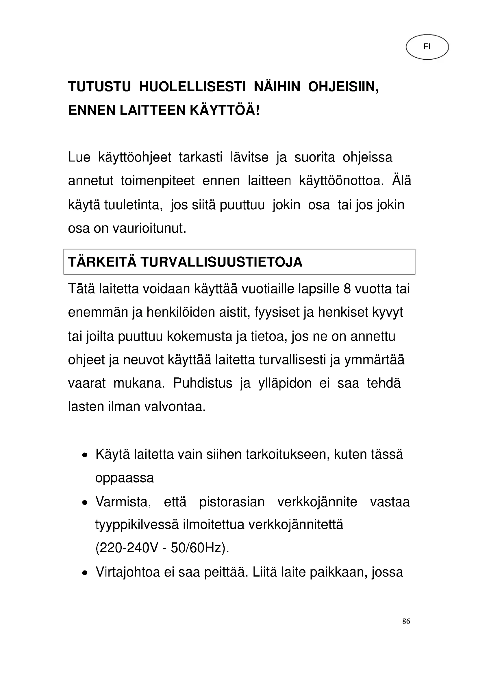 Tätä laitetta voidaan käyttää vuotiaille lapsille 8 vuotta tai enemmän ja henkilöiden aistit, fyysiset ja henkiset kyvyt tai joilta puuttuu kokemusta ja tietoa, jos ne on annettu ohjeet ja neuvot käyttää laitetta turvallisesti ja ymmärtää vaarat mukana. Puhdistus ja ylläpidon ei saa tehdä lasten ilman valvontaa. Käytä laitetta vain siihen tarkoitukseen, kuten tässä oppaassa Varmista, että pistorasian verkkojännite vastaa tyyppikilvessä ilmoitettua verkkojännitettä (220-240V - 50/60Hz). Virtajohtoa ei saa peittää. Liitä laite paikkaan, jossa FI87 kukaan voi kompastua virtajohtoon. Varmista että käyttötilanteessa tukevalle, tasaiselle alustalle Vedä pistoke irti pistorasiasta, kun et käytä enää laitetta. Älä vedä pistoketta irti johdosta, vaan pidä kiinni pistokkeesta. Varmista, ettei tuulettimen lähellä ole esineitä, jotka voivat estää oskilloinnin. Älä laita sormea, kynä tai muiden kohteiden kautta verkkoon, kun laite on toiminnassa. Pidä huolta siitä, ettei laitteen läheisyydessä ole kaihtimia, verhoja, pöytäliinoja, vaatteita, hiuksia tms. Tuulettimen aukko voi imaista ne sisäänsä, mikä voi johtaa loukkaantumisiin tai laitteen vaurioitumiseen. Ota laite toiminnassa, jos johto tai pistoke on vaurioitunut tai ei toimi kunnolla tai on vahingoittunut millään tavalla. Tarkista virtajohto ennen jokaista käyttökertaa halkeamia tai muita merkkejä kulumisesta ja on sen tarkastanut yksikön ja tarvittaessa vaihda virtajohto. Pyydä asiantuntijan tai asianmukaisesti valtuutettu88 edustaja. tuote on tarkoitettu kotikäyttöön ja ei kaupalliseen tai teolliseen käyttöön. Laite, pistoke tai johto ei saa joutua kosketuksiin veden tai vesihöyryn kanssa eikä niiden päälle saa suihkuttaa nestettä. Älä käytä laitetta ammeen, suihkun, uima-altaan tai pesutilojen läheisyydessä. Vältä suoraa auringonvaloa, älä käytä laitetetta ikkunan vieressä. Älä käytä laitetta yhdessä muiden puolijohdin-kierroslukusäädinten kanssa (mm. himmennin). Tuulettimen pitää olla pystyasennossa käytön aikana, sitä ei saa koskaan käyttää kyljellään. Ota laitteen läheisyydessä räjähtäviä tai palavia kaasuja toiminnassa Irrota yksikkö ennen puhdistusta pistorasiasta Jos verkkokaapeli on vaurioitunut, saa sen korjauttaa vain valmistajalla, asiakaspalvelussa tai muulla vastaavalla ammattihenkilöllä.89