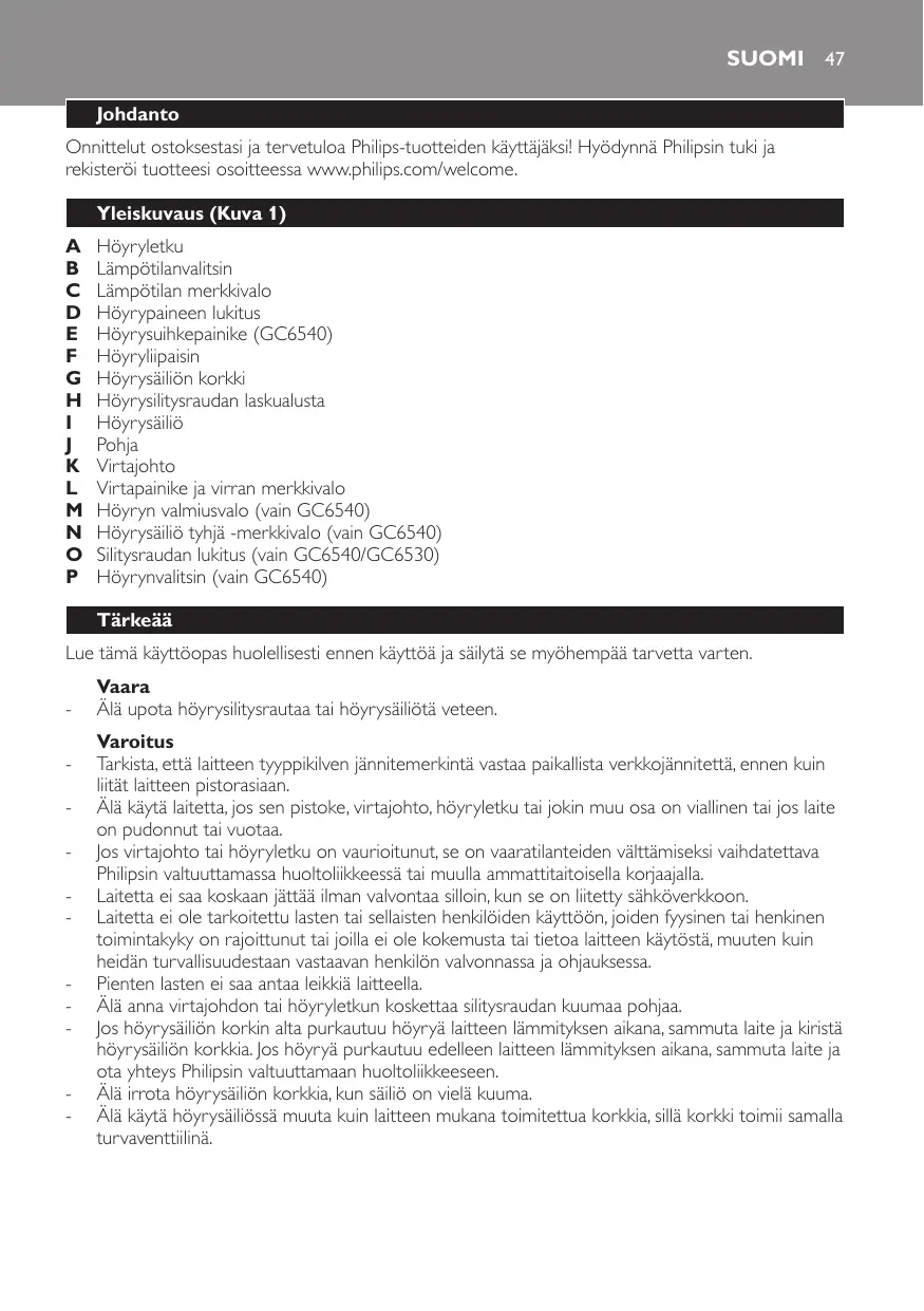 Téléchargez la notice de votre Silitysrauta au format PDF gratuitement ! Retrouvez votre notice GC-6510 - PHILIPS et reprennez votre appareil électronique en main. Sur cette page sont publiés tous les documents nécessaires à l'utilisation de votre appareil GC-6510 de la marque PHILIPS.