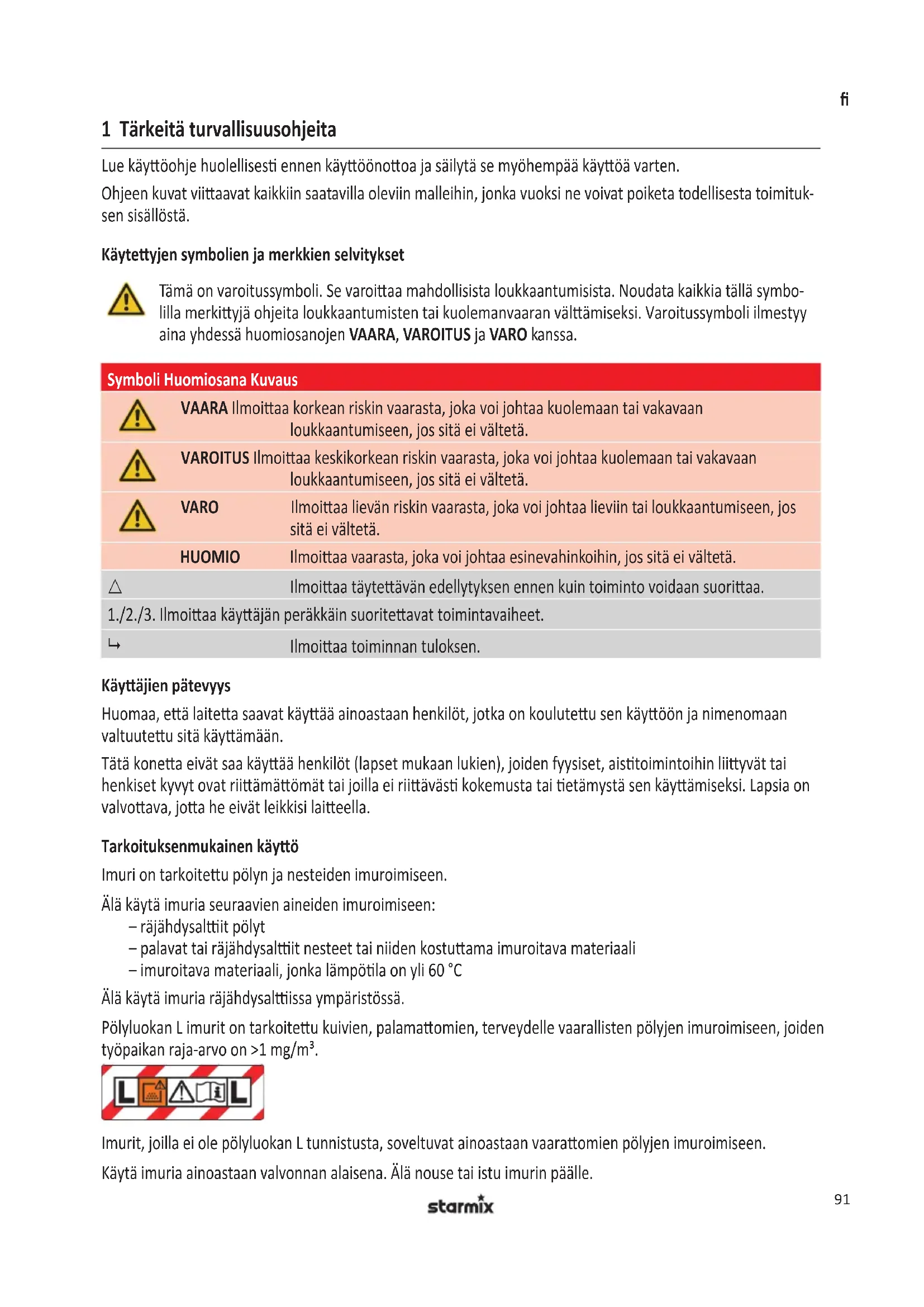 Polyluokan L imurit on tarkoitettu kuvien, palamattomien, terveydelle vaarallisten polyjen imuroimiseen, joiden tyopaikan raja-arvo on >1mg / m^3