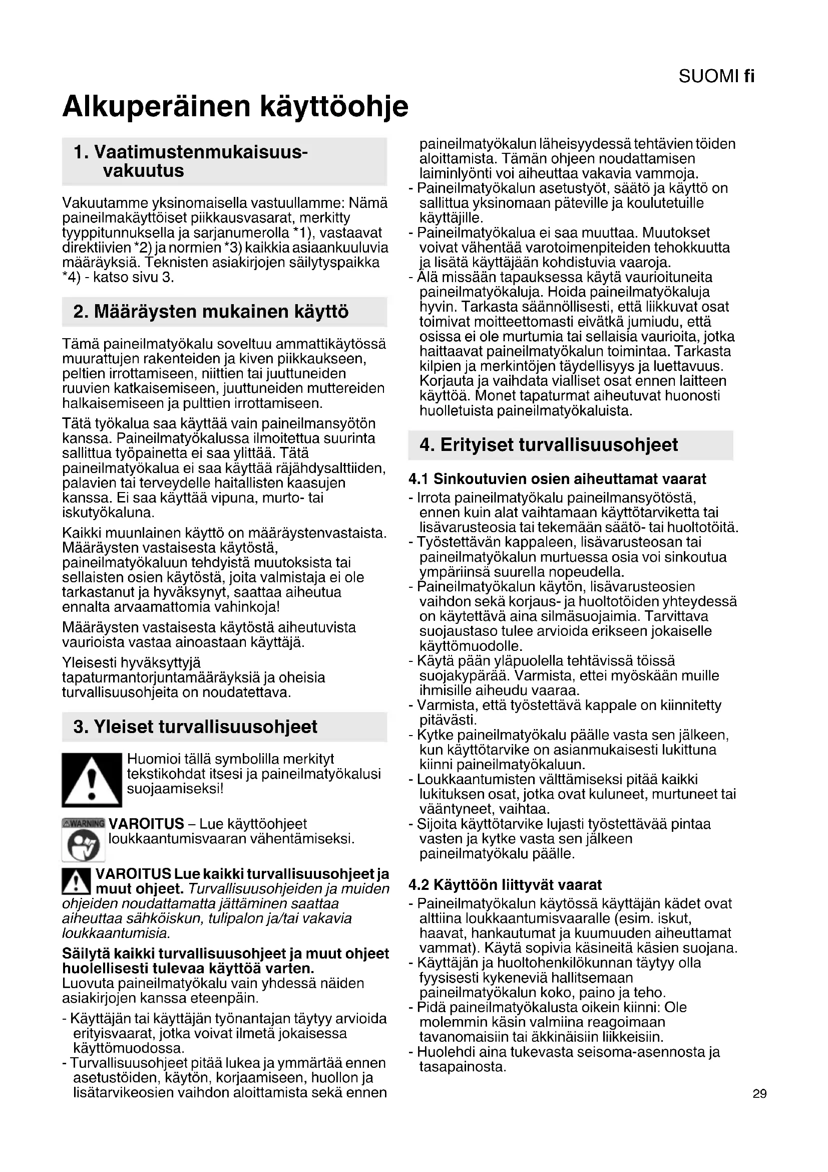 Alkuperäinen käyttöohje Vakuutamme yksinomaisella vastuullamme: Nämä paineilmakäyttöiset piikkausvasarat, merkitty tyyppitunnuksella ja sarjanumerolla *1), vastaavat direktiivien *2) ja normien *3) kaikkia asiaankuuluvia määräyksiä. Teknisten asiakirjojen säilytyspaikka *4) - katso sivu 3. Tämä paineilmatyökalu soveltuu ammattikäytössä muurattujen rakenteiden ja kiven piikkaukseen, peltien irrottamiseen, niittien tai juuttuneiden ruuvien katkaisemiseen, juuttuneiden muttereiden halkaisemiseen ja pulttien irrottamiseen. Tätä työkalua saa käyttää vain paineilmansyötön kanssa. Paineilmatyökalussa ilmoitettua suurinta sallittua työpainetta ei saa ylittää. Tätä paineilmatyökalua ei saa käyttää räjähdysalttiiden, palavien tai terveydelle haitallisten kaasujen kanssa. Ei saa käyttää vipuna, murto- tai iskutyökaluna. Kaikki muunlainen käyttö on määräystenvastaista. Määräysten vastaisesta käytöstä, paineilmatyökaluun tehdyistä muutoksista tai sellaisten osien käytöstä, joita valmistaja ei ole tarkastanut ja hyväksynyt, saattaa aiheutua ennalta arvaamattomia vahinkoja! Määräysten vastaisesta käytöstä aiheutuvista vaurioista vastaa ainoastaan käyttäjä. Yleisesti hyväksyttyjä tapaturmantorjuntamääräyksiä ja oheisia turvallisuusohjeita on noudatettava. Huomioi tällä symbolilla merkityt tekstikohdat itsesi ja paineilmatyökalusi suojaamiseksi! VAROITUS – Lue käyttöohjeet loukkaantumisvaaran vähentämiseksi. VAROITUS Lue kaikki turvallisuusohjeet ja muut ohjeet. Turvallisuusohjeiden ja muiden ohjeiden noudattamatta jättäminen saattaa aiheuttaa sähköiskun, tulipalon ja/tai vakavia loukkaantumisia. Säilytä kaikki turvallisuusohjeet ja muut ohjeet huolellisesti tulevaa käyttöä varten. Luovuta paineilmatyökalu vain yhdessä näiden asiakirjojen kanssa eteenpäin. - Käyttäjän tai käyttäjän työnantajan täytyy arvioida erityisvaarat, jotka voivat ilmetä jokaisessa käyttömuodossa. - Turvallisuusohjeet pitää lukea ja ymmärtää ennen asetustöiden, käytön, korjaamiseen, huollon ja lisätarvikeosien vaihdon aloittamista sekä ennen paineilmatyökalun läheisyydessä tehtävien töiden aloittamista. Tämän ohjeen noudattamisen laiminlyönti voi aiheuttaa vakavia vammoja. - Paineilmatyökalun asetustyöt, säätö ja käyttö on sallittua yksinomaan päteville ja koulutetuille käyttäjille. - Paineilmatyökalua ei saa muuttaa. Muutokset voivat vähentää varotoimenpiteiden tehokkuutta ja lisätä käyttäjään kohdistuvia vaaroja. - Älä missään tapauksessa käytä vaurioituneita paineilmatyökaluja. Hoida paineilmatyökaluja hyvin. Tarkasta säännöllisesti, että liikkuvat osat toimivat moitteettomasti eivätkä jumiudu, että osissa ei ole murtumia tai sellaisia vaurioita, jotka haittaavat paineilmatyökalun toimintaa. Tarkasta kilpien ja merkintöjen täydellisyys ja luettavuus. Korjauta ja vaihdata vialliset osat ennen laitteen käyttöä. Monet tapaturmat aiheutuvat huonosti huolletuista paineilmatyökaluista.