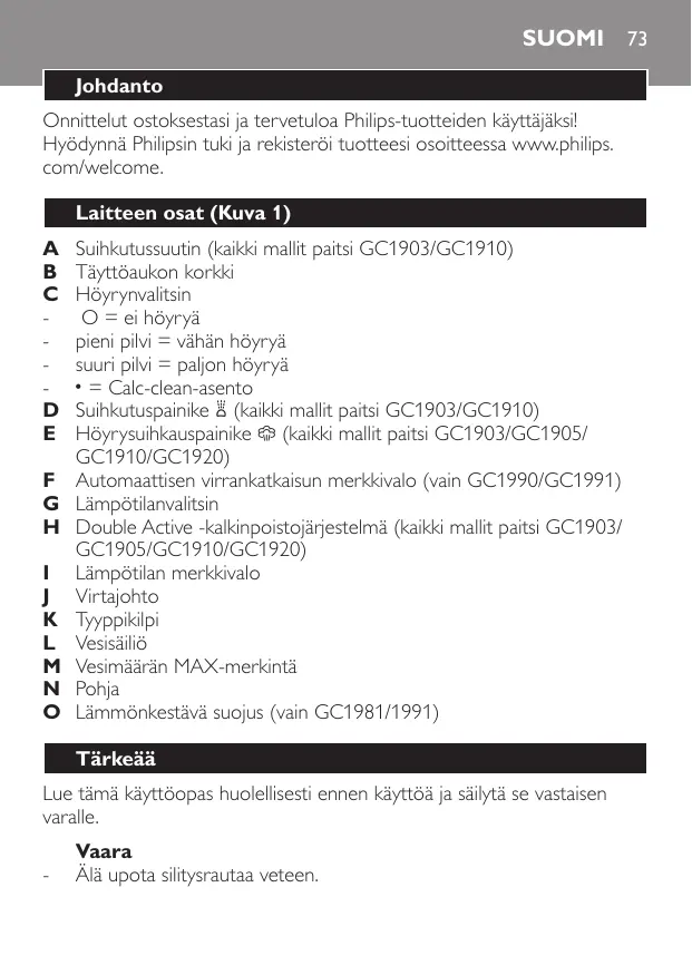 Téléchargez la notice de votre Silitysrauta au format PDF gratuitement ! Retrouvez votre notice GC1910/02 - PHILIPS et reprennez votre appareil électronique en main. Sur cette page sont publiés tous les documents nécessaires à l'utilisation de votre appareil GC1910/02 de la marque PHILIPS.
