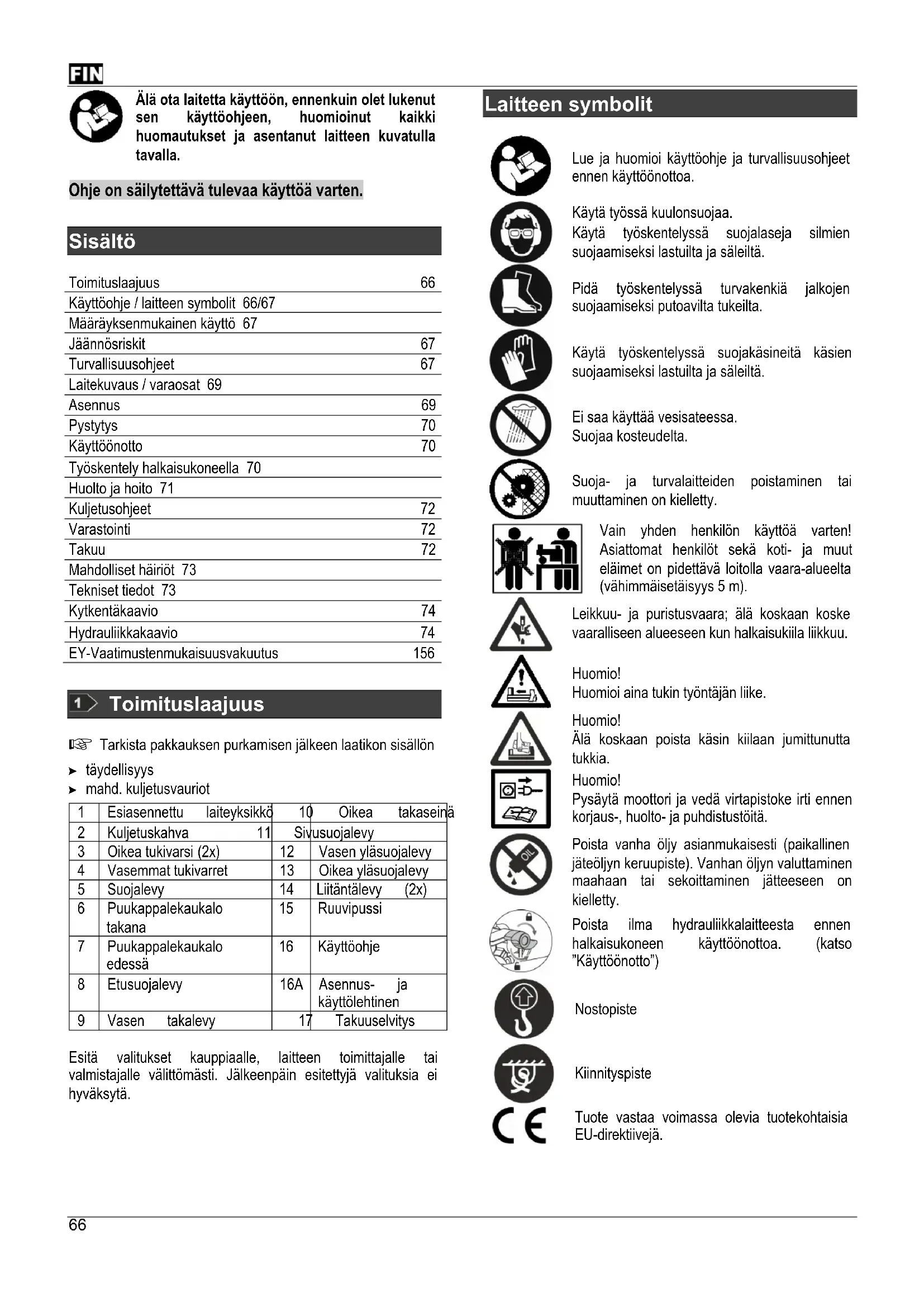 Sisältö Toimituslaajuus 66 Käyttöohje / laitteen symbolit 66/67 Määräyksenmukainen käyttö 67 Jäännösriskit 67 Turvallisuusohjeet 67 Laitekuvaus / varaosat 69 Asennus 69 Pystytys 70 Käyttöönotto 70 Työskentely halkaisukoneella 70 Huolto ja hoito 71 Kuljetusohjeet 72 Varastointi 72 Takuu 72 Mahdolliset häiriöt 73 Tekniset tiedot 73 Kytkentäkaavio 74 Hydrauliikkakaavio 74 EY-Vaatimustenmukaisuusvakuutus 156