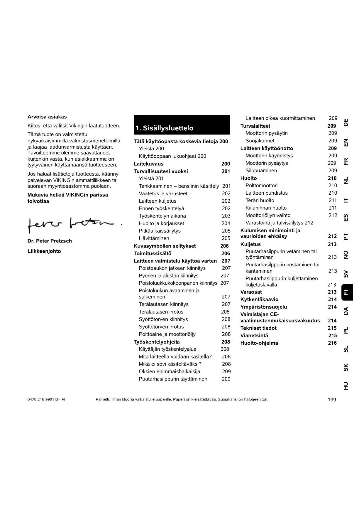 DEENFRNLITESPTNOSVDAPLSLSKHU FI 0478 216 9901 B - FI Painettu ilman klooria valkaistulle paperille. Paperi on kierrätettävää. Suojakansi on halogeeniton. Arvoisa asiakas Kiitos, että valitsit Vikingin laatutuotteen. Tämä tuote on valmistettu nykyaikaisimmilla valmistusmenetelmillä ja laajaa laadunvarmistusta käyttäen. Tavoitteemme olemme saavuttaneet kuitenkin vasta, kun asiakkaamme on tyytyväinen käyttämäänsä tuotteeseen. Jos haluat lisätietoja tuotteesta, käänny palvelevan VIKINGin ammattiliikkeen tai suoraan myyntiosastomme puoleen. Mukavia hetkiä VIKINGin parissa toivottaa Liikkeenjohto
