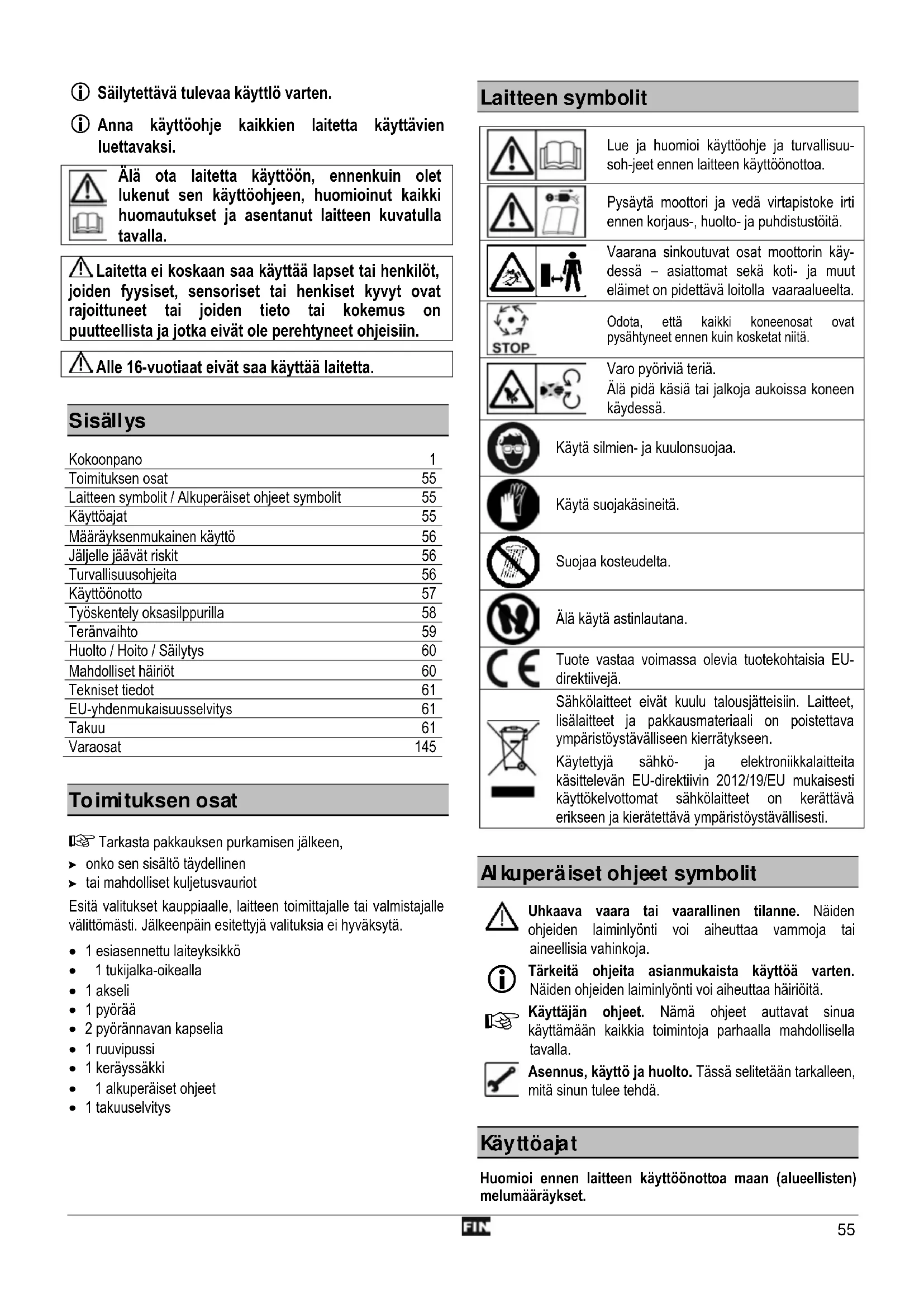 Odota, että kaikki koneenosat ovat pysähtyneet ennen kuin kosketat niitä. Varo pyöriviä teriä. Älä pidä käsiä tai jalkoja aukoissa koneen käydessä. Käytä silmien- ja kuulonsuojaa. Käytä suojakäsineitä. Suojaa kosteudelta. Älä käytä astinlautana. Tuote vastaa voimassa olevia tuotekohtaisia EU- direktiivejä. Sähkölaitteet eivät kuulu talousjätteisiin. Laitteet, lisälaitteet ja pakkausmateriaali on poistettava ympäristöystävälliseen kierrätykseen. Käytettyjä sähkö- ja elektroniikkalaitteita käsittelevän EU-direktiivin 2012/19/EU mukaisesti käy ttökelvottomat sähkölaitteet on kerättävä erikseen ja kierätettävä ympäristöystävällisesti.