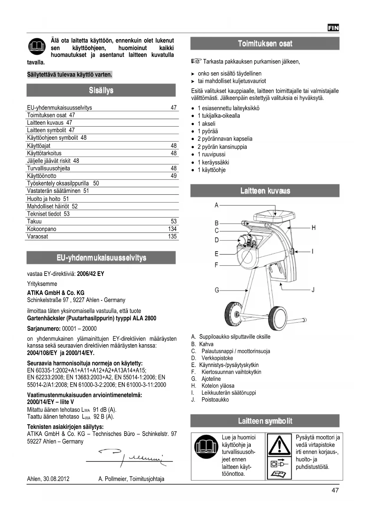 vastaa EY-direktiiviä: 2006/42 EY Yrityksemme ATIKA GmbH & Co. KG Schinkelstraße 97 , 9227 Ahlen - Germany ilmoittaa täten yksinomaisella vastuulla, että tuote Gartenhäcksler (Puutarhasilppurin) tyyppi ALA 2800 Sarjanumero: 00001 – 20000 on yhdenmukainen ylämainittujen EY-direktiivien määräysten kanssa sekä seuraavien direktiivien määräysten kanssa: 2004/108/EY ja 2000/14/EY. Seuraavia harmonisoituja normeja on käytetty: EN 60335-1:2002+A1+A11+A12+A2+A13A14+A15; EN 62233:2008; EN 13683:2003+A2, EN 55014-1:2006; EN 55014-2/A1:2008; EN 61000-3-2:2006; EN 61000-3-11:2000 Vaatimustenmukaisuuden arviointimenetelmä: 2000/14/EY – liite V Mitattu äänen tehotaso L