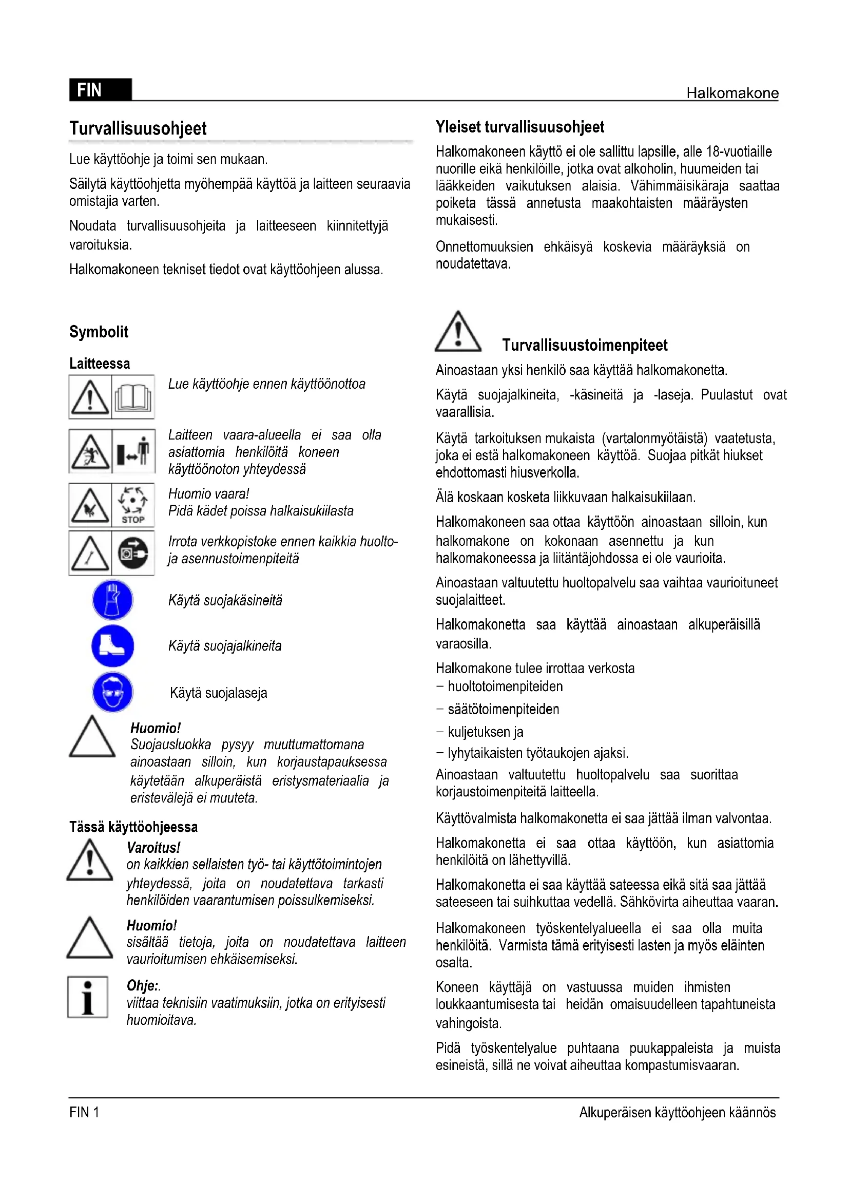 Störningar Vid störningar måste vedklyven stängas av och kopplas bort från elnätet. Störningar som inte kan åtgärdas enligt följande tabell måste åtgärdas av en auktoriserad fackverkstad. Störning Orsak Åtgärd Stockslid kör inte ut/in För lite hydraulolja Fyll på hydraulolja Defekt hydraulpump Byt ut Maskinen står snett lutad i klyvkilens riktning Ställ maskinen vågrätt eller lätt lutad i manöverspakens riktning Stocksliden har ingen kraft För lite hydraulolja Fyll på hydraulolja Maskinen står snett lutad i klyvkilens riktning Ställ maskinen vågrätt eller lätt lutad i manöverspakens riktning Hydraulpumpen visslar; stocksliden rör sig ryckigt För lite hydraulolja Fyll på hydraulolja Maskinen står snett lutad i klyvkilens riktning Ställ maskinen vågrätt eller lätt lutad i manöverspakens riktning Luft i kretsloppet Öppna avluftningsskruven Motorn blir väldigt varm För litet kabeltvärsnitt Använd kabel med större tvärsnitt Motorn startar inte Termobrytaren har slagit till Vänta tills motorn har kylts av Elkontakt eller –uttag defekt Låt professionell elektriker kontrollera Defekt kabel Låt professionell elektriker kontrollera, byt ut Defekt elmotor Låt professionell elektriker kontrollera Miljöskydd, avfallshantering Uttjänta maskiner får inte slängas med hushållssopor! Förpackning, maskin och tillbehör är tillverkade av återvinningsbart material och måste omhändertas därefter. Översättning av orginalbruksanvisning S 5FIN Halkomakone Turvallisuusohjeet Lue käyttöohje ja toimi sen mukaan. Säilytä käyttöohjetta myöhempää käyttöä ja laitteen seuraavia omistajia varten. Noudata turvallisuusohjeita ja laitteeseen kiinnitettyjä varoituksia. Halkomakoneen tekniset tiedot ovat käyttöohjeen alussa. Symbolit Laitteessa Lue käyttöohje ennen käyttöönottoa Laitteen vaara-alueella ei saa olla asiattomia henkilöitä koneen käyttöönoton yhteydessä Huomio vaara! Pidä kädet poissa halkaisukiilasta Irrota verkkopistoke ennen kaikkia huolto- ja asennustoimenpiteitä Käytä suojakäsineitä Käytä suojajalkineita Käytä suojalaseja Huomio! Suojausluokka pysyy muuttumattomana ainoastaan silloin, kun korjaustapauksessa käytetään alkuperäistä eristysmateriaalia ja eristevälejä ei muuteta. Tässä käyttöohjeessa Varoitus! on kaikkien sellaisten työ- tai käyttötoimintojen yhteydessä, joita on noudatettava tarkasti henkilöiden vaarantumisen poissulkemiseksi. Huomio! sisältää tietoja, joita on noudatettava laitteen vaurioitumisen ehkäisemiseksi. Ohje:. viittaa teknisiin vaatimuksiin, jotka on erityisesti huomioitava. Yleiset turvallisuusohjeet Halkomakoneen käyttö ei ole sallittu lapsille, alle 18-vuotiaille nuorille eikä henkilöille, jotka ovat alkoholin, huumeiden tai lääkkeiden vaikutuksen alaisia. Vähimmäisikäraja saattaa poiketa tässä annetusta maakohtaisten määräysten mukaisesti. Onnettomuuksien ehkäisyä koskevia määräyksiä on noudatettava. Turvallisuustoimenpiteet Ainoastaan yksi henkilö saa käyttää halkomakonetta. Käytä suojajalkineita, -käsineitä ja -laseja. Puulastut ovat vaarallisia. Käytä tarkoituksen mukaista (vartalonmyötäistä) vaatetusta, joka ei estä halkomakoneen käyttöä. Suojaa pitkät hiukset ehdottomasti hiusverkolla. Älä koskaan kosketa liikkuvaan halkaisukiilaan. Halkomakoneen saa ottaa käyttöön ainoastaan silloin, kun halkomakone on kokonaan asennettu ja kun halkomakoneessa ja liitäntäjohdossa ei ole vaurioita. Ainoastaan valtuutettu huoltopalvelu saa vaihtaa vaurioituneet suojalaitteet. Halkomakonetta saa käyttää ainoastaan alkuperäisillä varaosilla. Halkomakone tulee irrottaa verkosta − huoltotoimenpiteiden − säätötoimenpiteiden − kuljetuksen ja − lyhytaikaisten työtaukojen ajaksi. Ainoastaan valtuutettu huoltopalvelu saa suorittaa korjaustoimenpiteitä laitteella. Käyttövalmista halkomakonetta ei saa jättää ilman valvontaa. Halkomakonetta ei saa ottaa käyttöön, kun asiattomia henkilöitä on lähettyvillä. Halkomakonetta ei saa käyttää sateessa eikä sitä saa jättää sateeseen tai suihkuttaa vedellä. Sähkövirta aiheuttaa vaaran. Halkomakoneen työskentelyalueella ei saa olla muita henkilöitä. Varmista tämä erityisesti lasten ja myös eläinten osalta. Koneen käyttäjä on vastuussa muiden ihmisten loukkaantumisesta tai heidän omaisuudelleen tapahtuneista vahingoista. Pidä työskentelyalue puhtaana puukappaleista ja muista esineistä, sillä ne voivat aiheuttaa kompastumisvaaran. FIN 1 Alkuperäisen käyttöohjeen käännösHalkomakone FIN Turvalaitteet Moottorin suojakytkin Halkomakoneen ylikuormituttua moottorin suojakytkin kytkee moottorin pois päältä. Moottorin suojakytkimen toimintoa ei saa kytkeä pois päältä. Jos moottorin suojakytkin kytkee halkomakoneen pois päältä, toimi seuraavasti:
